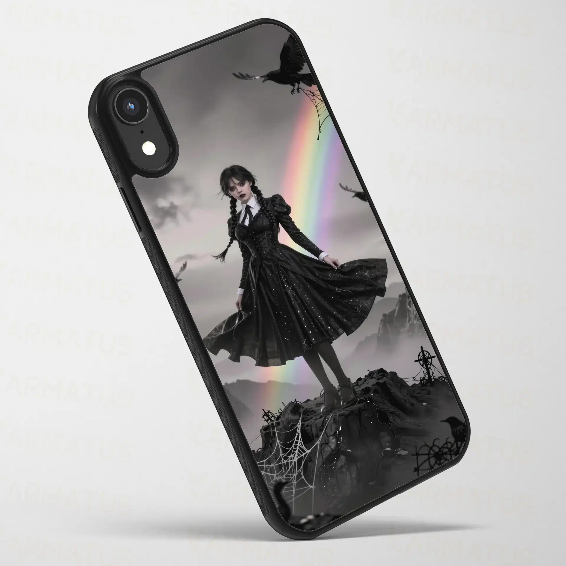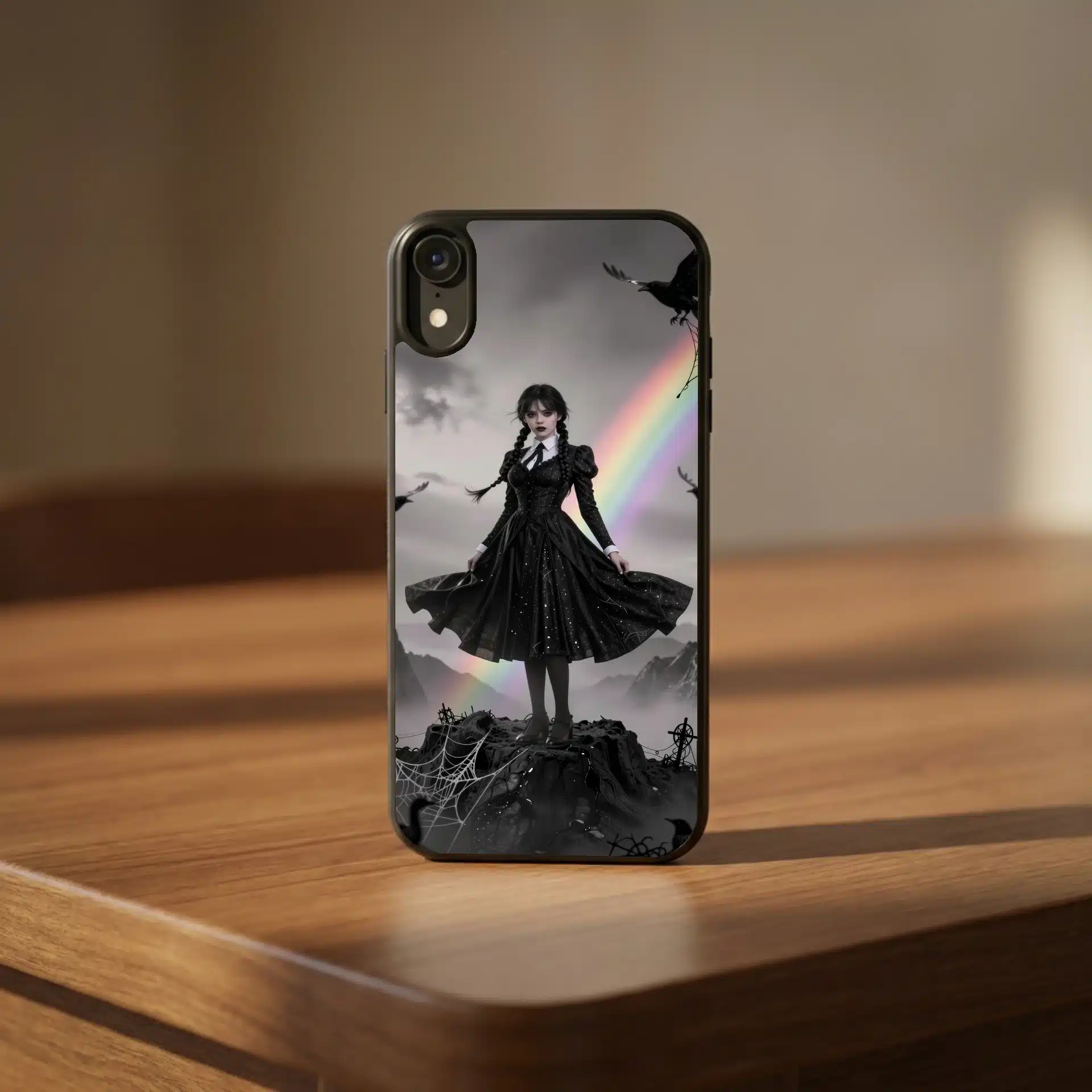 طراحی این تصویر با جزئیات گوتیک مانند تارهای عنکبوت، کلاغهای در حال پرواز و مههای اسرارآمیز، همراه با نورپردازی سینمایی و ترکیب رنگهای خاکی کمرنگ و سایههای پاستلی، اثری خیرهکننده و مناسب برای والپیپرهای ویروسی خلق کرده است.