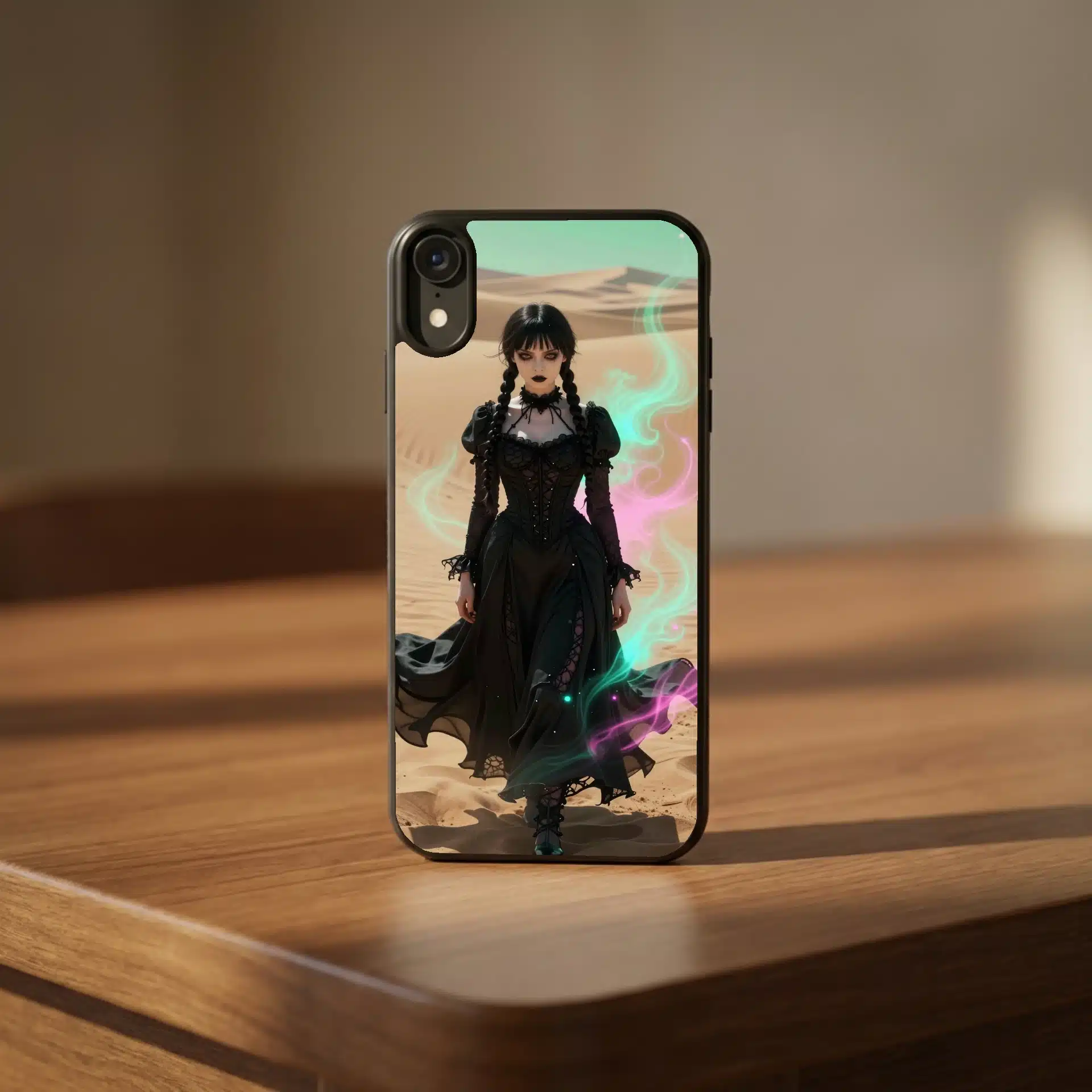 ونزدی آدامز در این تصویر خیرهکننده، با لباس سیاه نمادین خود در میان بیابانی بیپایان ایستاده است. نور شدید و جهتدار، چهرهی رنگپریده و نگاه نافذ او را برجسته میکند، در حالی که تافتههای بافتهاش در تضاد با تپههای شنی طلایی قرار گرفتهاند.