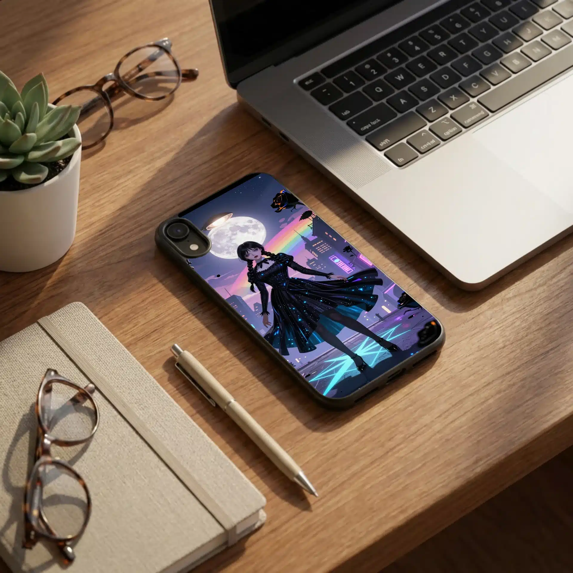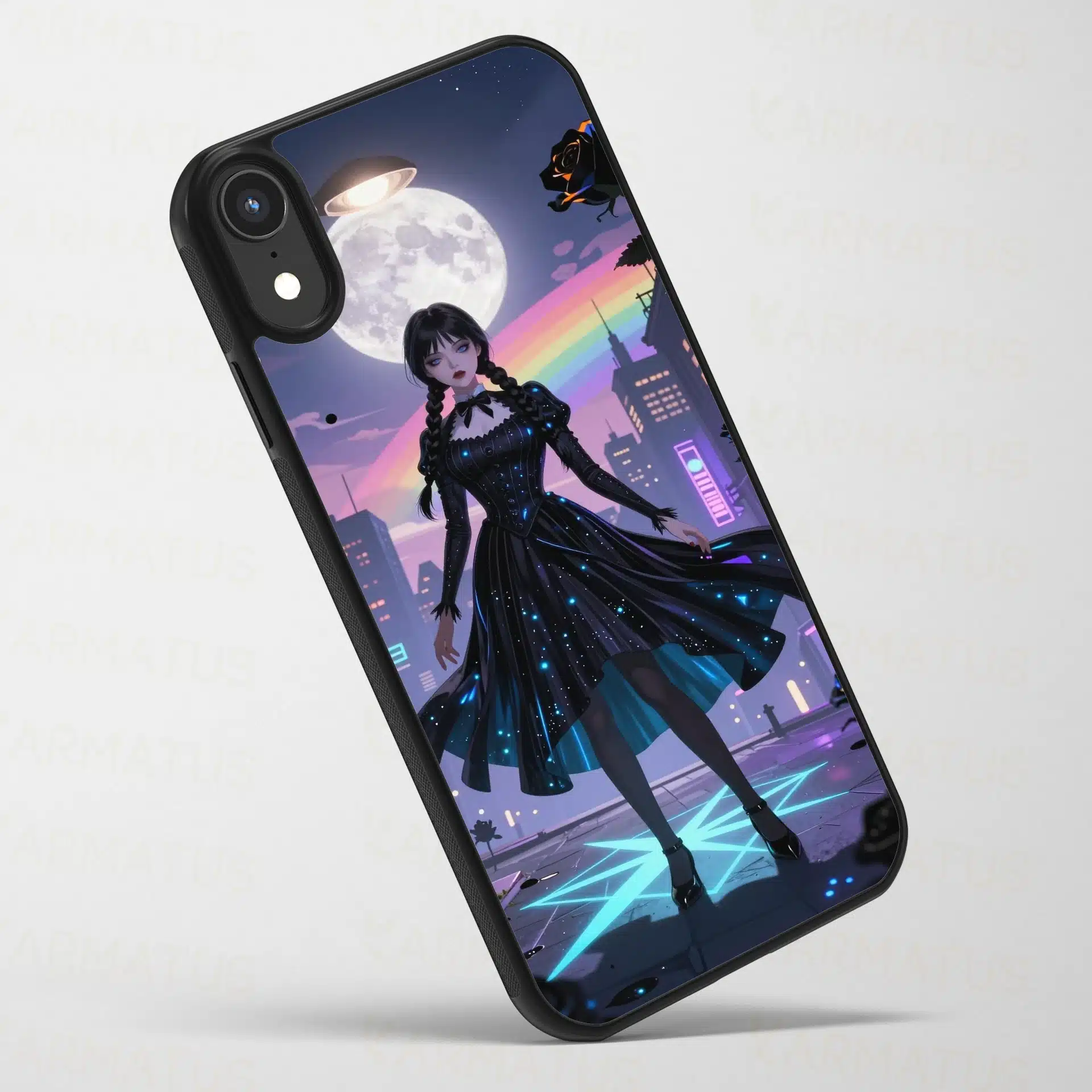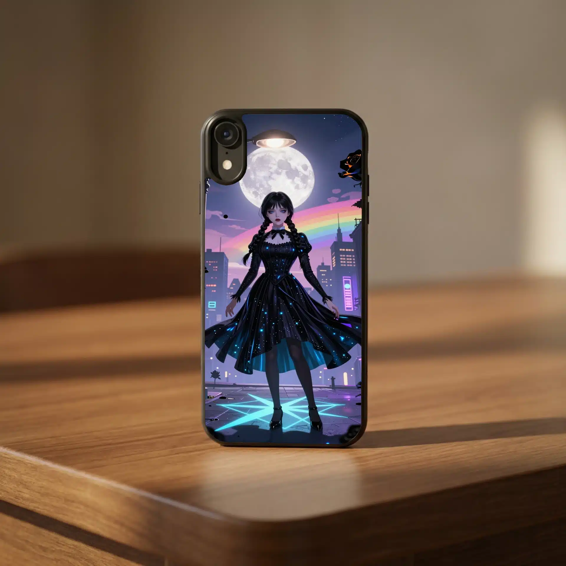 این قاب موبایل با الهام از شخصیت محبوب ‘ونزدی آدامز’ طراحی شده است. تصویری رویایی از ونزدی در یک شب شهری پر از نورهای نئون و رنگهای پاستلی، که ترکیبی جذاب از تاریکی و روشنایی را به نمایش میگذارد.