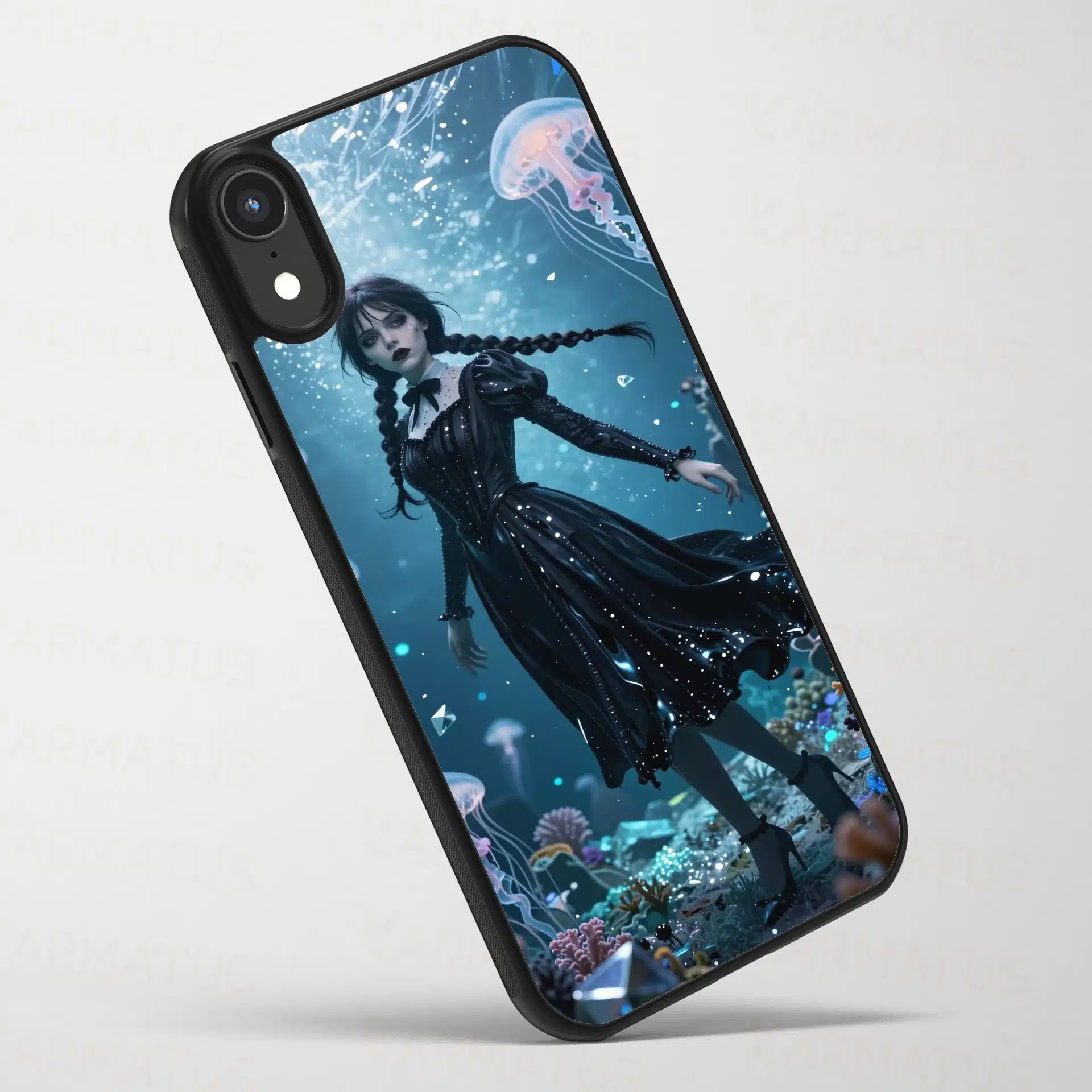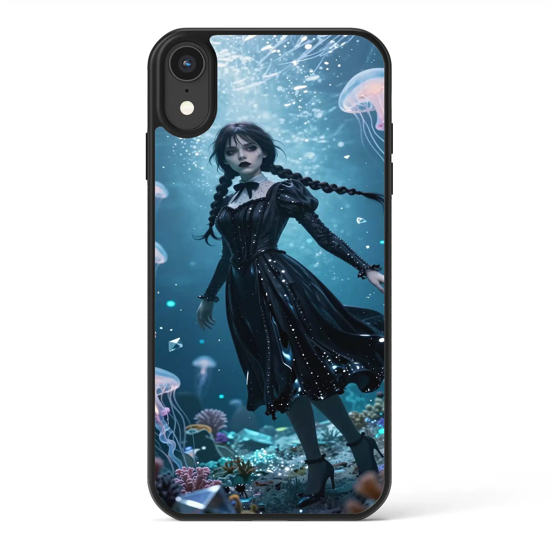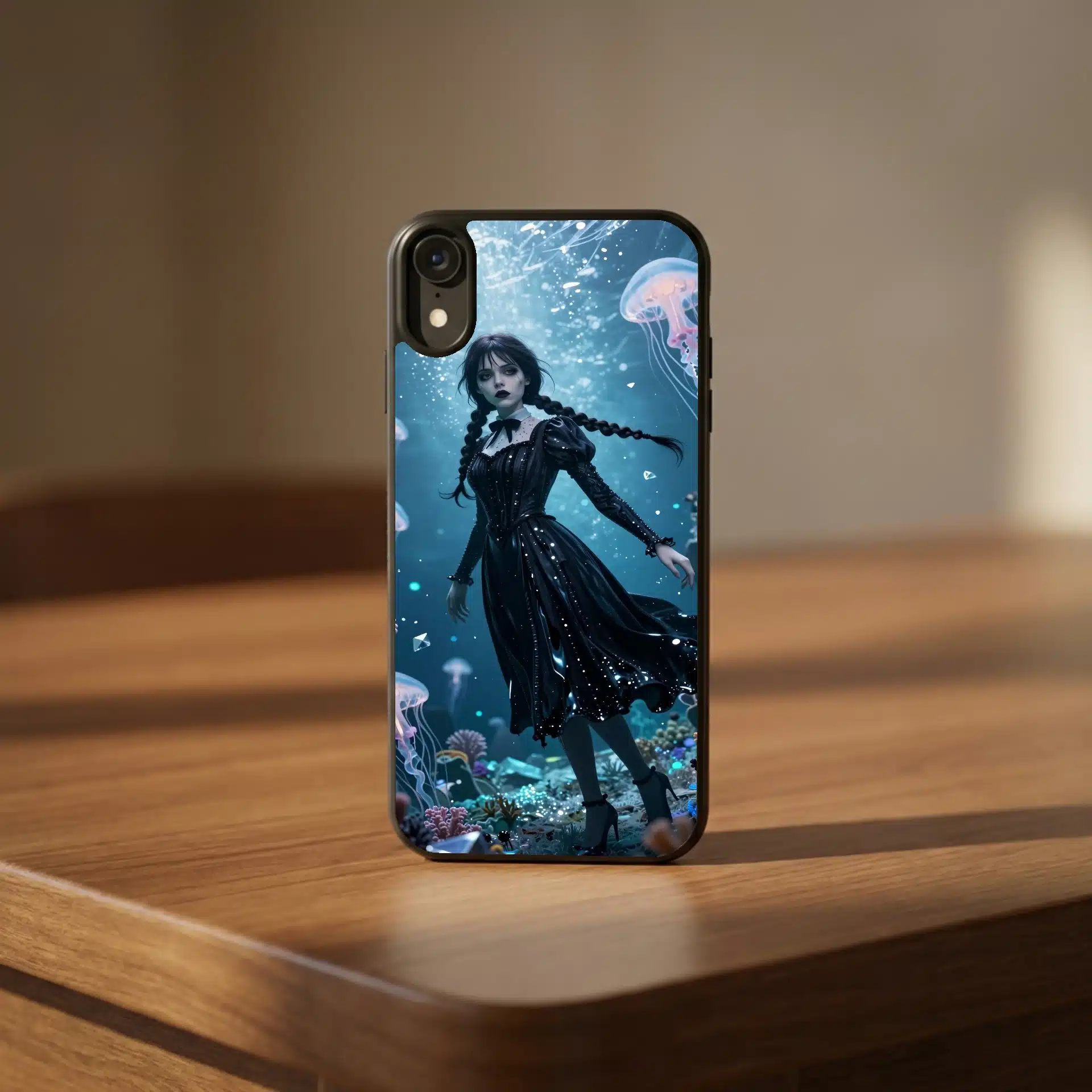 والپیپر انیمهای استادانه از ونزدی آدامز در یک منظره زیرآبی قطبی، با لباس سیاه نمادینش که مانند جوهر مایع در جریانهای فیروزهای و نقرهای شناور است. این اثر با جزئیات بالا و پرسپکتیو تیلت-شیفت، او را به عنوان یک فیگور مینیاتوری در میان مرجانهای درخشان و عروسهای دریایی زیستتاب نشان میدهد.