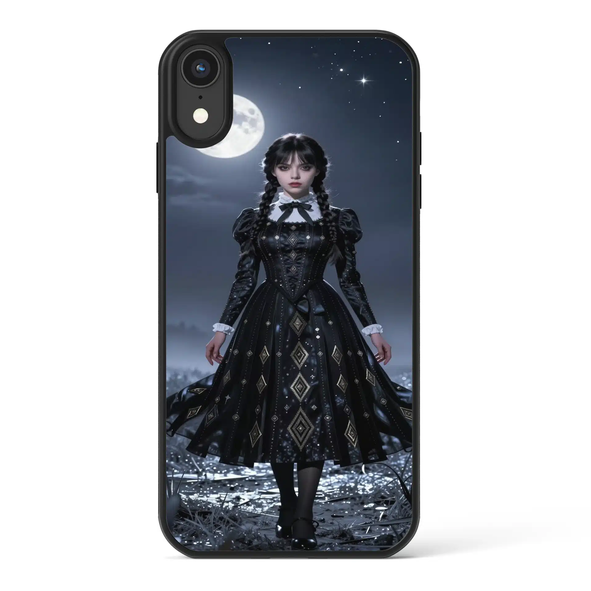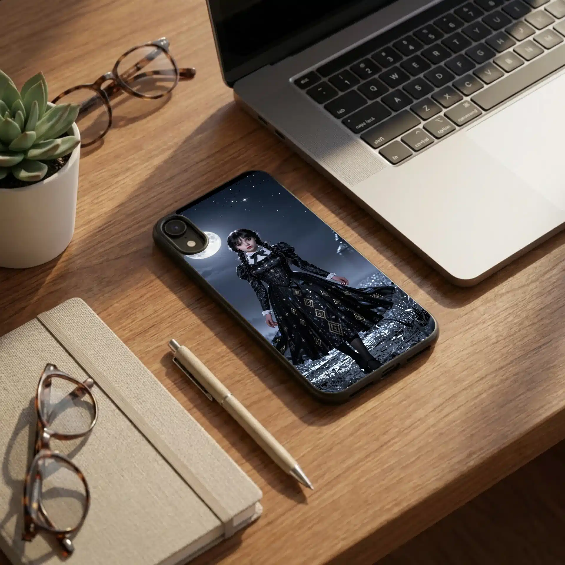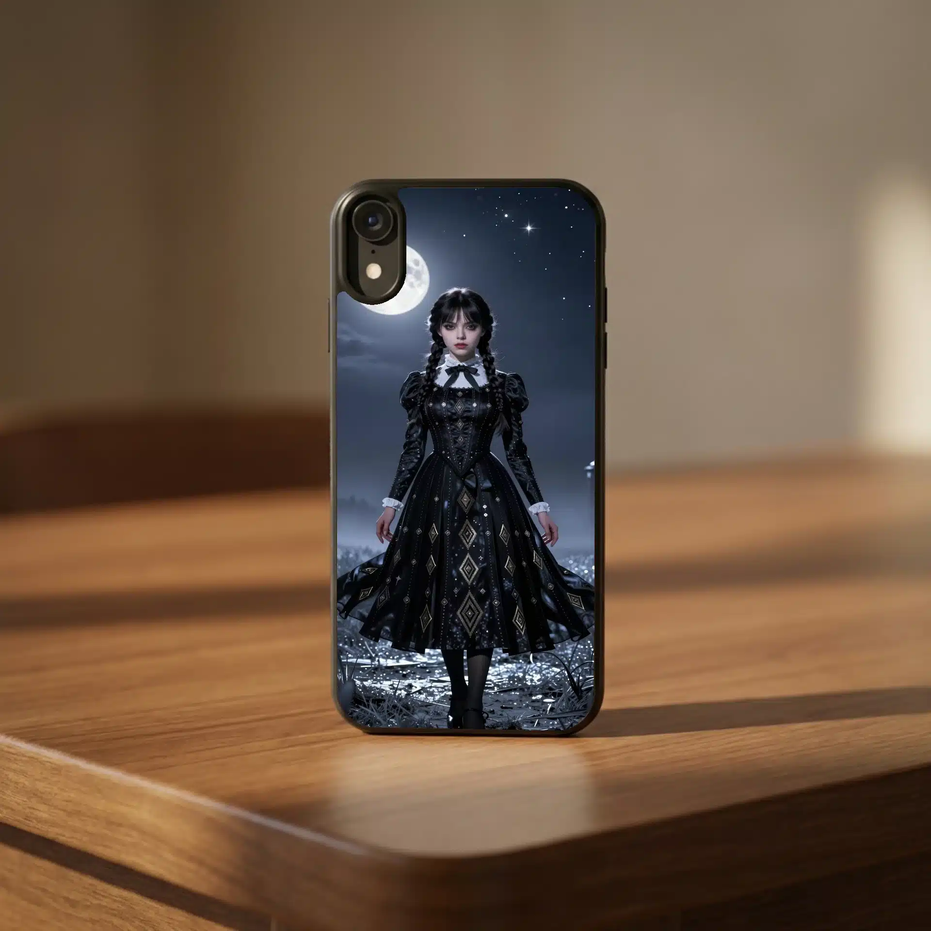 والپیپر انیمهای خیرهکننده از ونزدی آدامز در یک منظره نقرهای زیر نور ماه، با لباس سیاه نمادینش که طرحهای هندسی پیچیدهای در پارچه آن بافته شده است. این صحنه یک دشت وسیع و مهآلود زیر آسمانی پرستاره را به تصویر میکشد که با ماههای فلورسنت سرد روشن شده و سایههای دراماتیک ایجاد میکند.