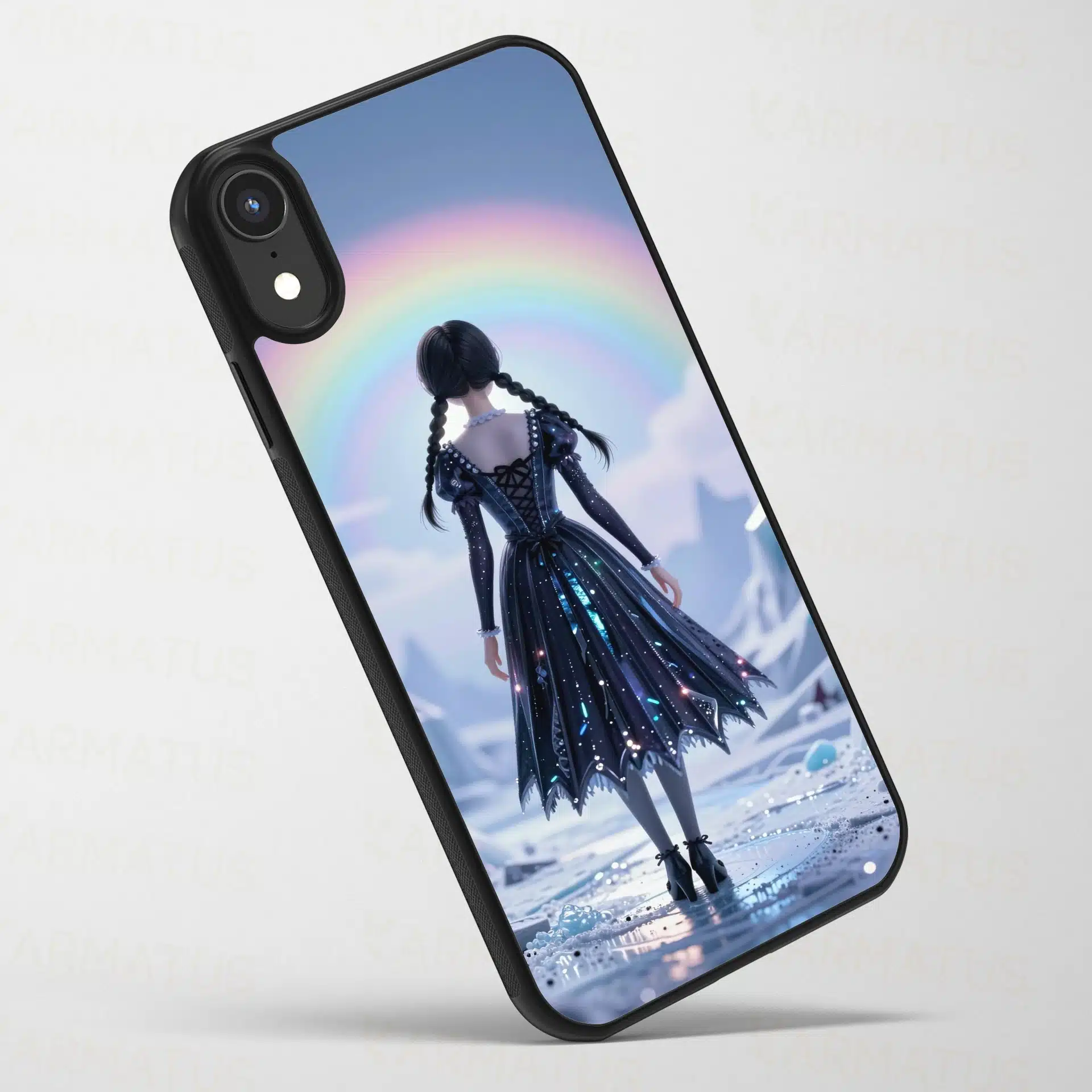 ونزدی آدامز در یک منظره مینیاتوری خیرهکننده به سبک انیمه، به عنوان یک سیلوئت چشمنواز در برابر آسمانی رنگینکمانی و سرد قطبی ایستاده است. نورپردازی حجمدار، هالهای رویایی در اطراف او ایجاد کرده و بازتابهای نور بر روی زمین یخی میدرخشد.