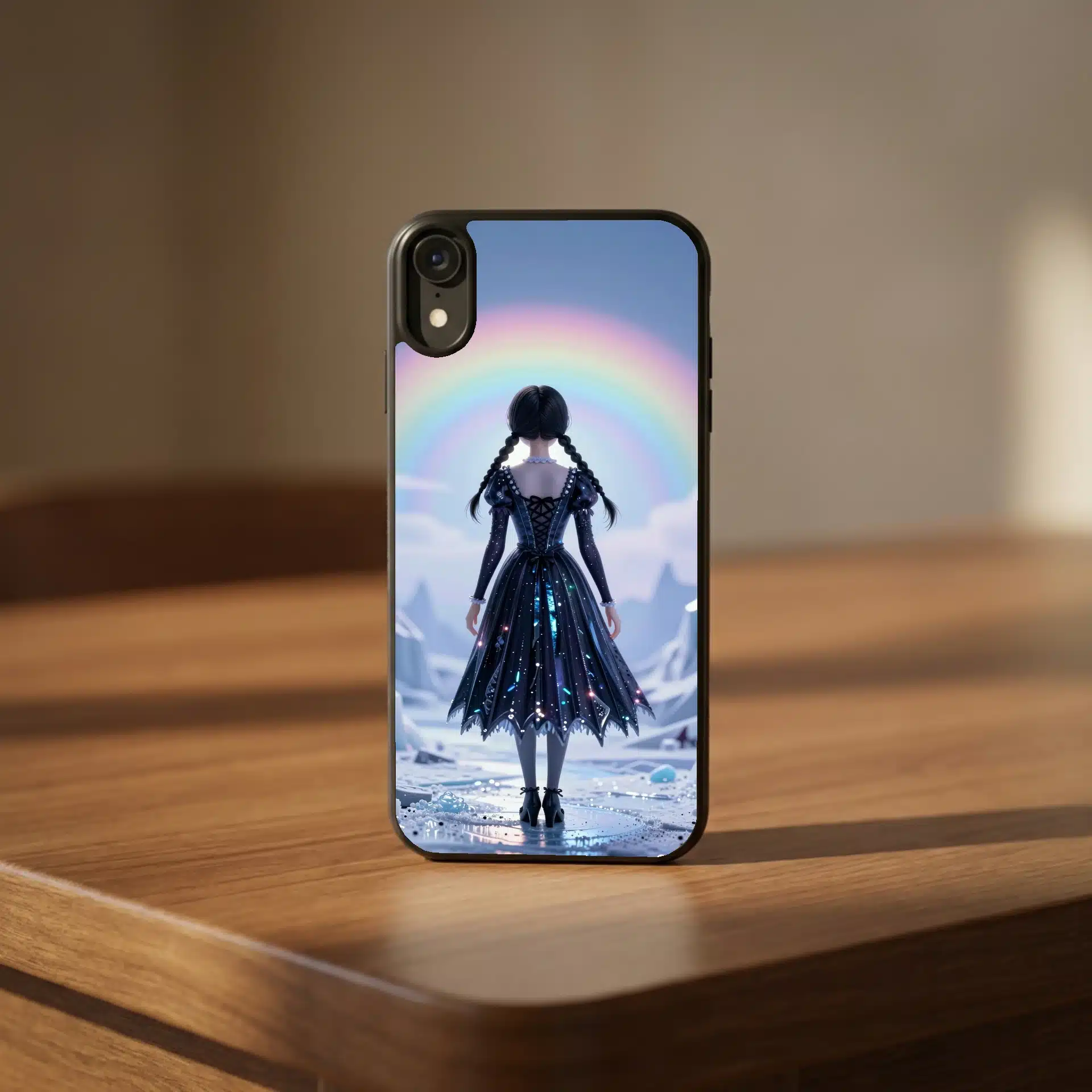 طرح شامل موهای بافتهی نمادین و لباس گوتیک او با هایلایتهای آبی-یخی و نقرهای است که ترکیبی از ظرافت ترسناک و سوررئالیسم رویایی را به نمایش میگذارد.