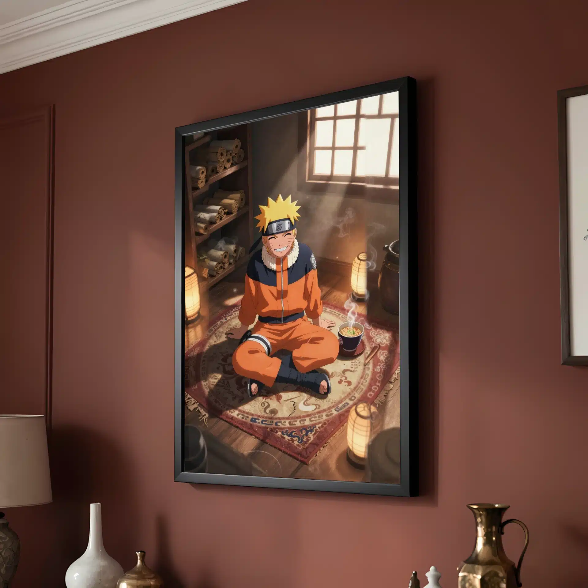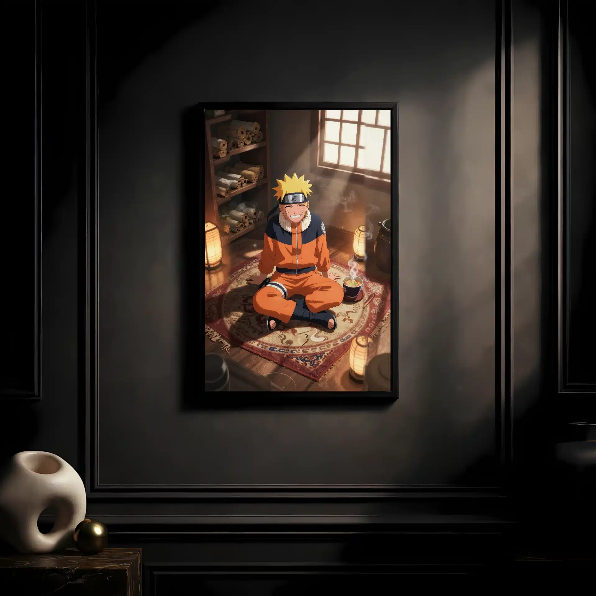 طرح این قاب عکس با نورپردازی کنتراست بالا، رنگ نارنجی درخشان لباس ناروتو و موهای بلوند خاردار او را برجسته میکند. قفسههای پر از طومار، فانوسهای روشن و یک کاسه رامن داغ در کنار او، فضایی گرم و زنده را خلق کردهاند.