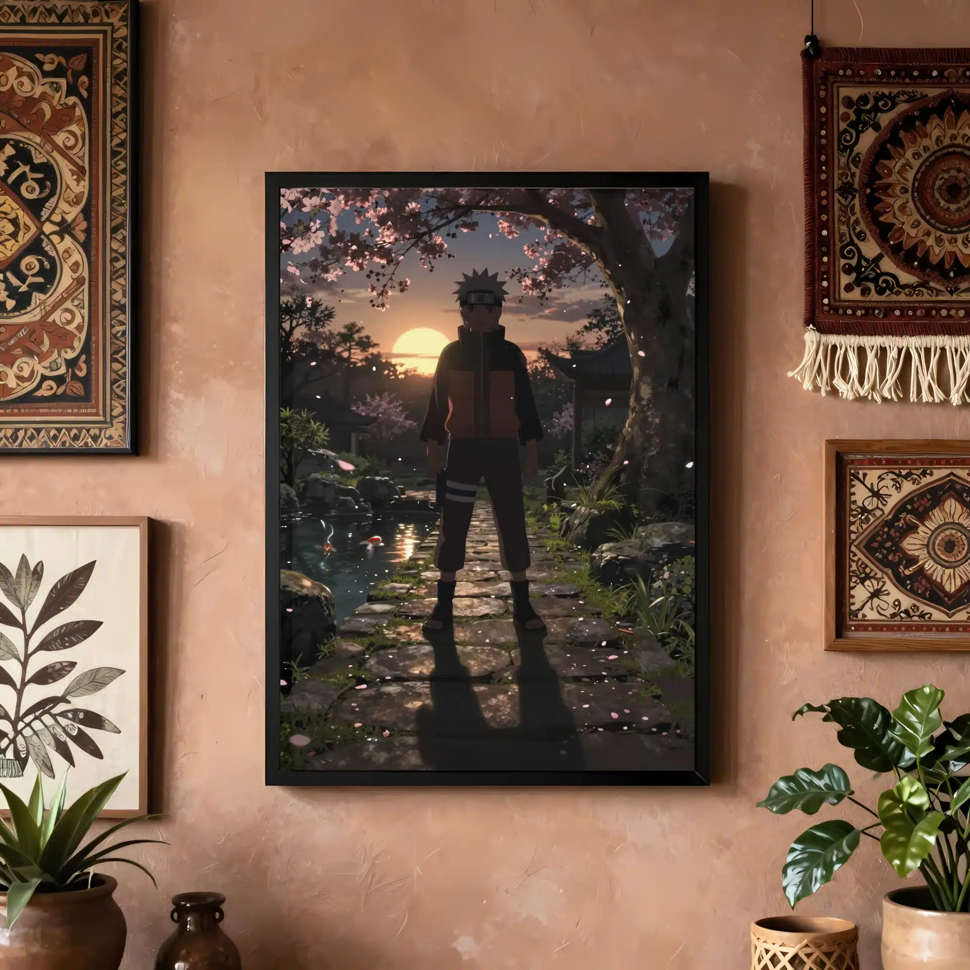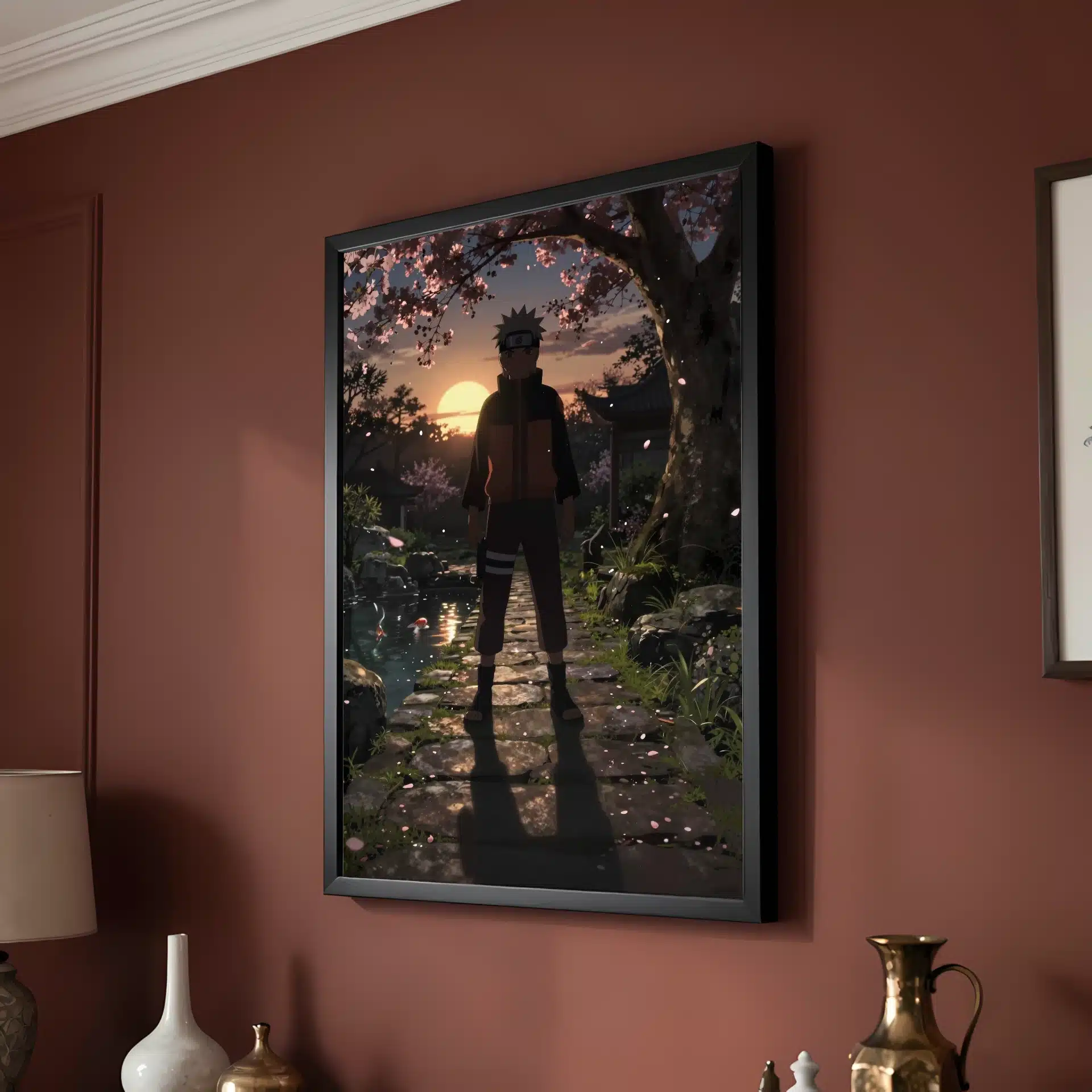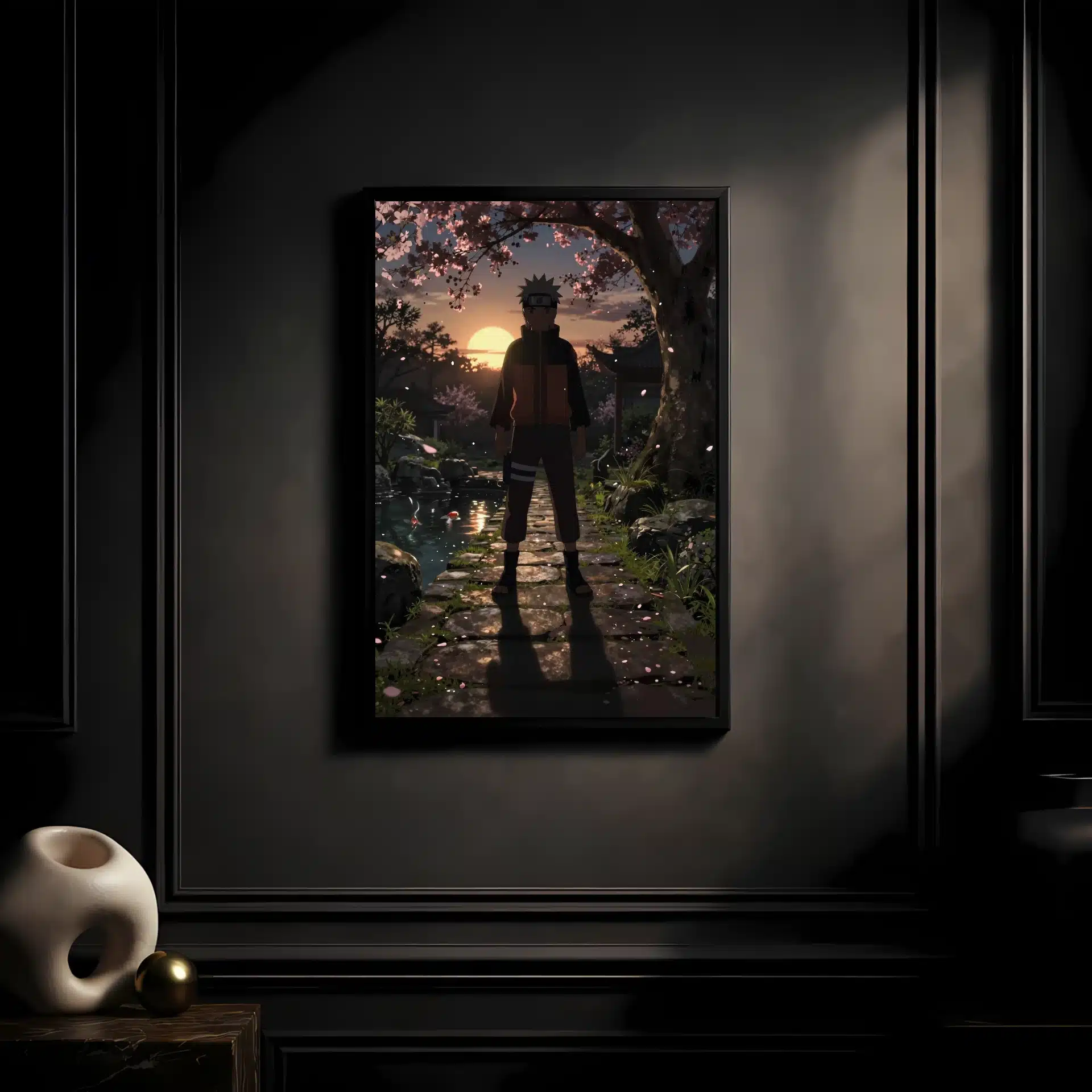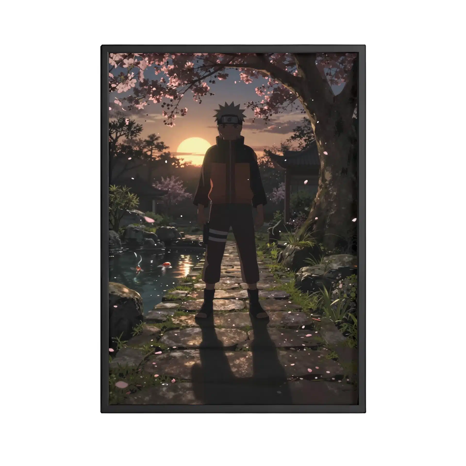 طرح این قاب عکس با جزئیاتی مانند گلهای گیلاس شناور در هوا، انعکاس نور بر سطح حوض کوی و سایههای کشیده بر روی مسیر سنگی، عمق و حالوهوایی سینمایی به تصویر بخشیده است. درخشش کمرنگ چاکرا در نوک انگشتان ناروتو نیز بر جذابیت این صحنه افزوده.