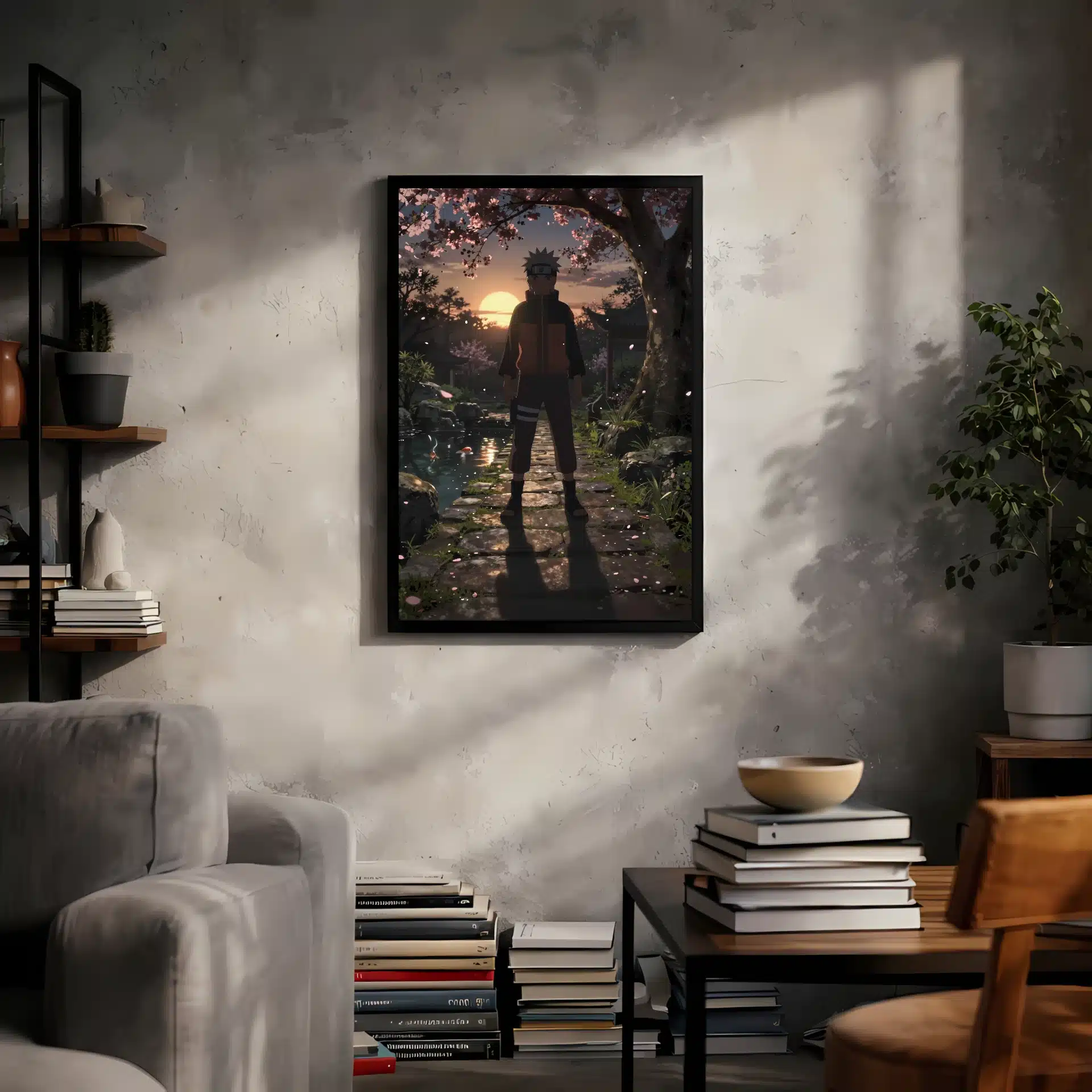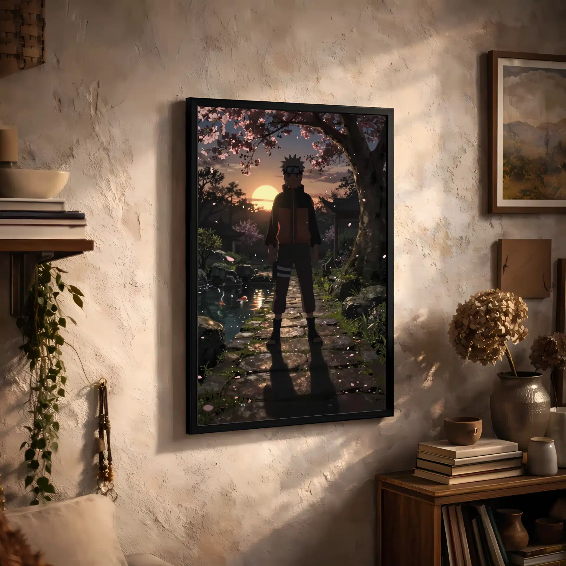 در این قاب عکس خیرهکننده، ناروتو در باغی اسرارآمیز و در نور طلایی غروب خورشید ایستاده است. سایهاش بهصورت دراماتیک در پسزمینه نمایان شده و حالتی مصمم در چهرهاش دیده میشود، گویی آماده نبردی بزرگ است.