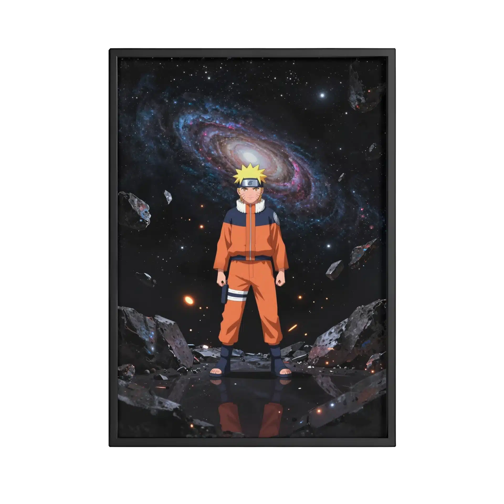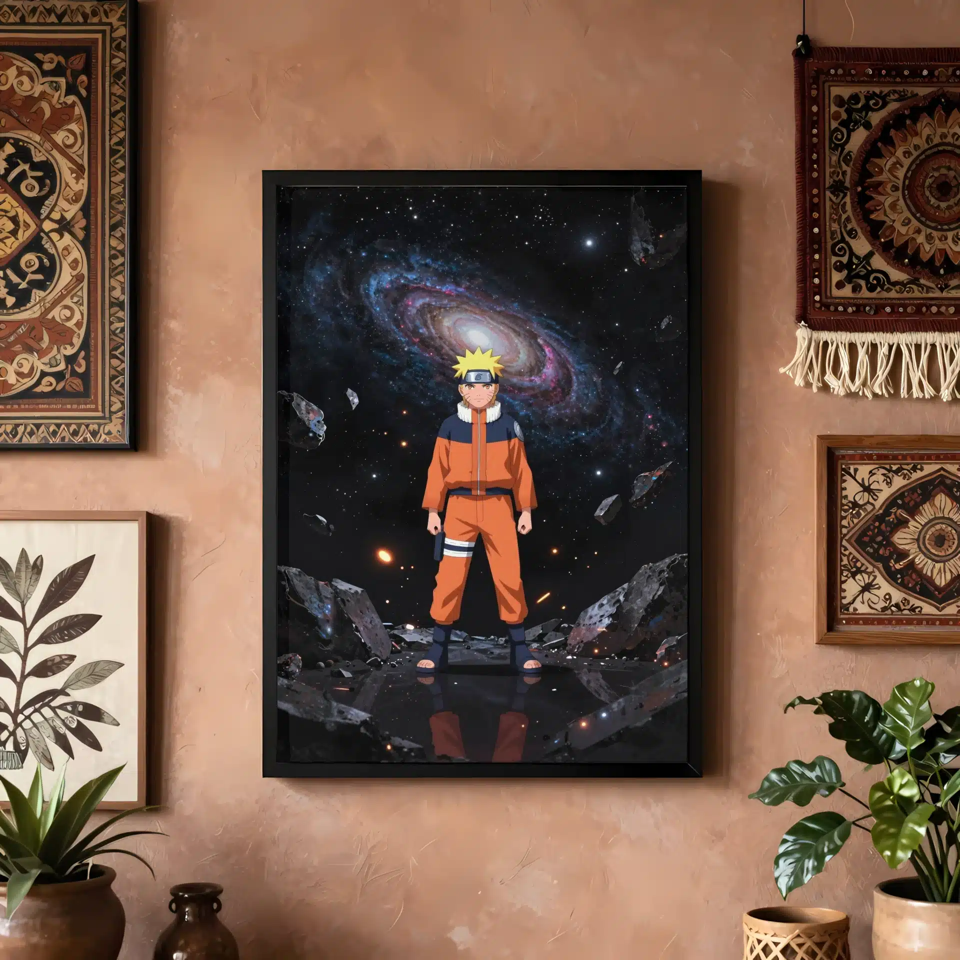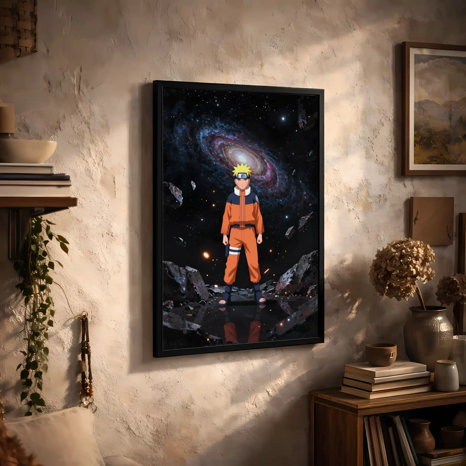 طرح این قاب عکس با زاویه دید گسترده، وسعت بینهایت فضا را به تصویر میکشد و حضور کوچک اما مصمم ناروتو را در برابر کهکشانهای چرخان و سحابیهای درخشان برجسته میسازد. رندرینگ انیمهای به حالت پویای او انرژی میبخشد و جرقههای چاکرا مانند کرمهای شبتاب کیهانی در اطرافش میدرخشند.