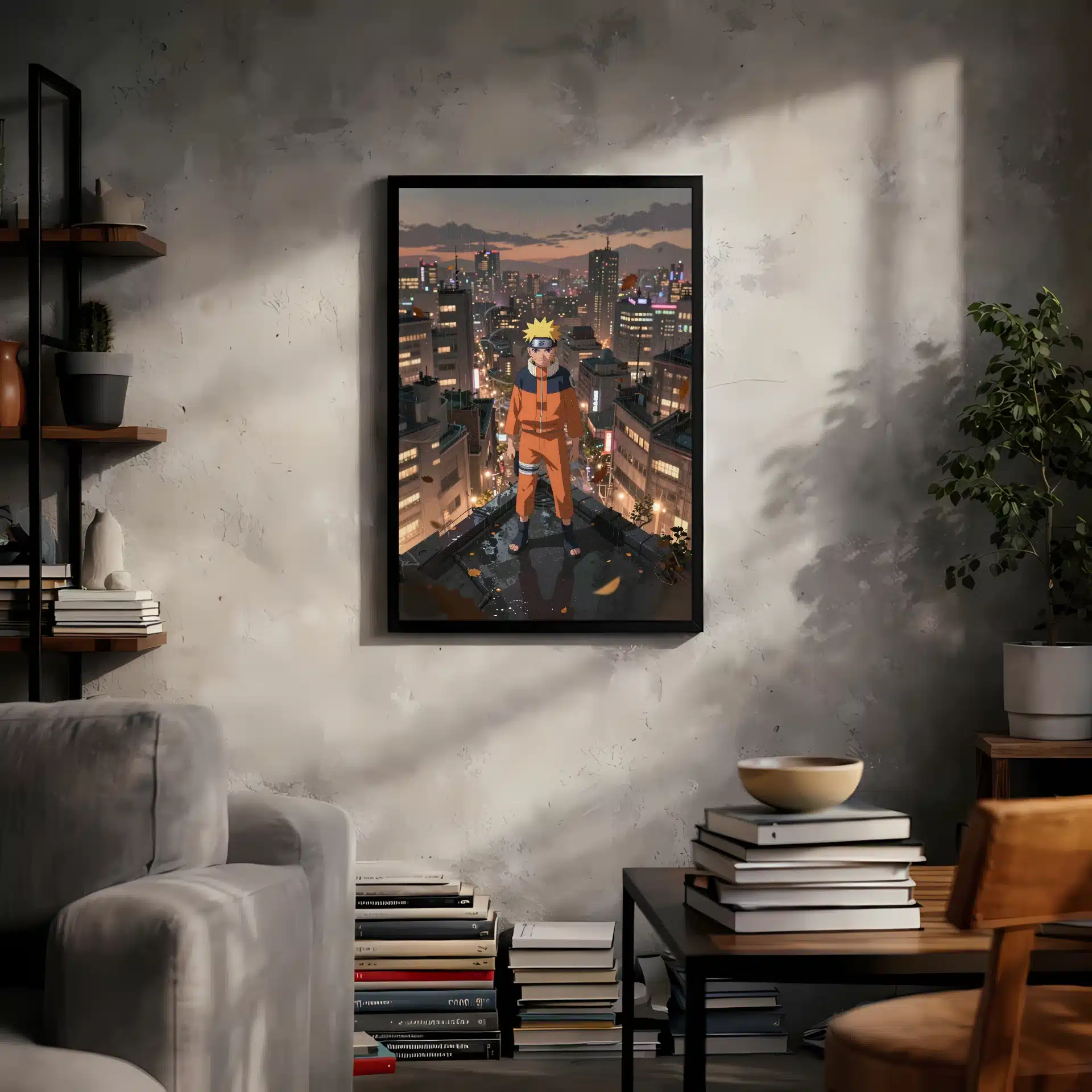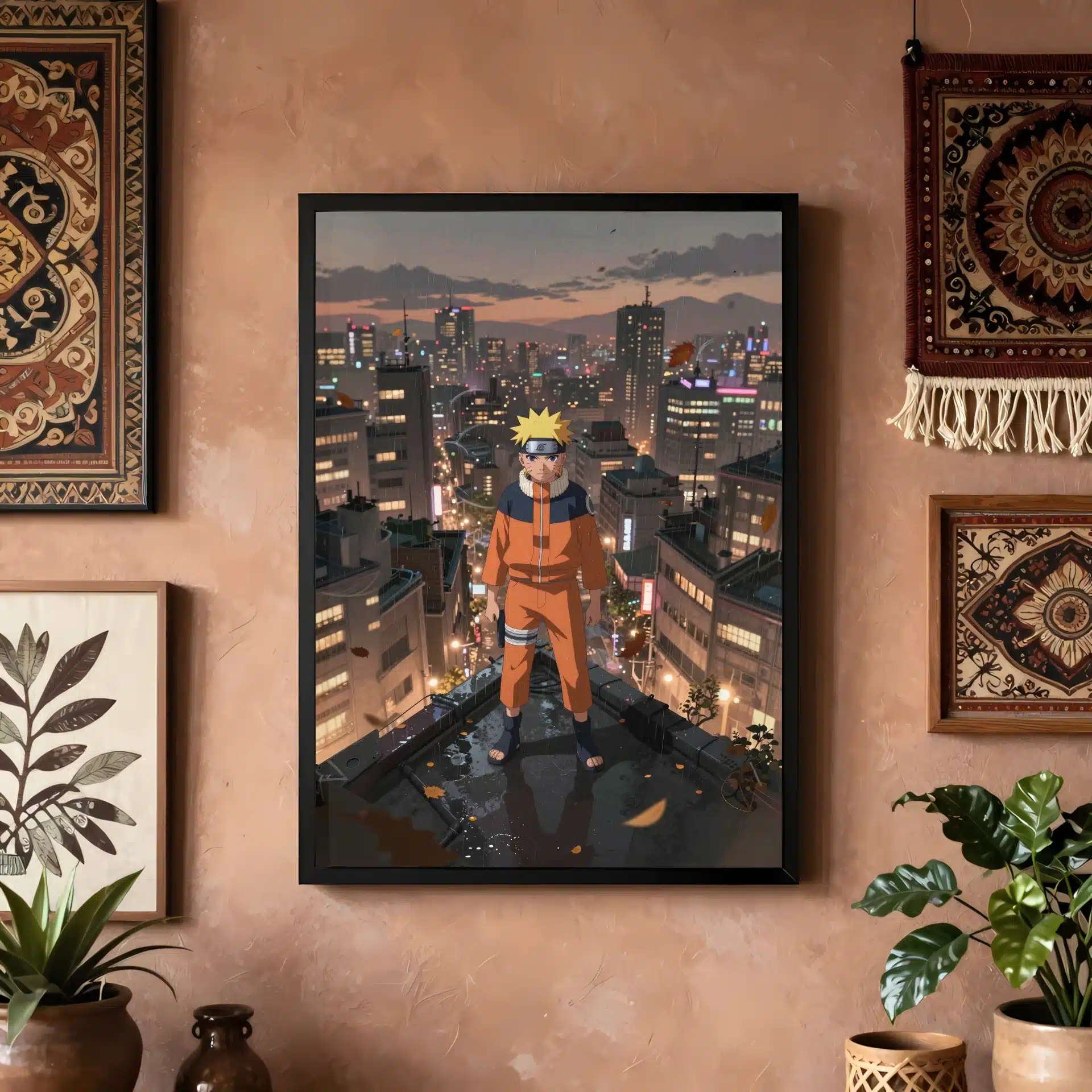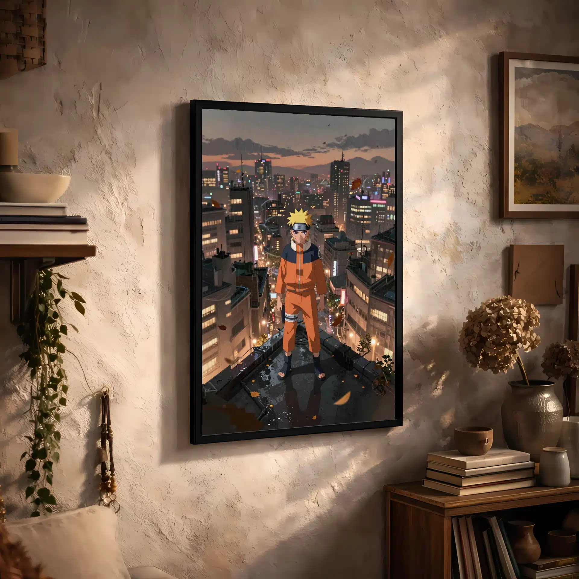 طرح این قاب عکس با جزئیات دقیق و سبک انیمهای، شهری گسترده با ساختمانهای بلند و نورهای نئون را در پسزمینه نشان میدهد. کت نارنجی ناروتو در تضاد با رنگهای ملایم صحنه، انرژی و احساسات این لحظه را به خوبی منتقل میکند.