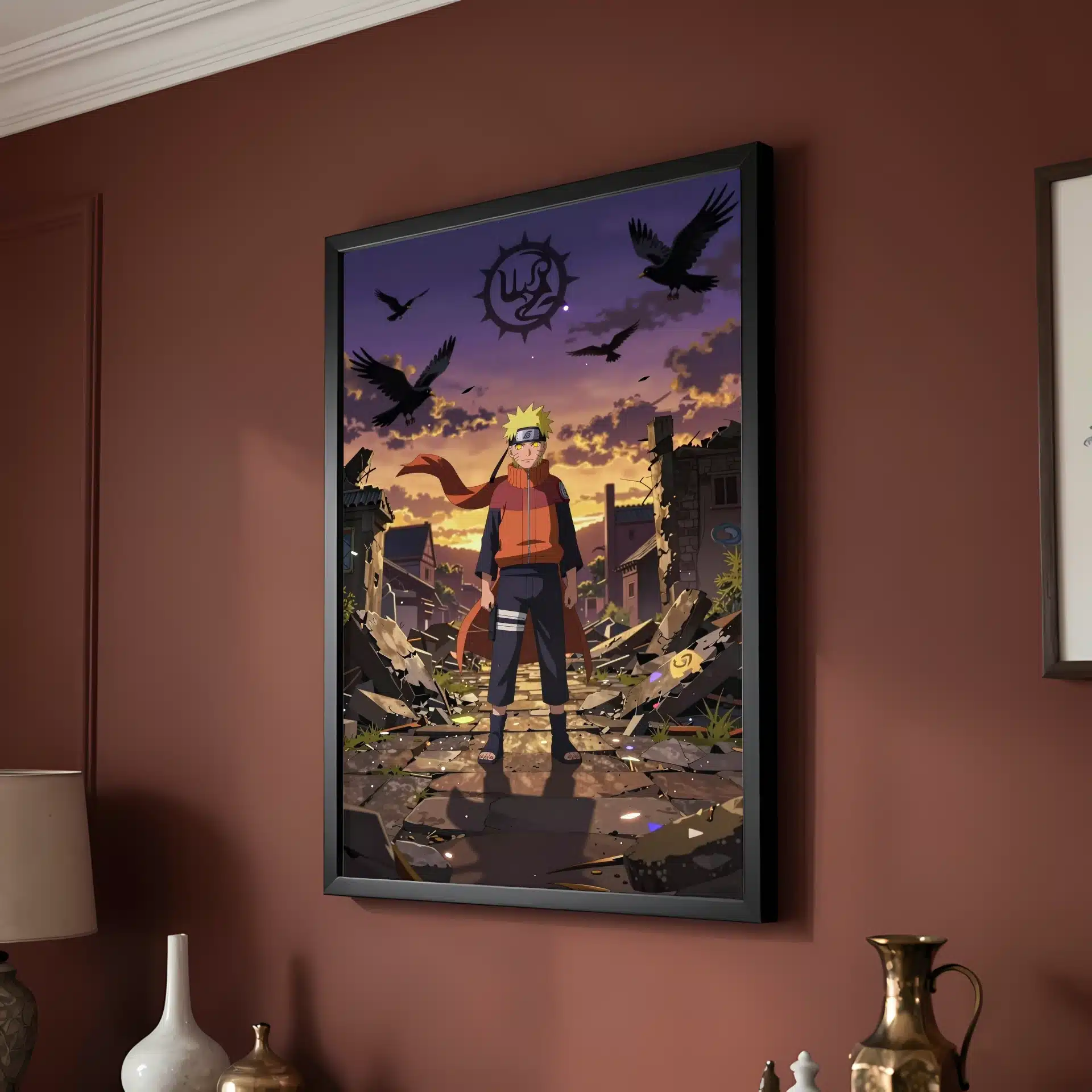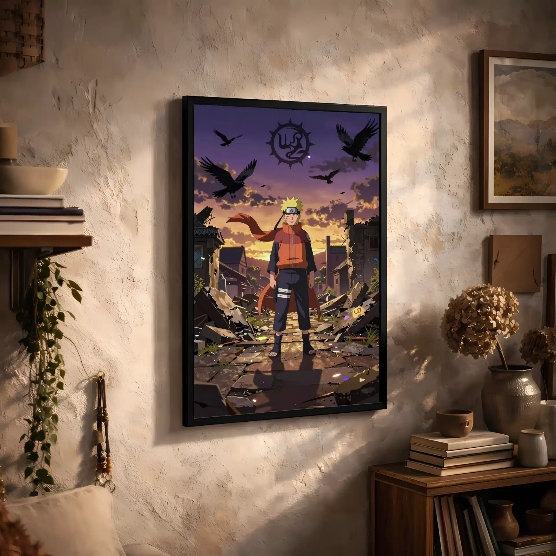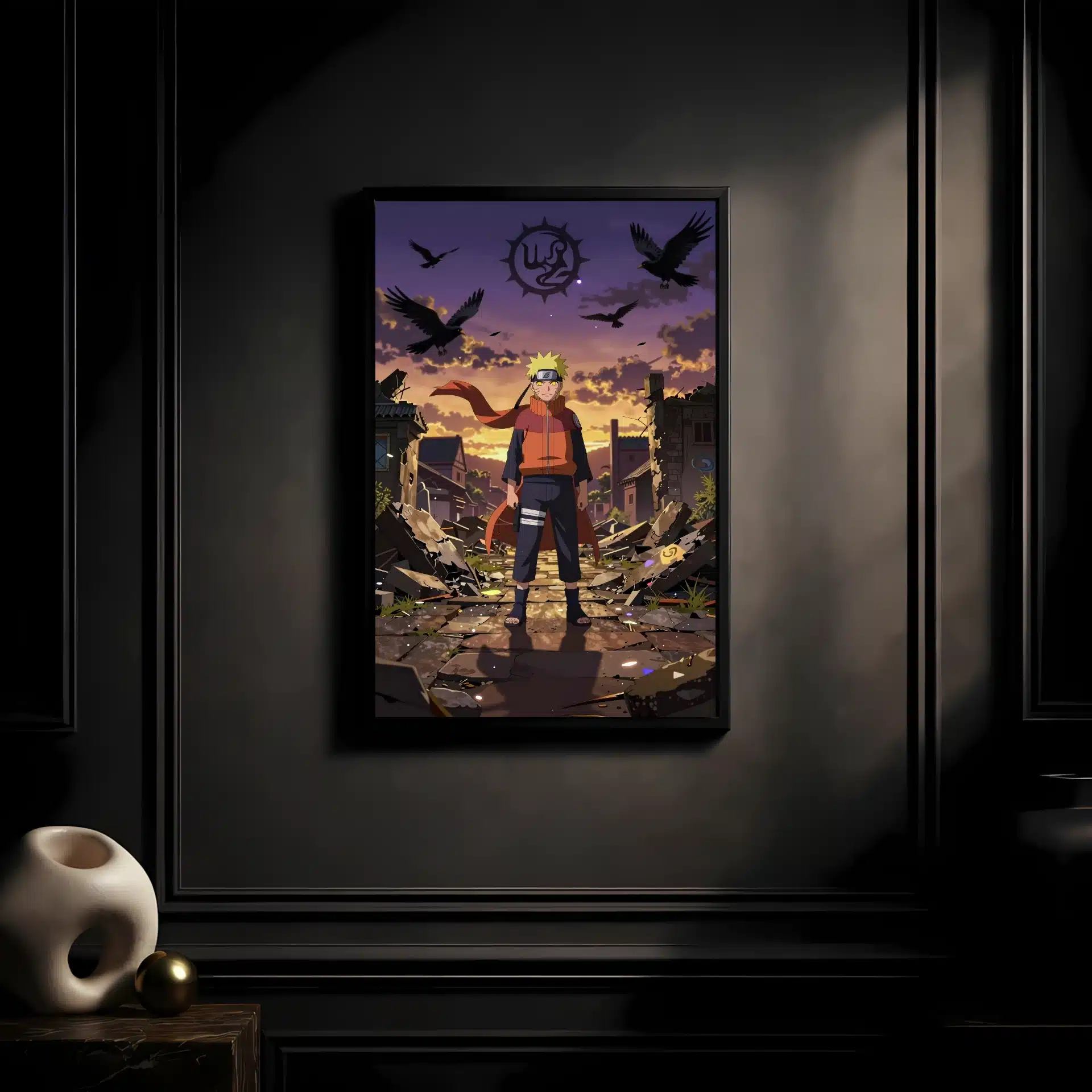 در این قاب عکس، ناروتو تنها در میان ویرانههای دهکده برگ پنهان ایستاده است، سایهاش بر روی سنگفرشهای شکسته کشیده شده و شال نارنجی پارهپاره جیرایا را در دست گرفته است. آسمان با رنگهای بنفش پررنگ و طلایی مذاب پوشیده شده و کلاغهایی که به نمادهای قبیله اوزوماکی تبدیل میشوند، صحنهای از غم و مقاومت را به تصویر میکشند.