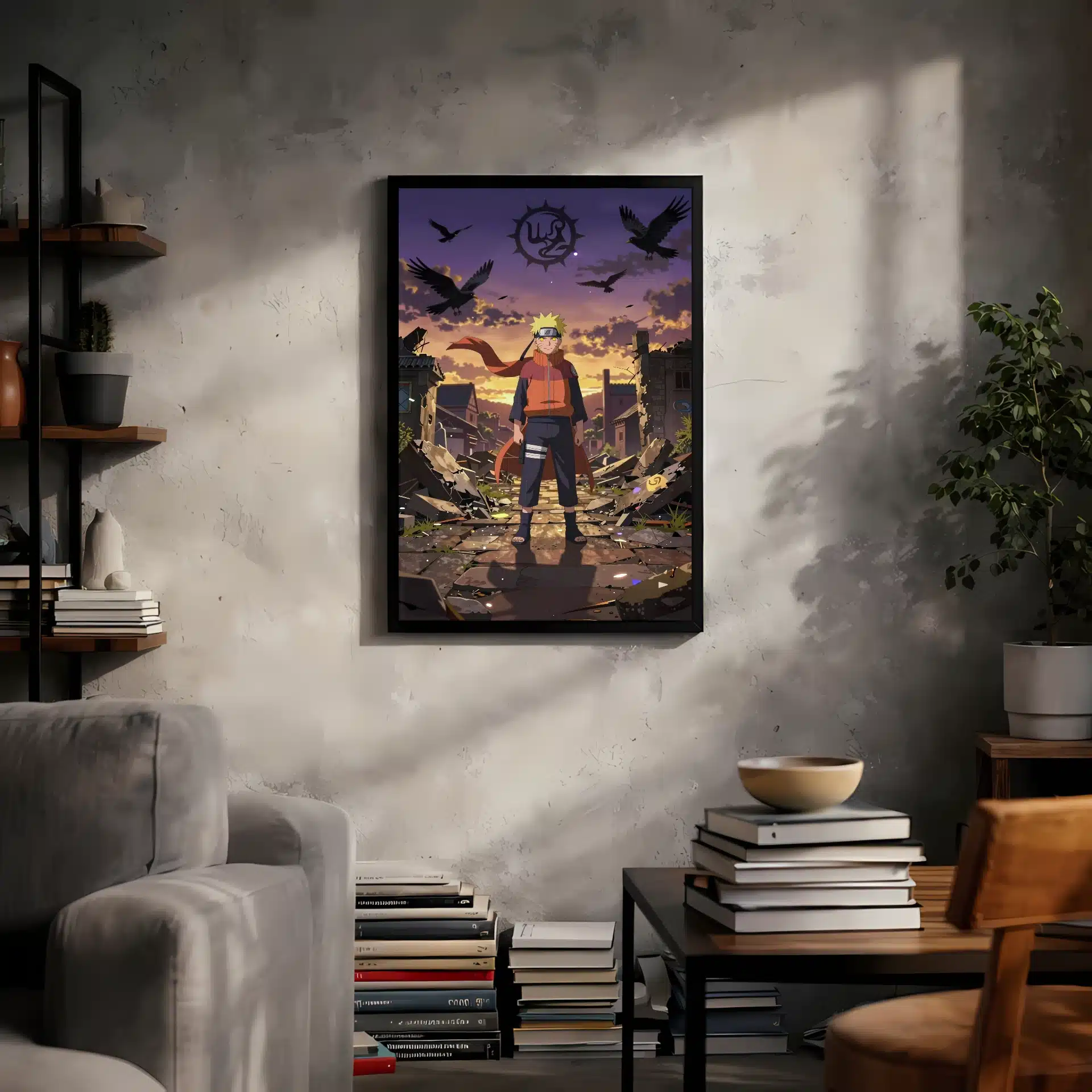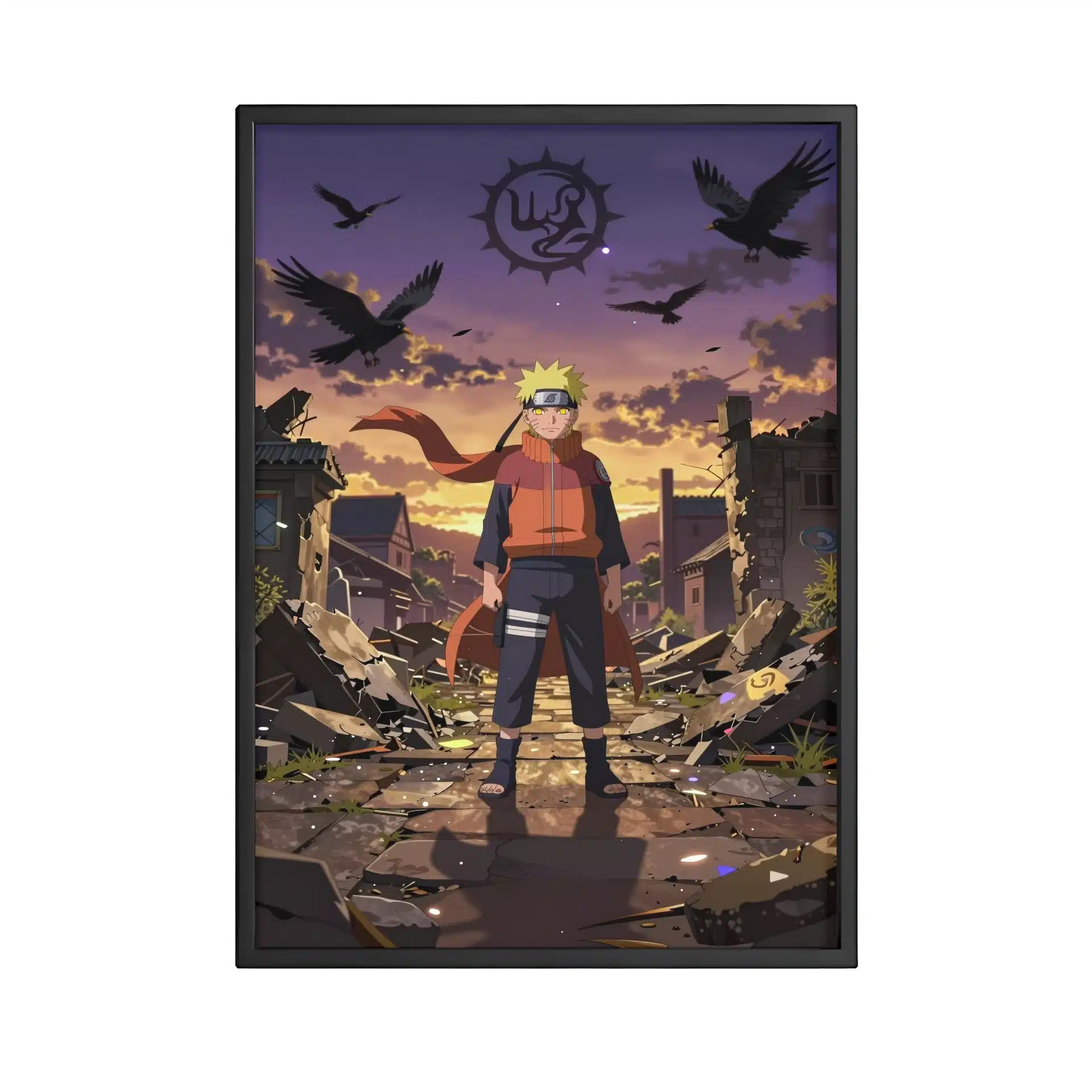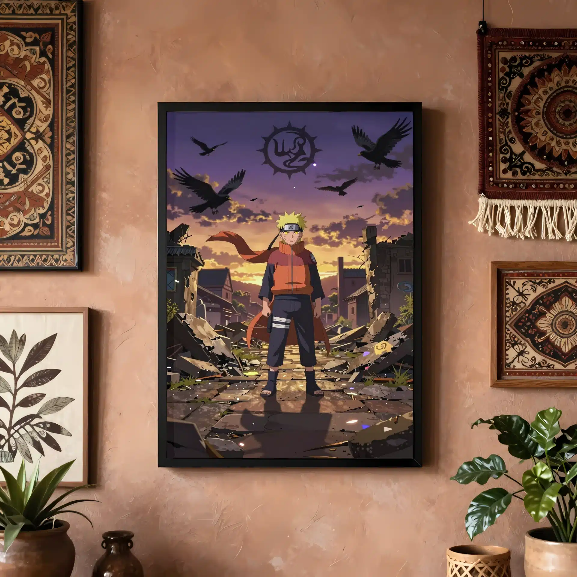 در این قاب عکس، ناروتو تنها در میان ویرانههای دهکده برگ پنهان ایستاده است، سایهاش بر روی سنگفرشهای شکسته کشیده شده و شال نارنجی پارهپاره جیرایا را در دست گرفته است. آسمان با رنگهای بنفش پررنگ و طلایی مذاب پوشیده شده و کلاغهایی که به نمادهای قبیله اوزوماکی تبدیل میشوند، صحنهای از غم و مقاومت را به تصویر میکشند.