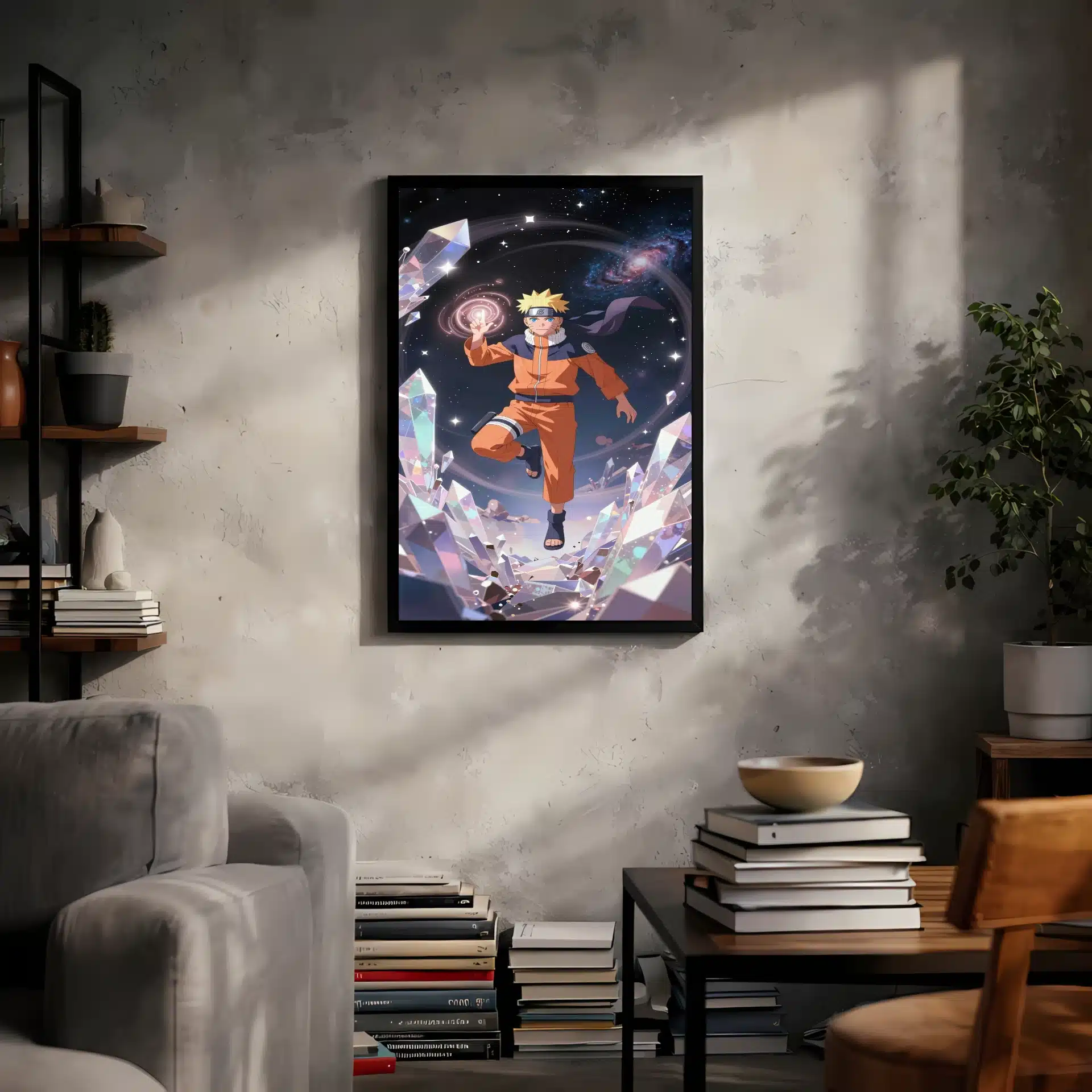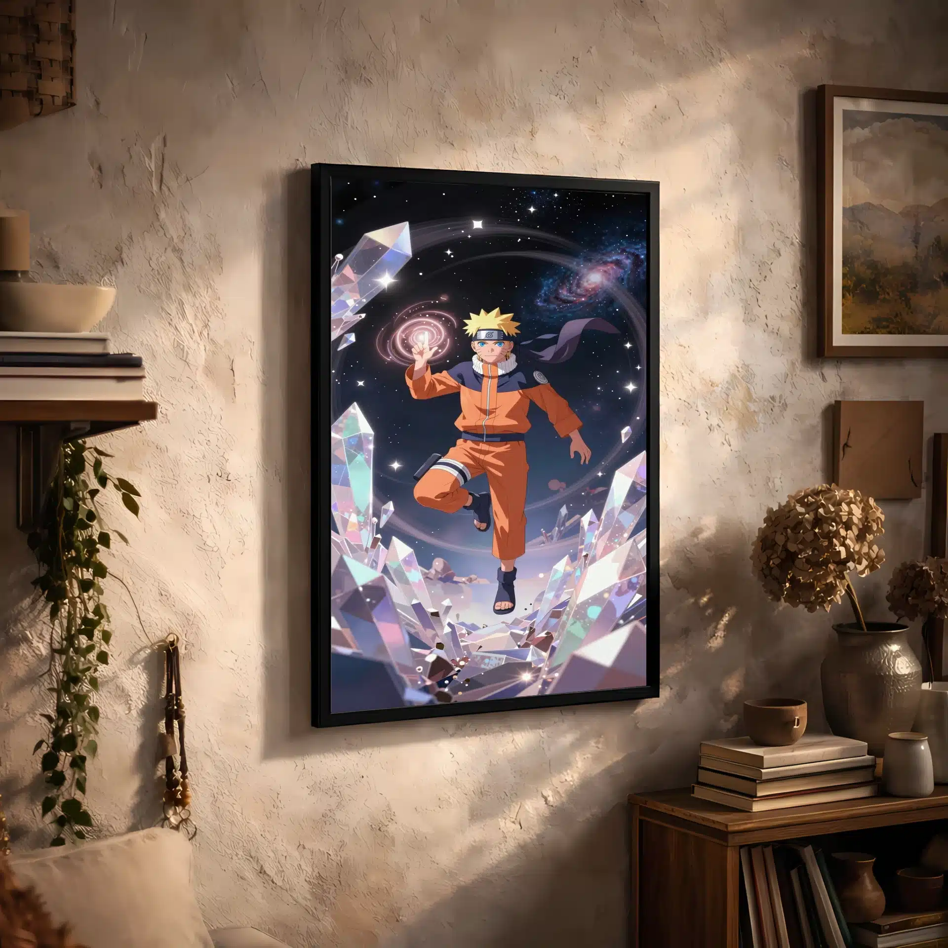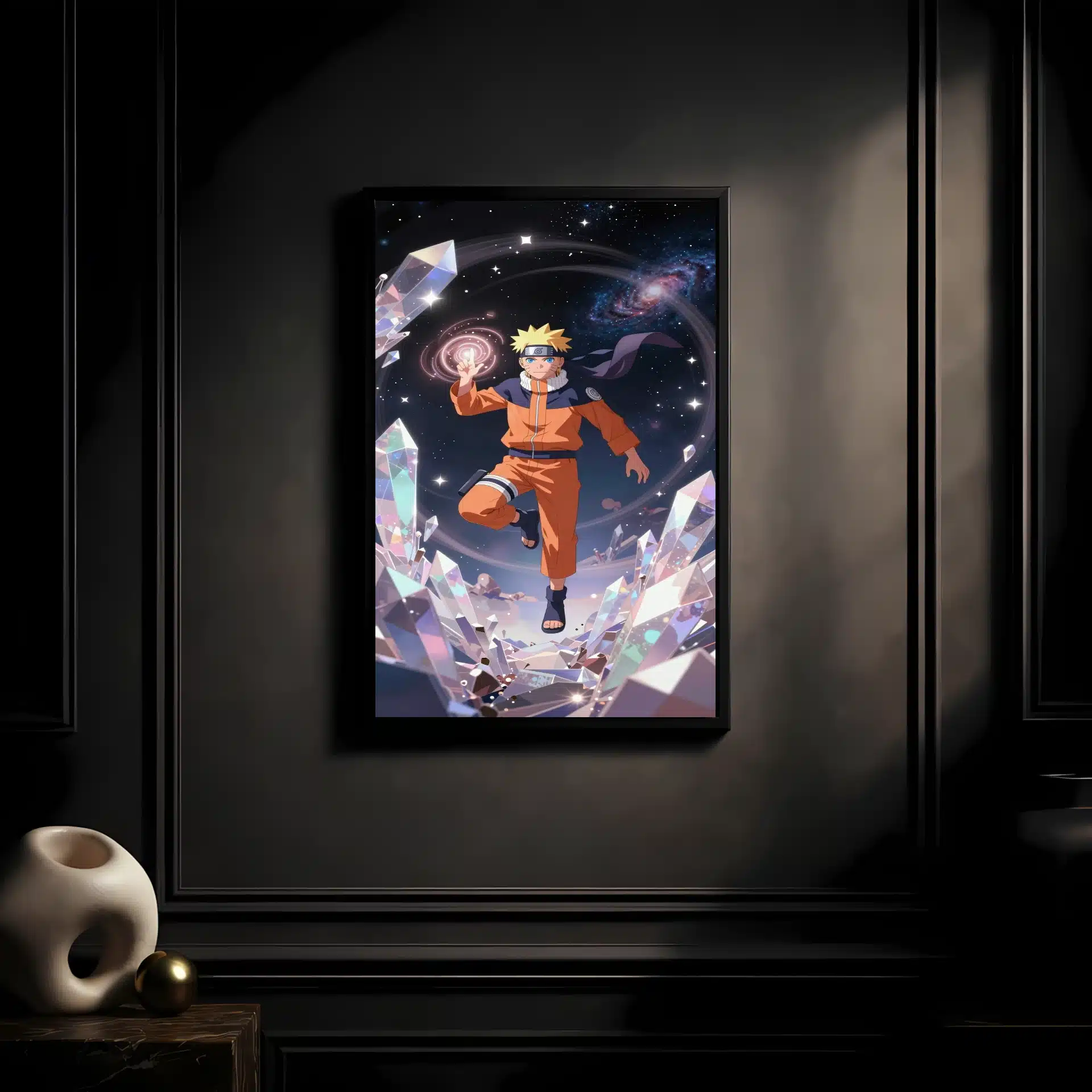این قاب عکس منحصر به فرد ناروتو اوزوماکی را در فضای بیکران به تصویر میکشد، جایی که او با آرامش در میان کریستالهای درخشان شناور است. نورپردازی سینمایی و انرژی چاکرای درخشان او، فضایی رویایی و پر از قدرت خلق کردهاست.