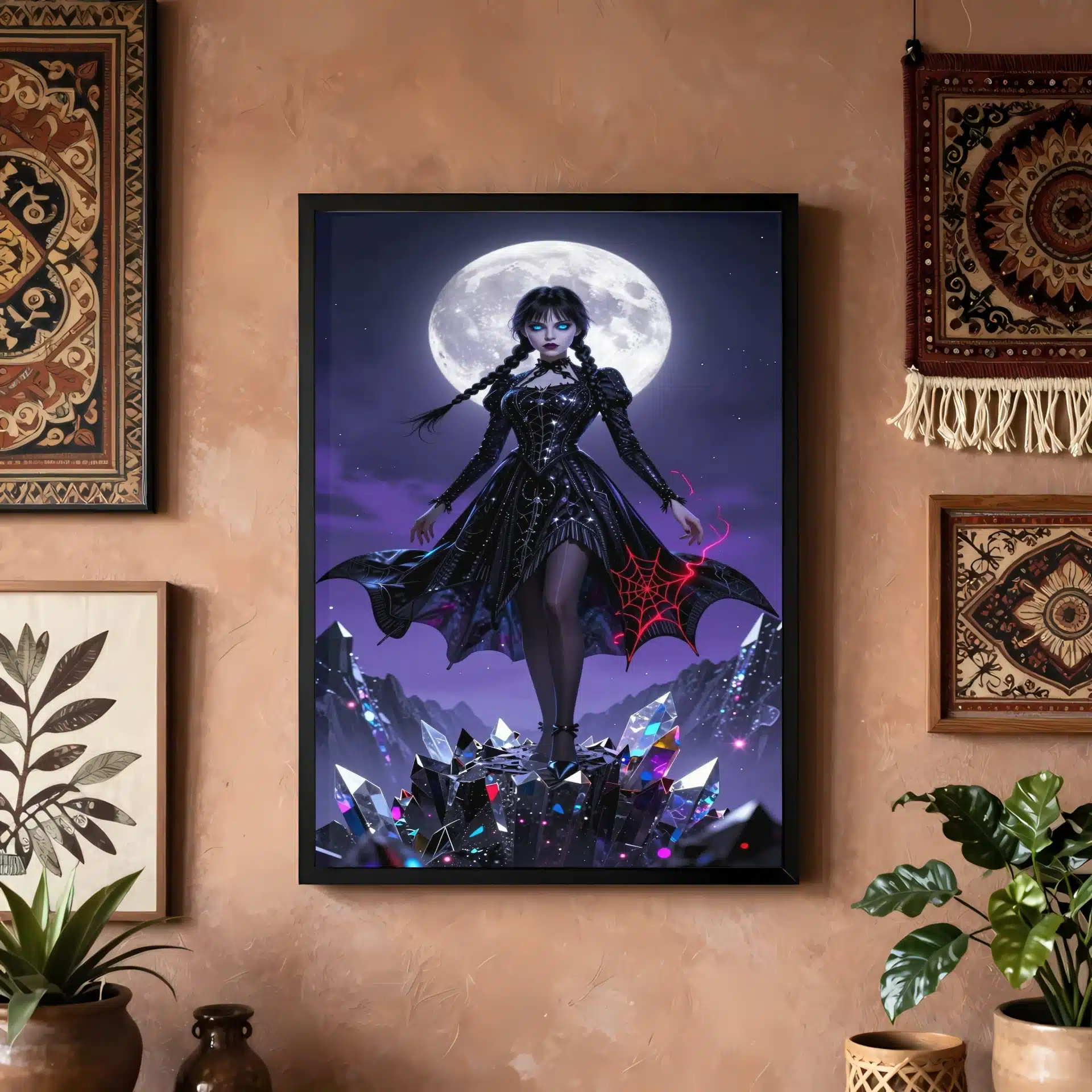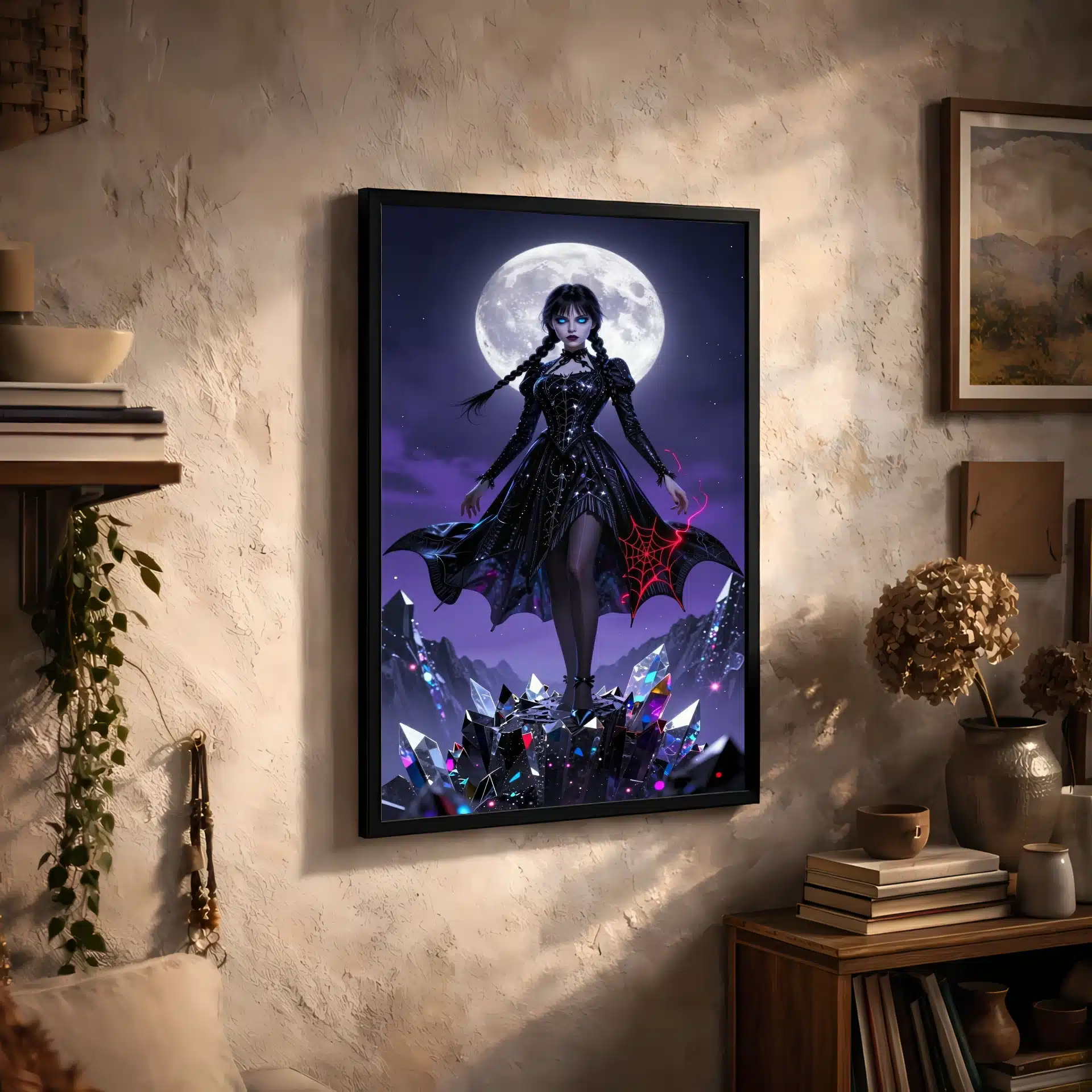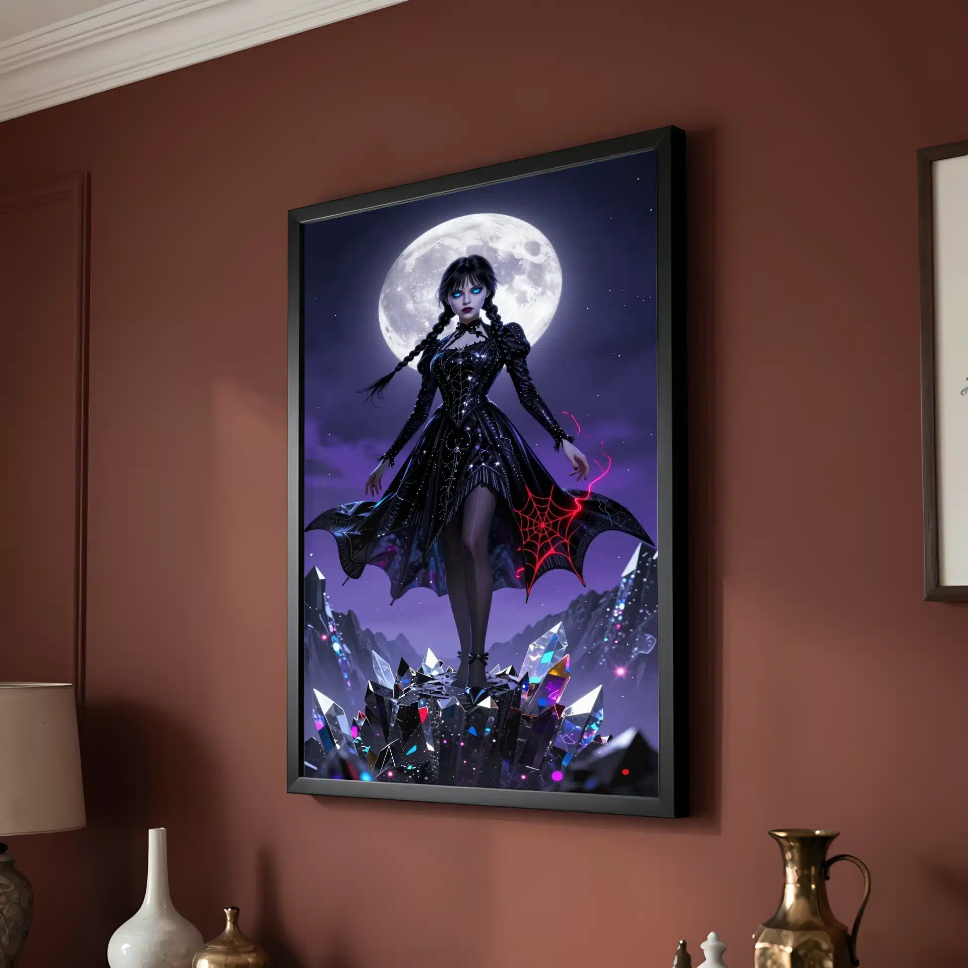 این قاب عکس از ونزدی آدامز، شخصیت محبوب سریال ‘ونزدی’، یک اثر هنری فوق العاده با جزئیات خیرهکننده است. ونزدی در این تصویر بر فراز قلهای بلورین ایستاده و نگاه نافذ و درخشان او تحت نور مهتاب فلوئورسنت، حالتی مرموز و جذاب به تصویر بخشیده است.