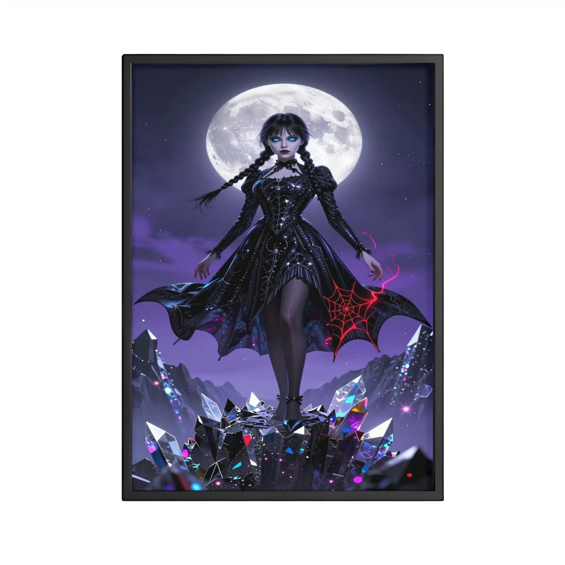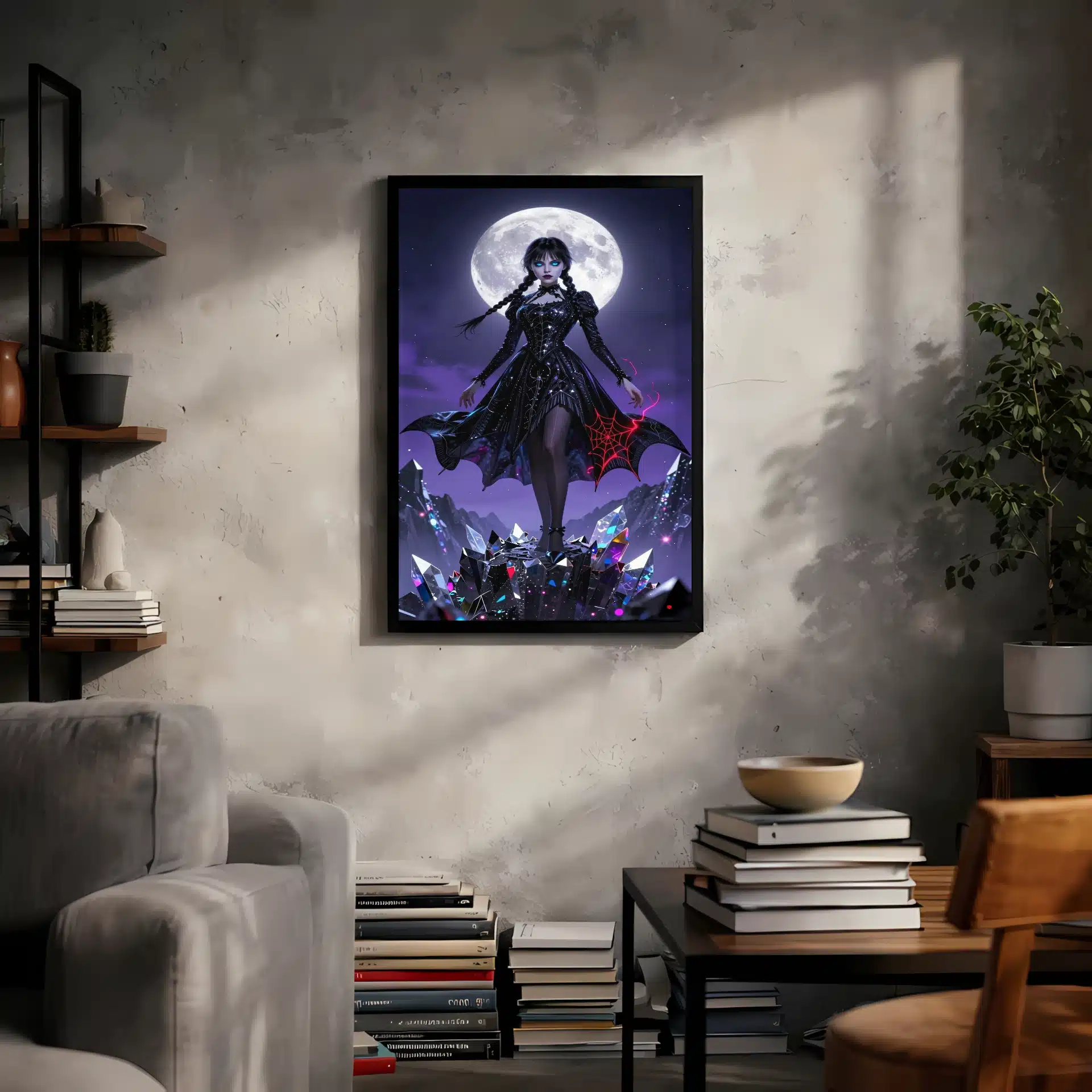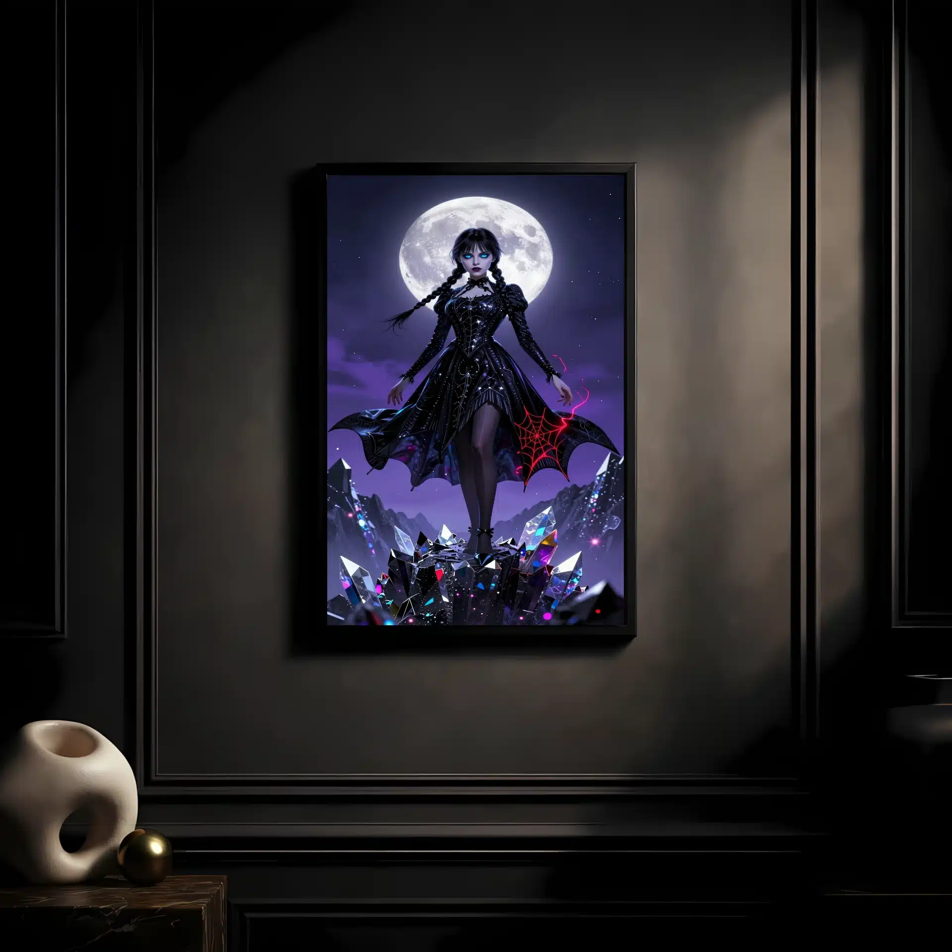 این قاب عکس از ونزدی آدامز، شخصیت محبوب سریال ‘ونزدی’، یک اثر هنری فوق العاده با جزئیات خیرهکننده است. ونزدی در این تصویر بر فراز قلهای بلورین ایستاده و نگاه نافذ و درخشان او تحت نور مهتاب فلوئورسنت، حالتی مرموز و جذاب به تصویر بخشیده است.