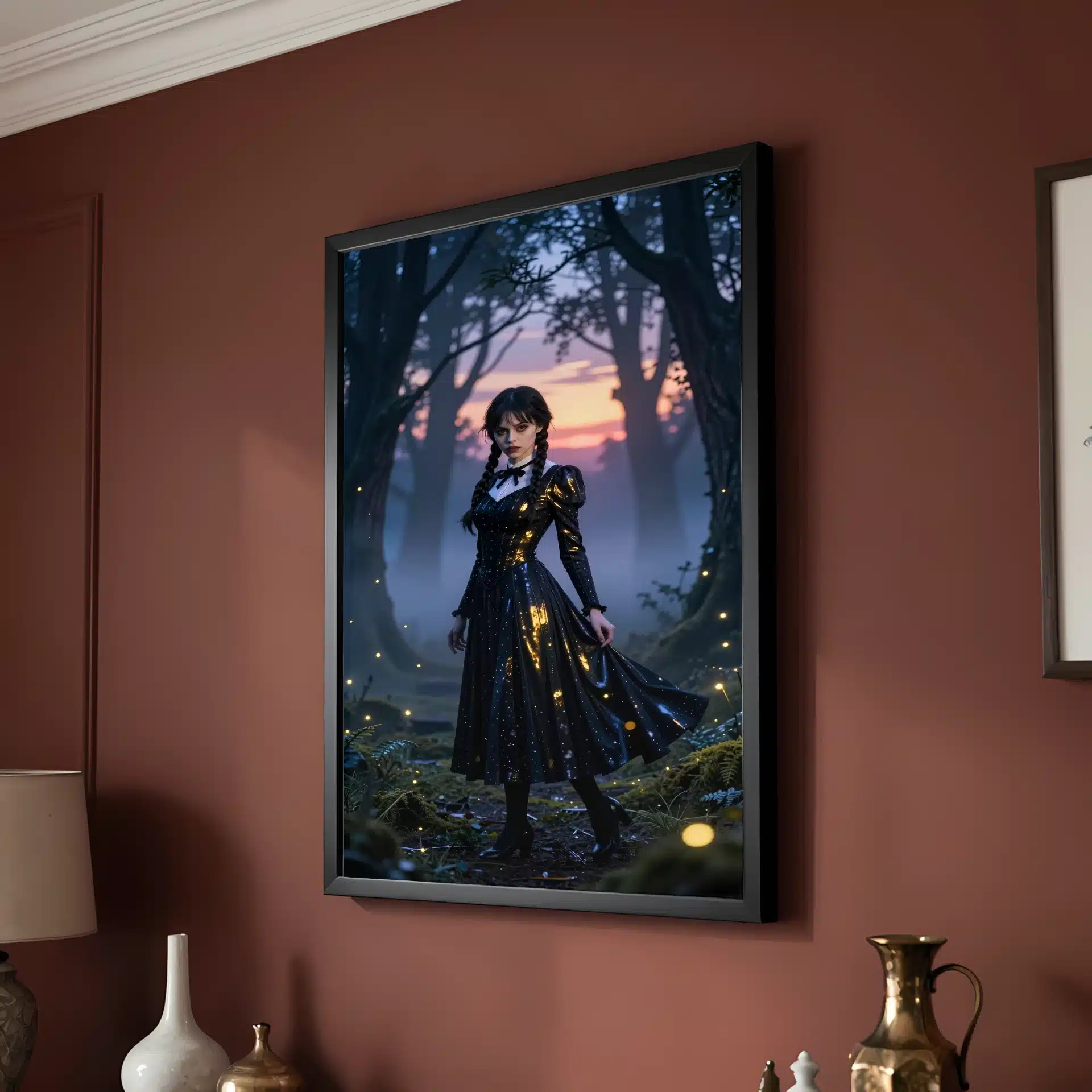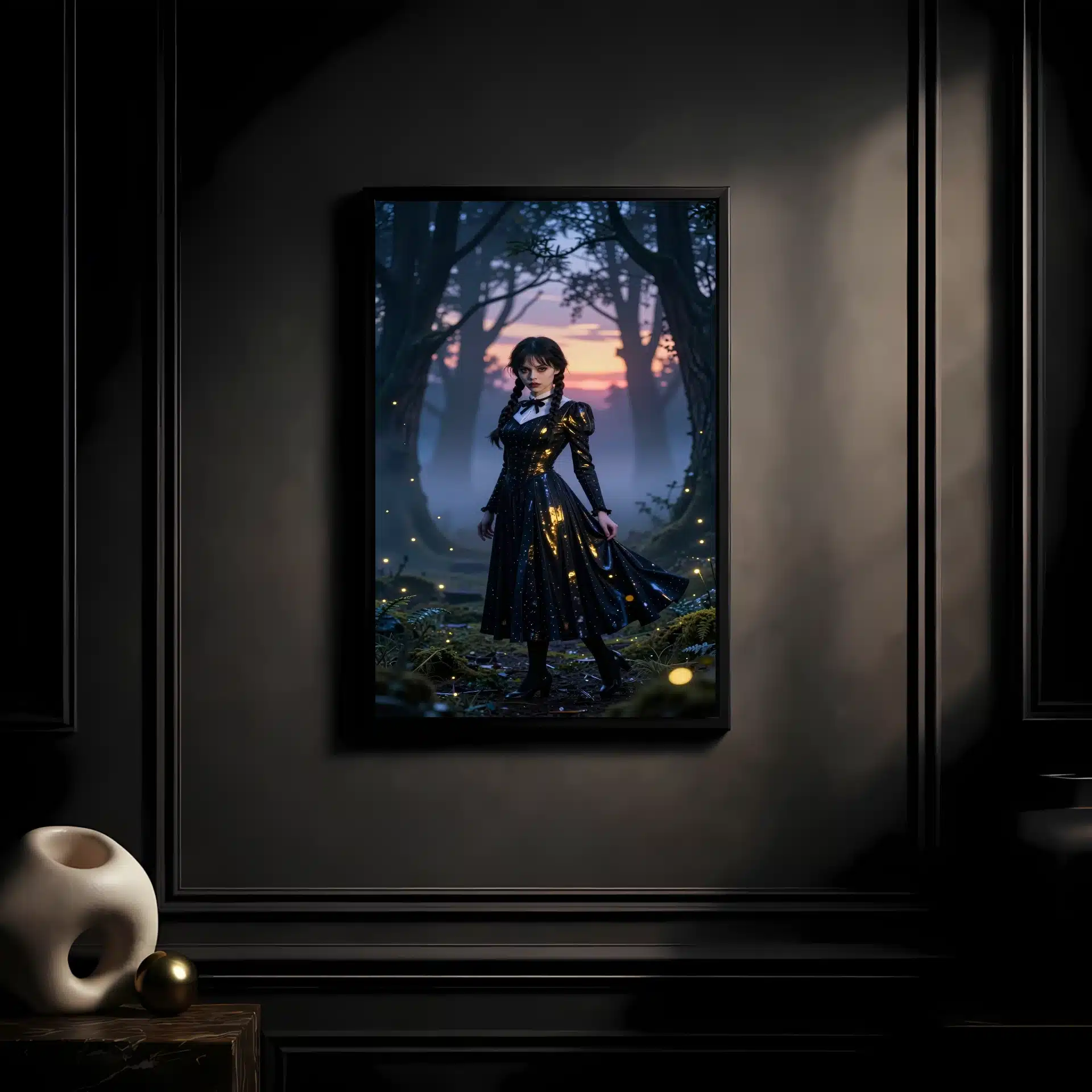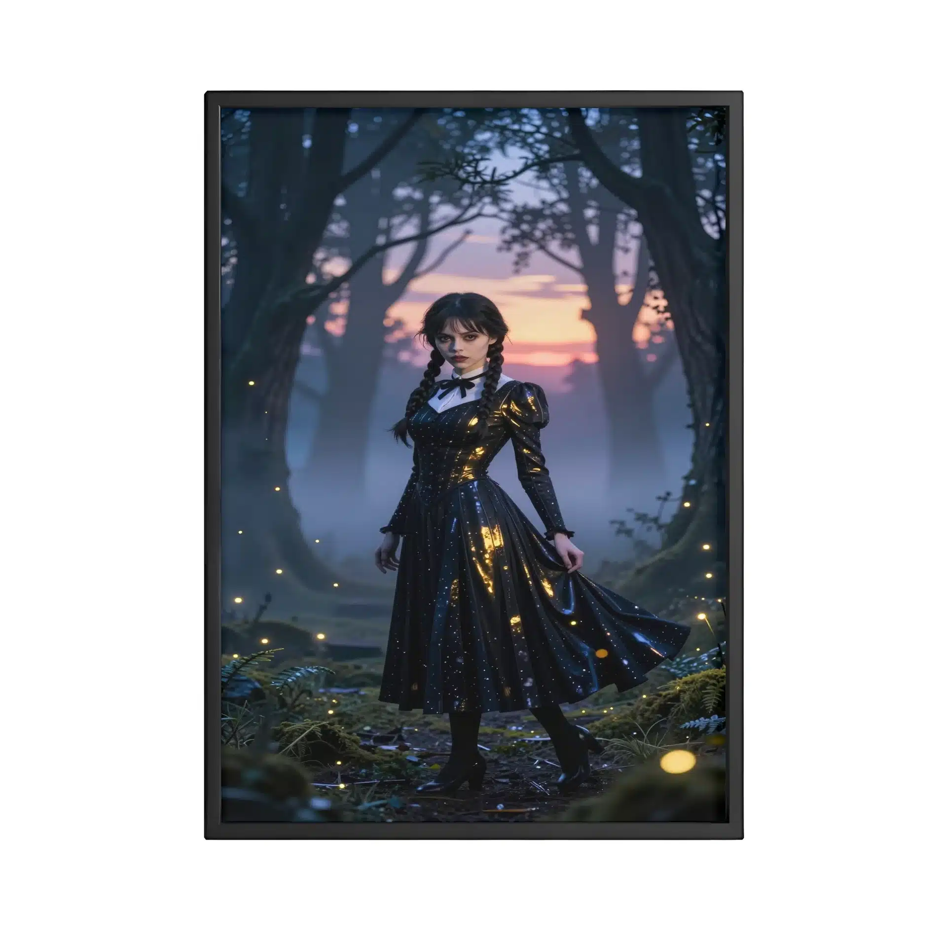 ونزدی آدامز در یک جنگل افسونشده و مهآلود در گرگومیش غروب، زیر نور سورئال غروب خورشید با هایلایتهای فلورسنت خنک ایستاده است. لباس سیاه نمادین او با ظرافت در حال حرکت است و انعکاس طلایی نور خورشید را نشان میدهد، در حالی که نگاه نافذ او با سایههای آبی عمیق درختان بلند تضاد زیبایی ایجاد میکند.