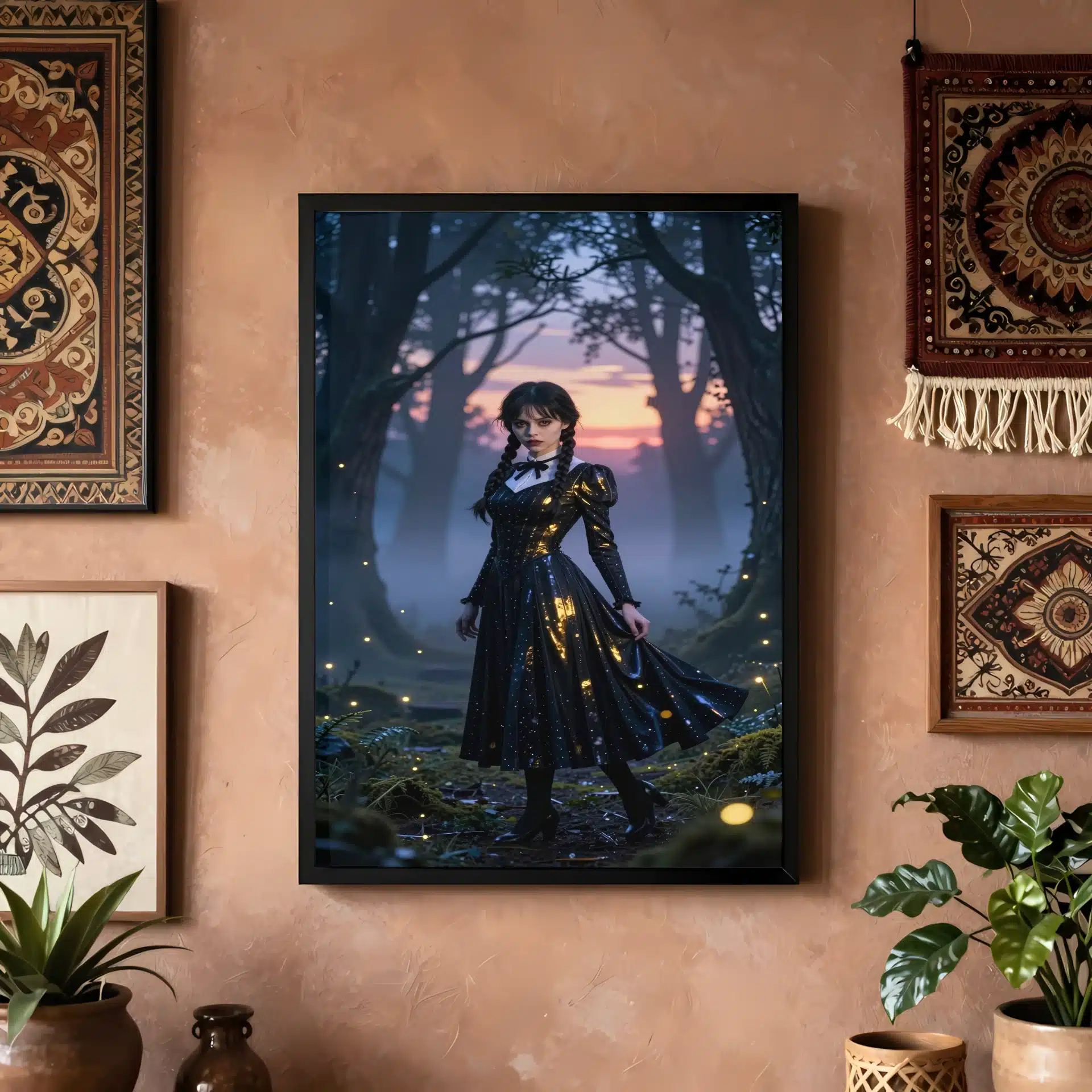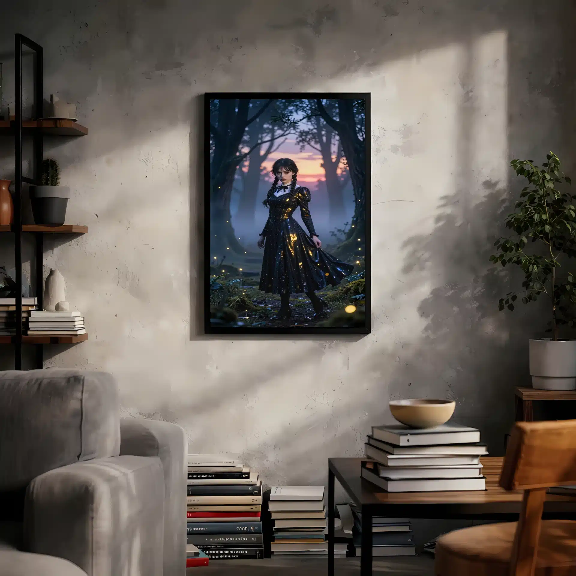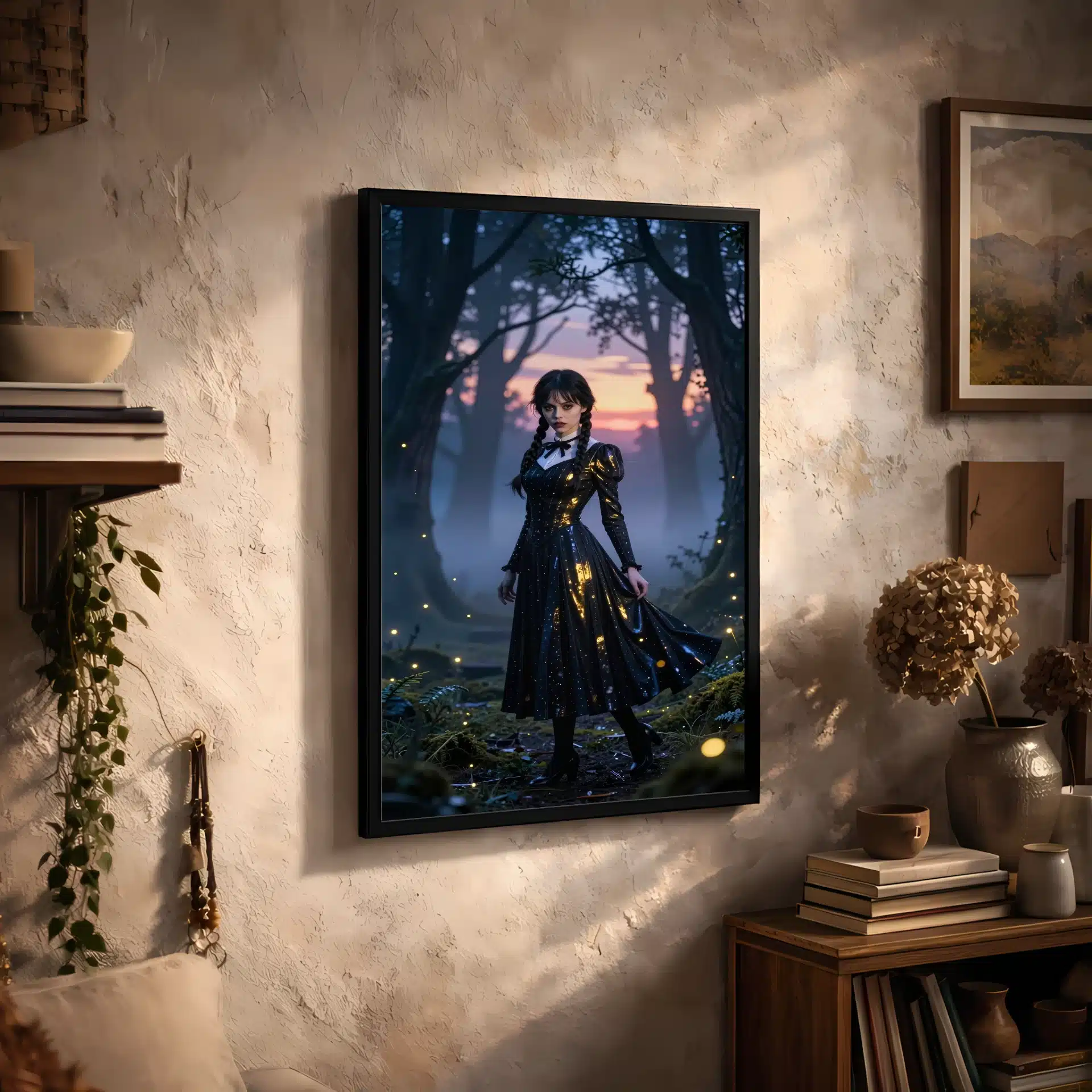 ونزدی آدامز در یک جنگل افسونشده و مهآلود در گرگومیش غروب، زیر نور سورئال غروب خورشید با هایلایتهای فلورسنت خنک ایستاده است. لباس سیاه نمادین او با ظرافت در حال حرکت است و انعکاس طلایی نور خورشید را نشان میدهد، در حالی که نگاه نافذ او با سایههای آبی عمیق درختان بلند تضاد زیبایی ایجاد میکند.