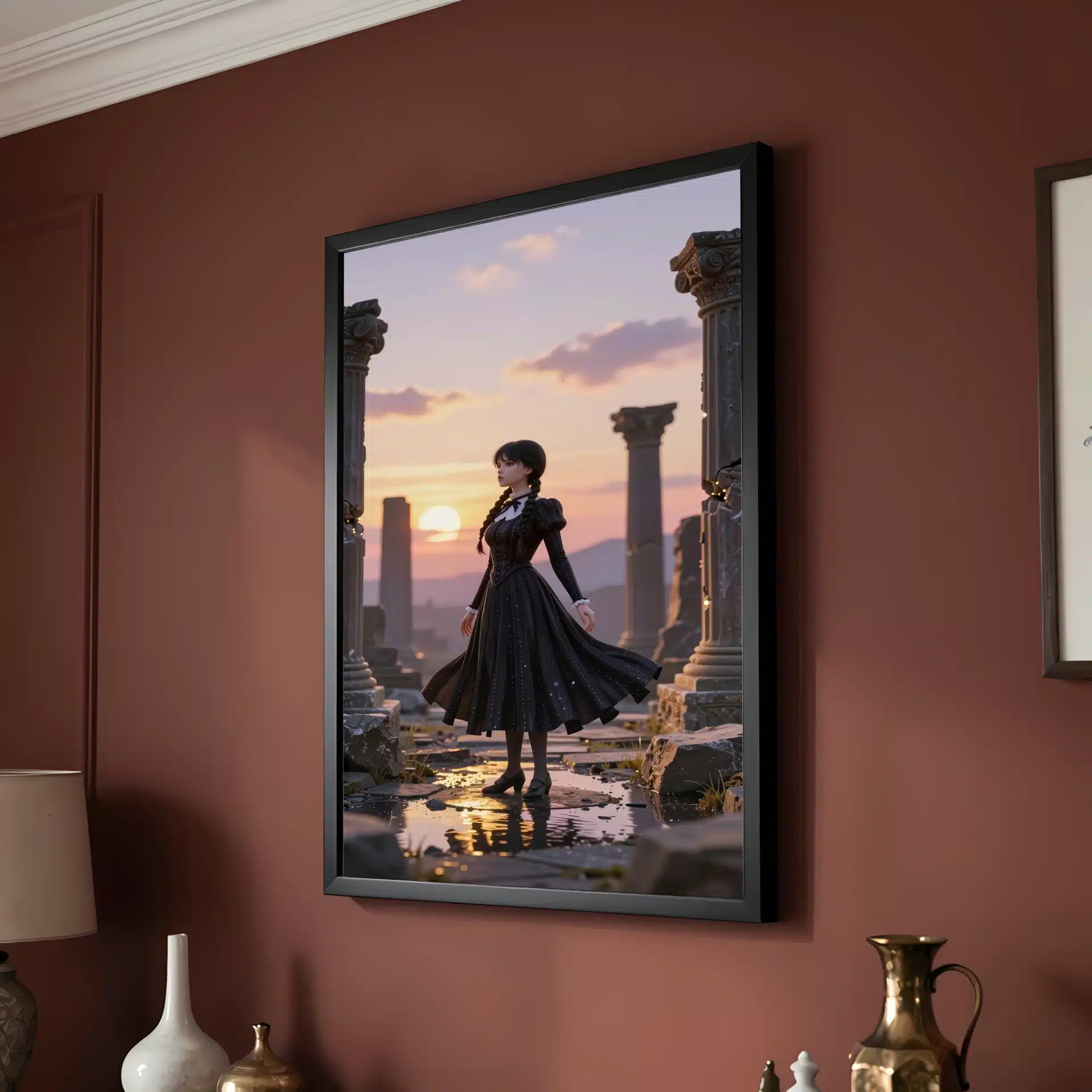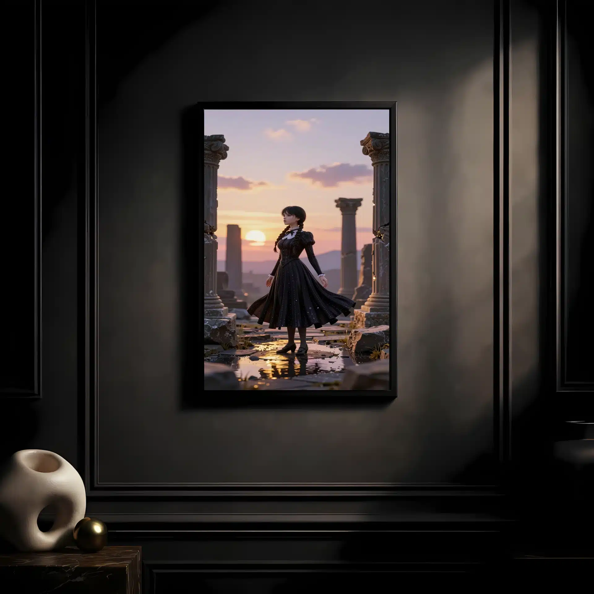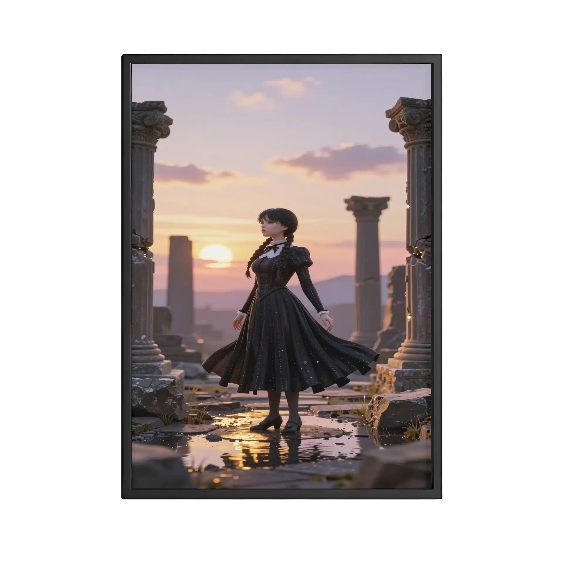 ونزدی آدامز در میان ویرانههای باستانی ایستاده است، در حالی که نور طلایی غروب خورشید او را در بر گرفته است. این تصویر با سبک سینمایی و زیبایی انیمهای، حال و هوایی مرموز و رویایی ایجاد کرده است.