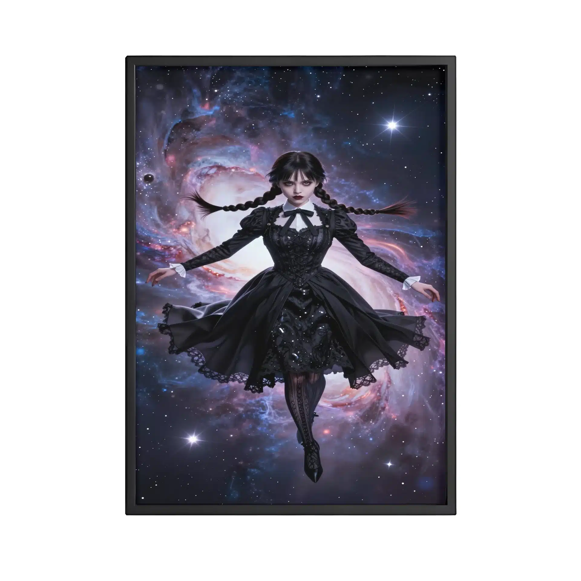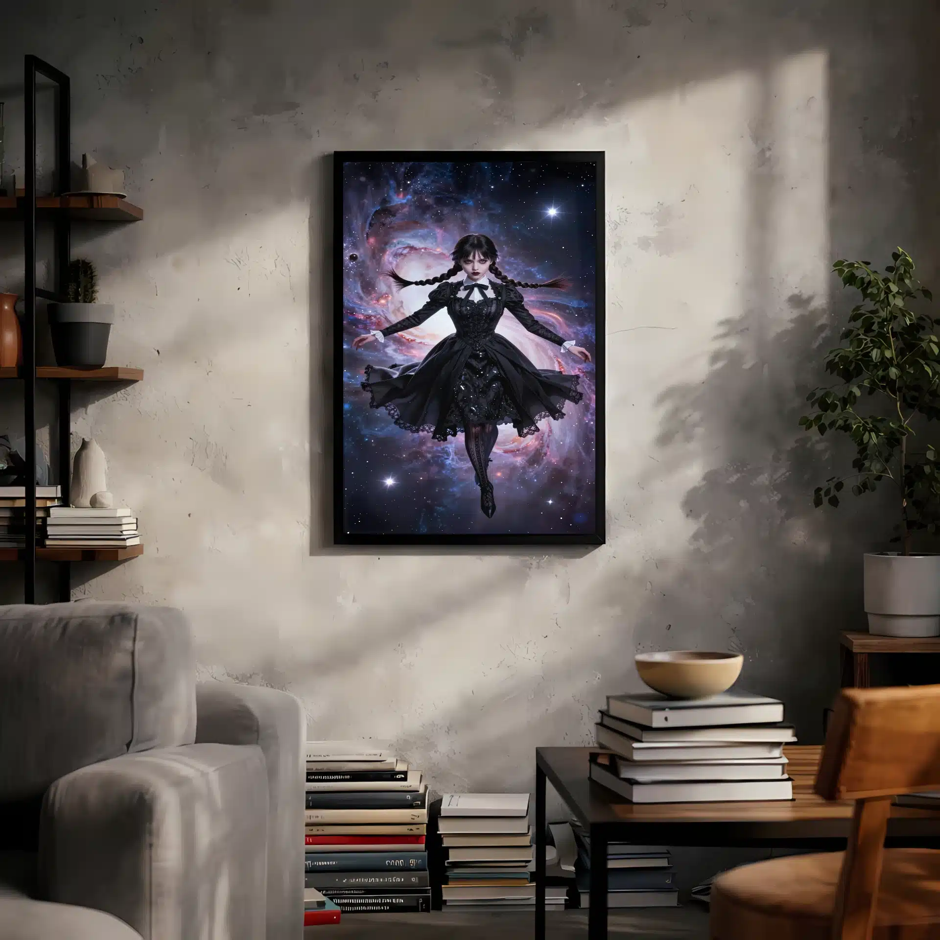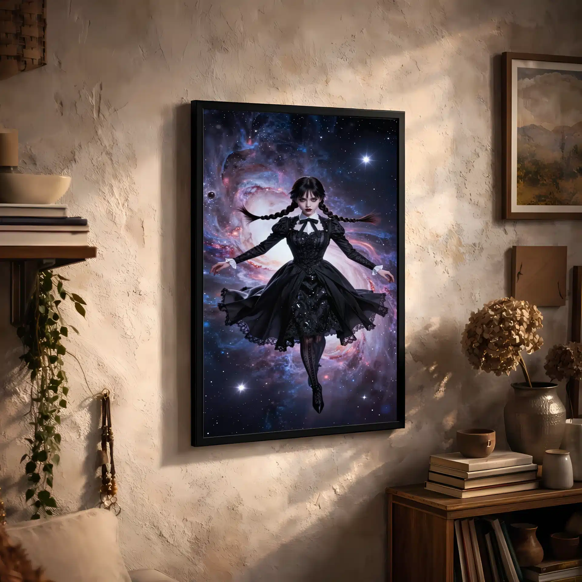 این قاب عکس از ونزدی آدامز، شخصیت محبوب سریال ‘ونزدی’، طراحی شده است. در این تصویر، ونزدی به سبک انیمه و با حالتی آرام در فضای بیکران شناور است و ترکیبی از جذابیت گوتیک و شگفتیهای کیهانی را به نمایش میگذارد.