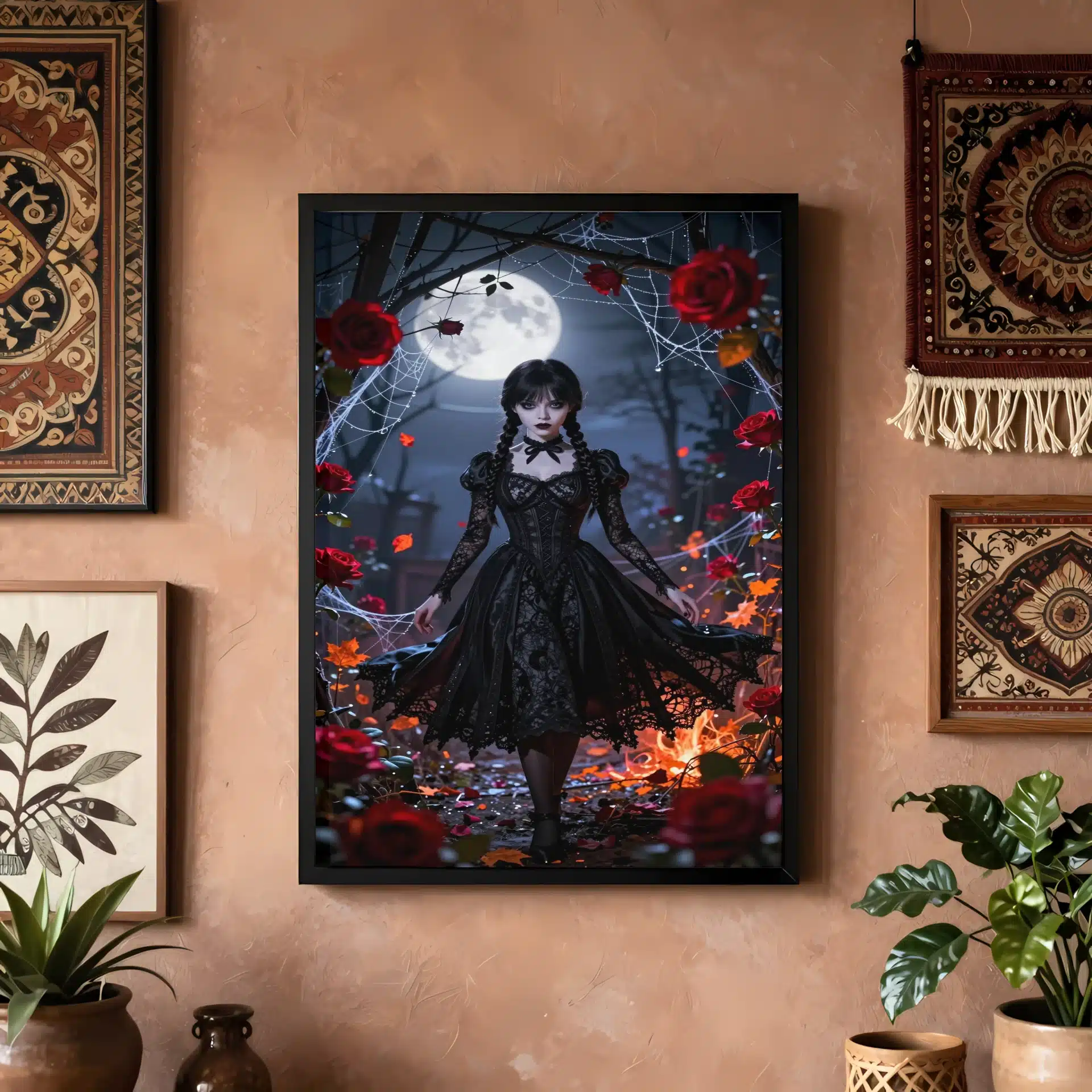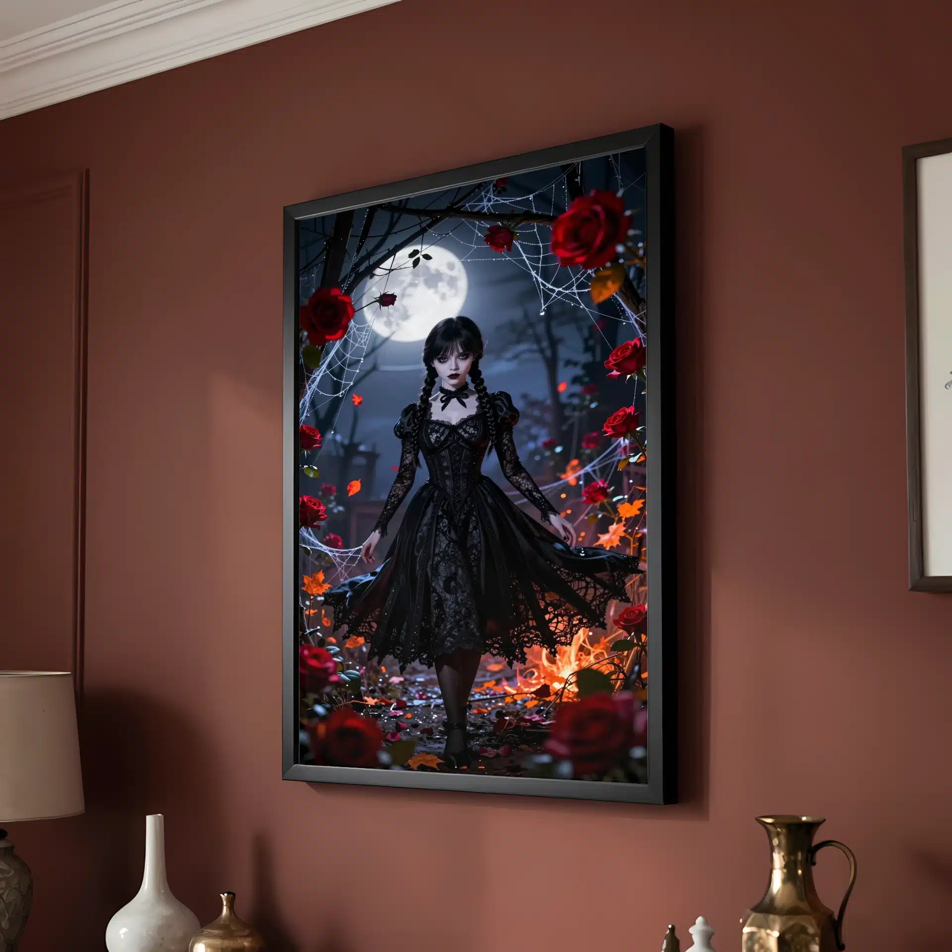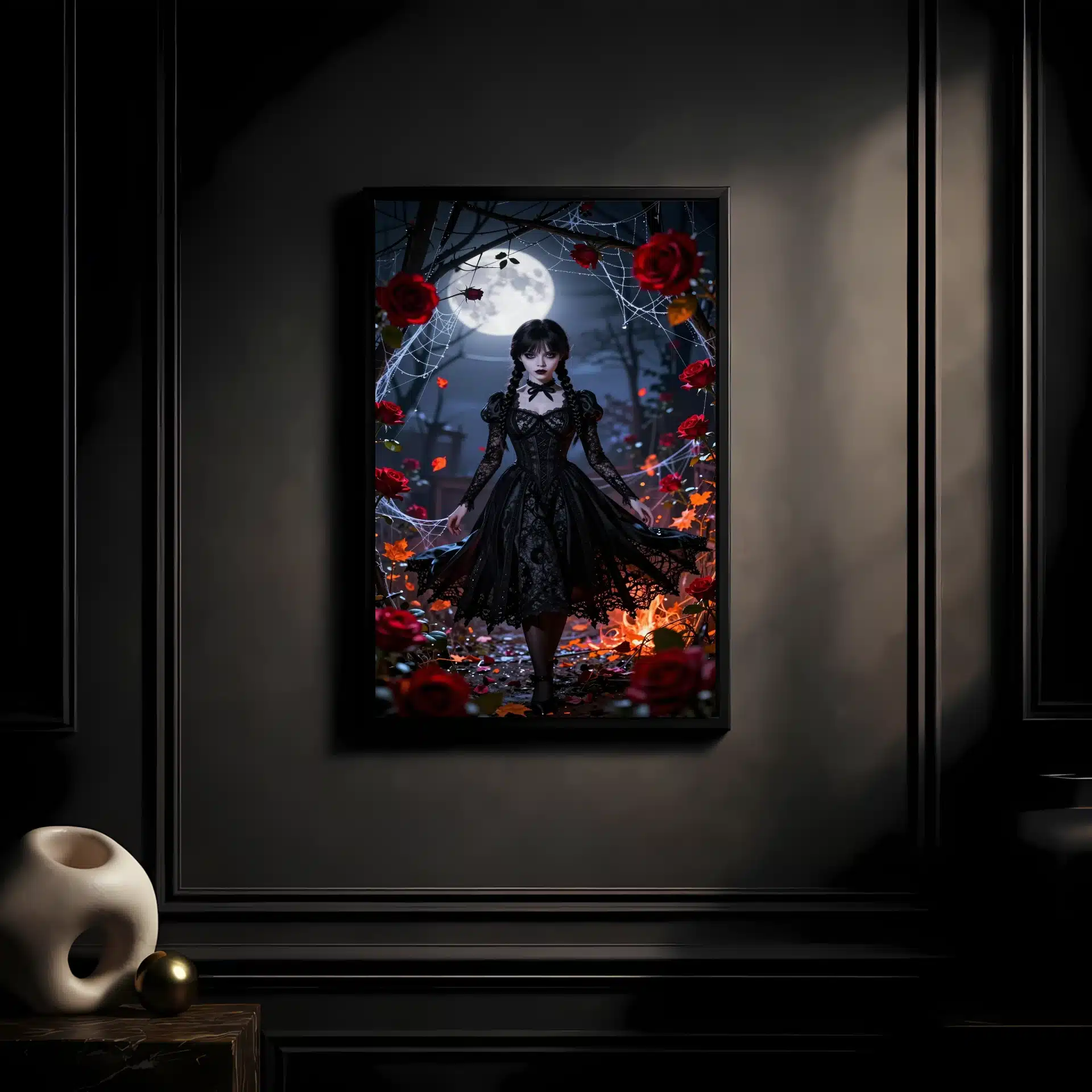 این قاب عکس از ونزدی آدامز، شخصیت محبوب سریال ‘ونزدی’، یک اثر هنری خیرهکننده در سبک انیمه با جزئیات فوقالعاده است. صحنهٔ او در یک باغ اسرارآمیز در گرگومیش، با لباس سیاه تزئینشده و نور مهتابی سرد، فضایی رویایی و مرموز خلق کرده است.