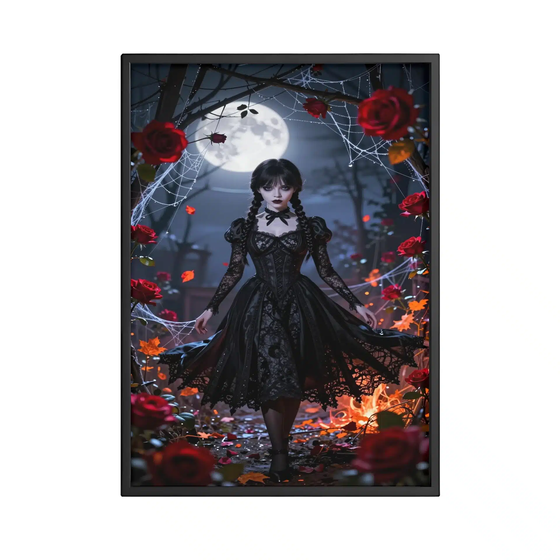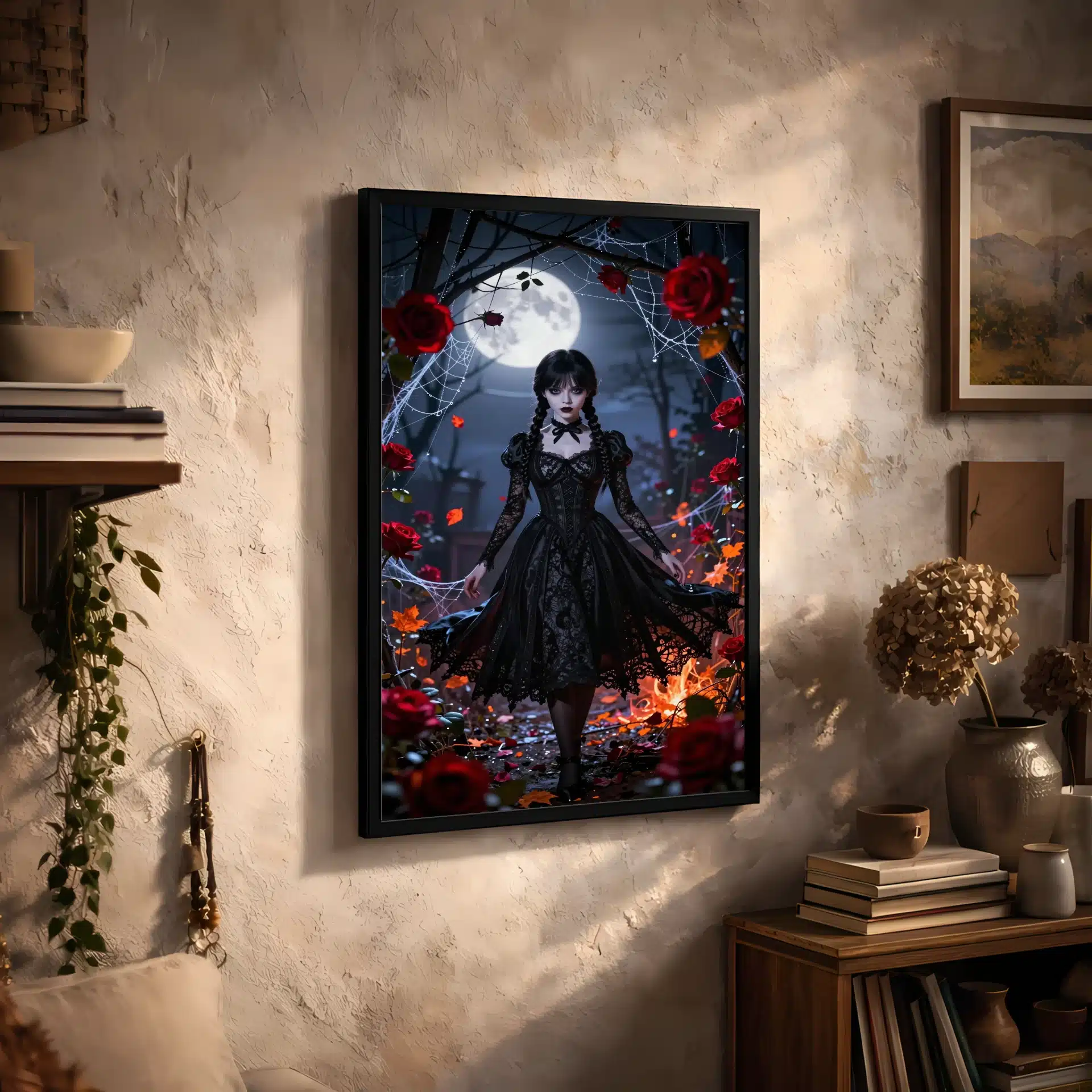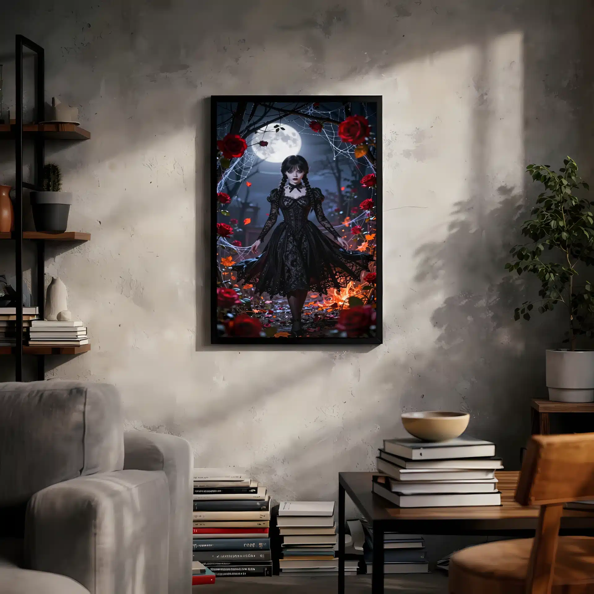 این قاب عکس از ونزدی آدامز، شخصیت محبوب سریال ‘ونزدی’، یک اثر هنری خیرهکننده در سبک انیمه با جزئیات فوقالعاده است. صحنهٔ او در یک باغ اسرارآمیز در گرگومیش، با لباس سیاه تزئینشده و نور مهتابی سرد، فضایی رویایی و مرموز خلق کرده است.