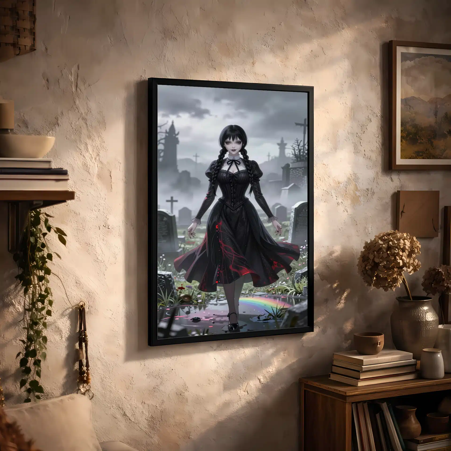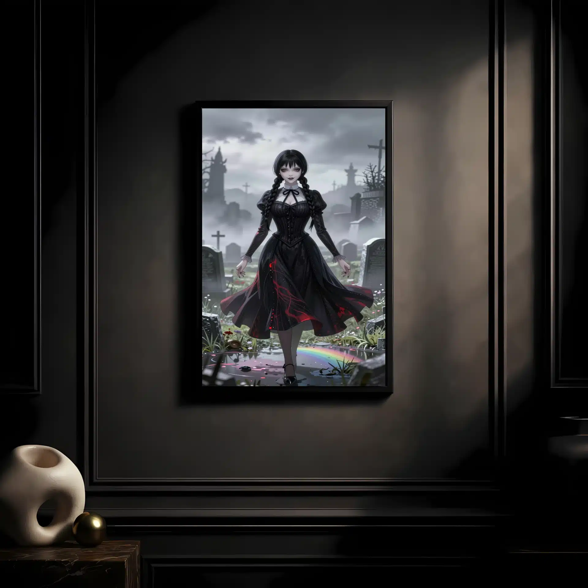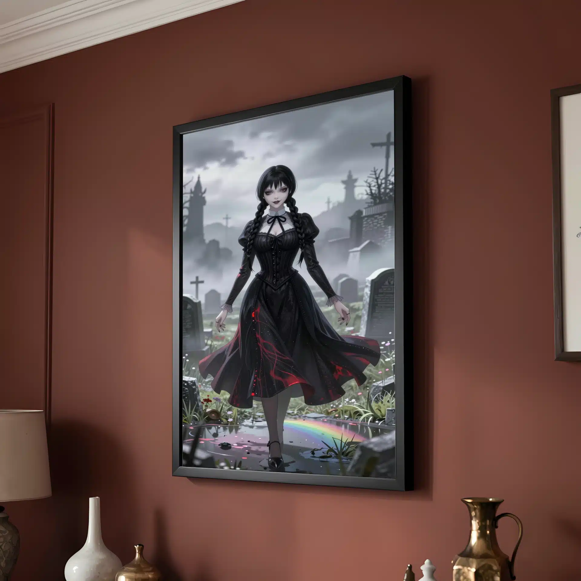 ونزدی آدامز در یک گورستان مهآلود و وسیع زیر آسمانی ابری ایستاده است. لباس سیاه نمادین او با جلوههای قرمز اتری تزئین شده و انعکاسهای رنگینکمانی ظریف در گودالهای زیر پایش دیده میشود. چهرهی رنگپریدهاش با موهای بافتهی تیره قاب شده و با نگاهی مرموز و لبخندی اسرارآمیز به بیننده خیره شده است.