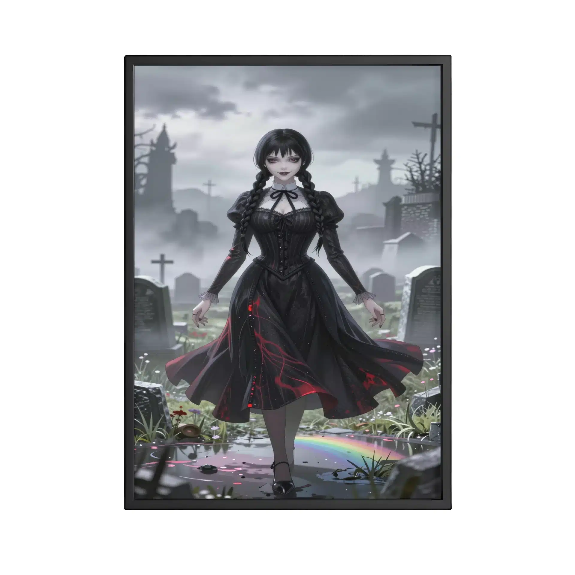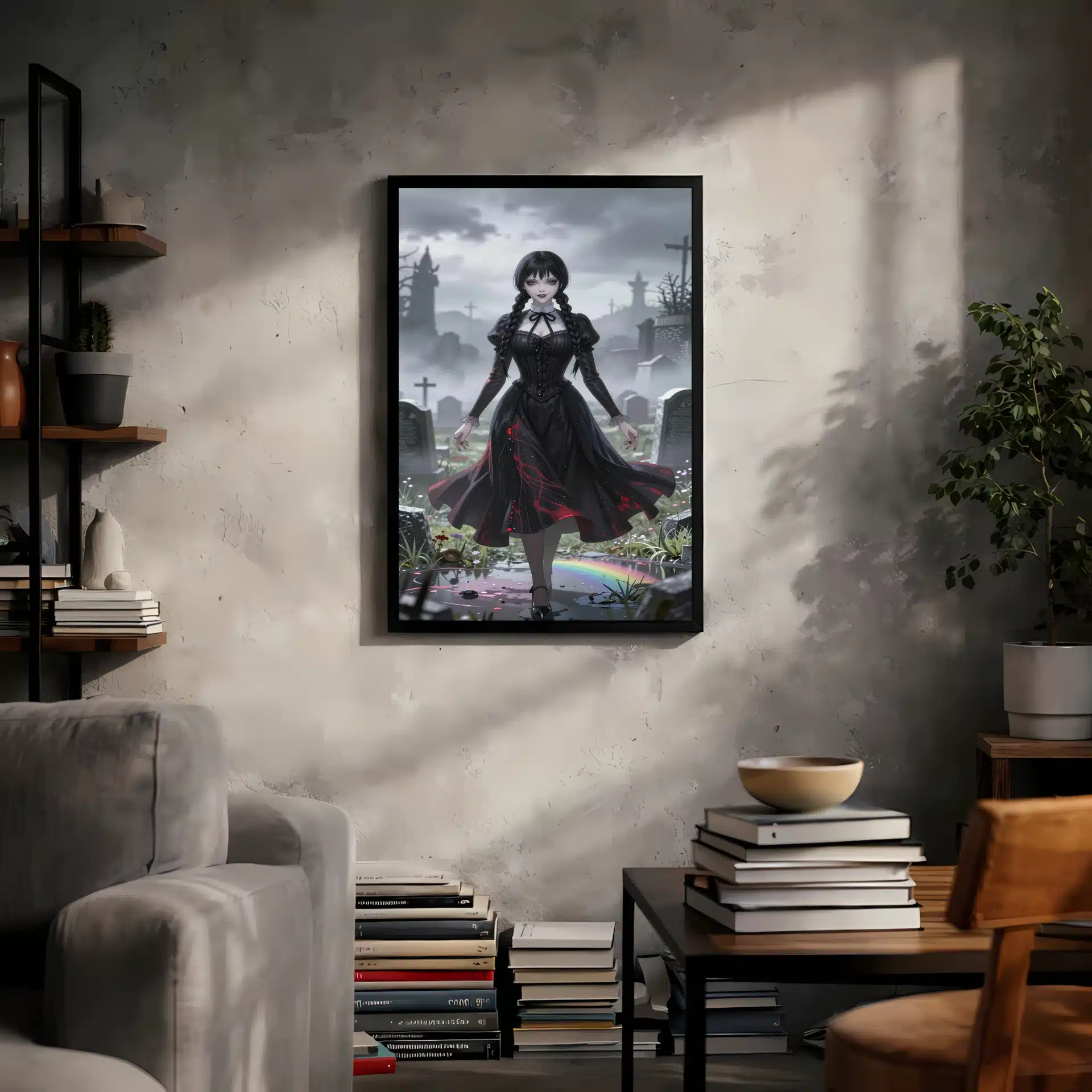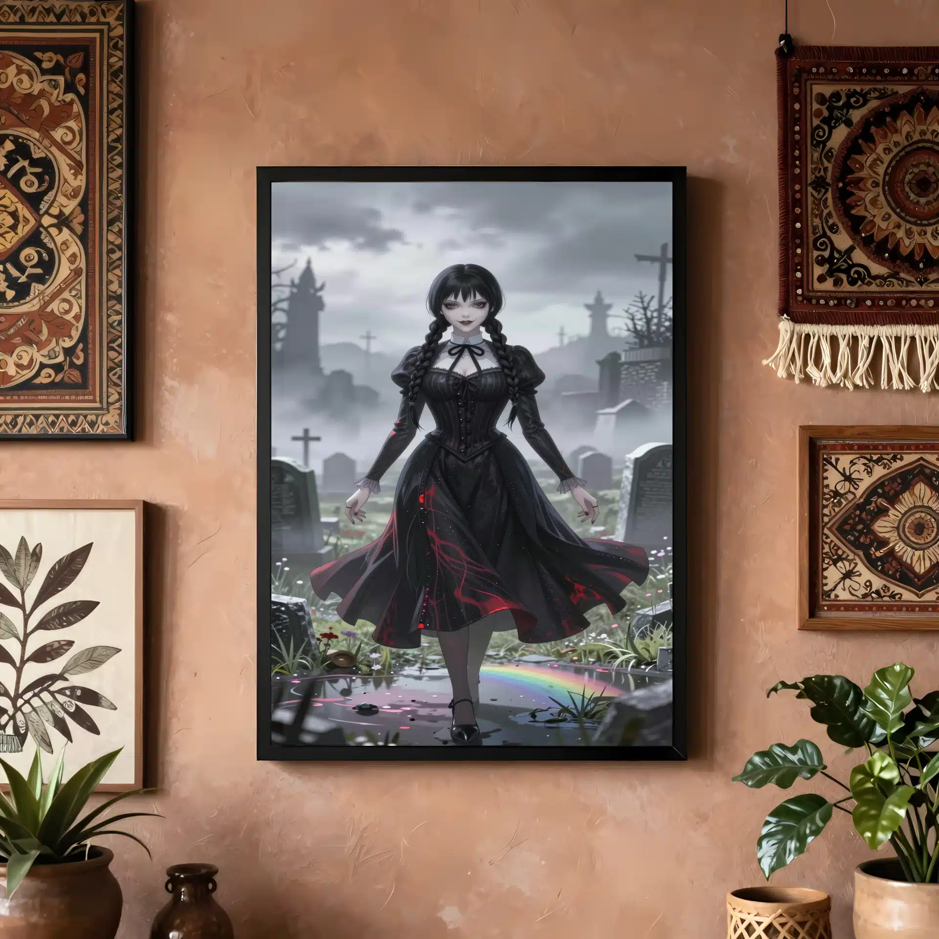 ونزدی آدامز در یک گورستان مهآلود و وسیع زیر آسمانی ابری ایستاده است. لباس سیاه نمادین او با جلوههای قرمز اتری تزئین شده و انعکاسهای رنگینکمانی ظریف در گودالهای زیر پایش دیده میشود. چهرهی رنگپریدهاش با موهای بافتهی تیره قاب شده و با نگاهی مرموز و لبخندی اسرارآمیز به بیننده خیره شده است.
