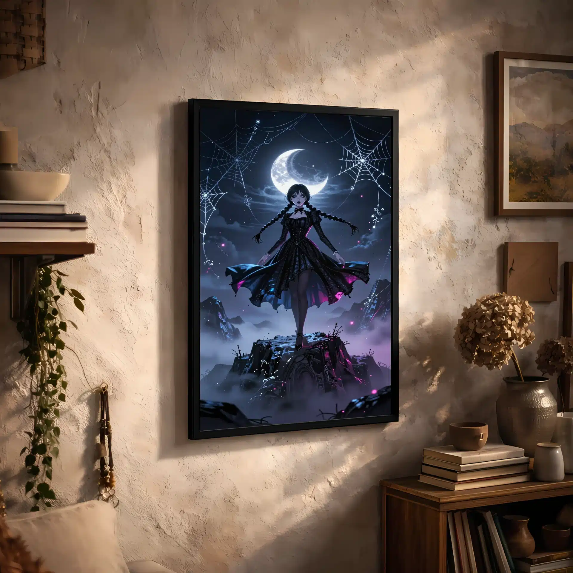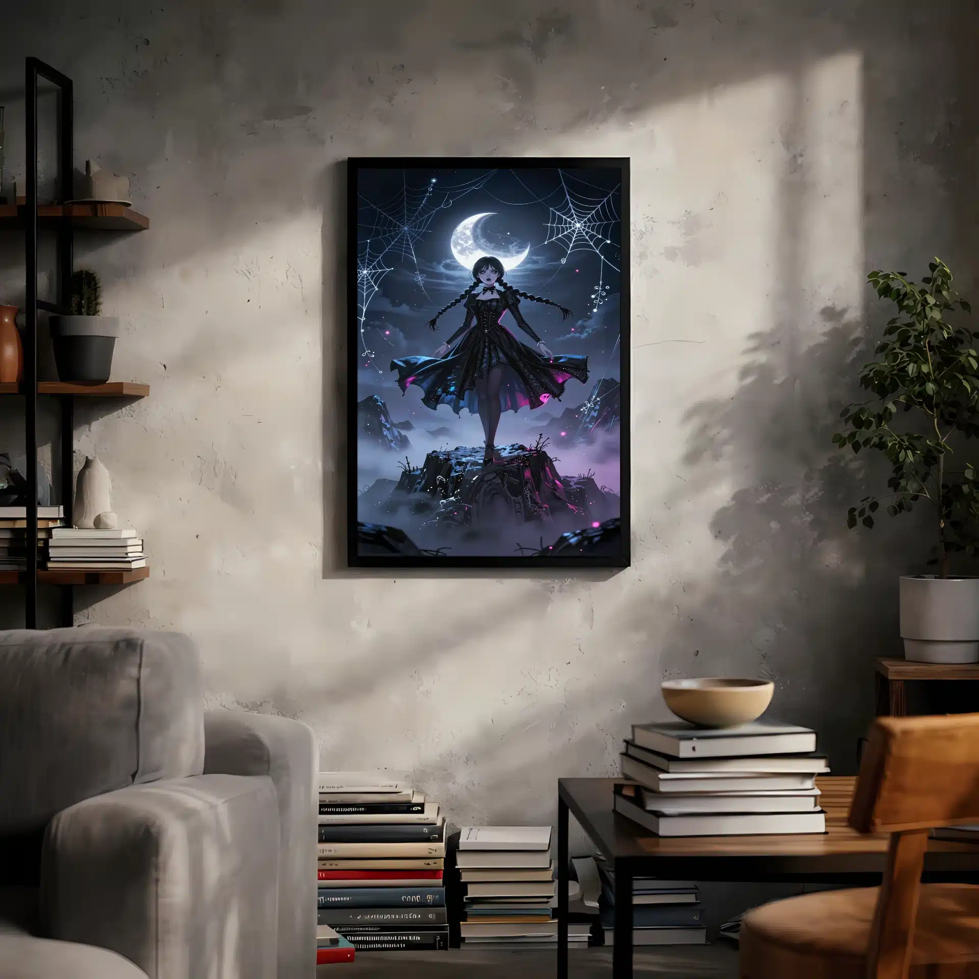 این طراحی فوقالعاده با جزئیات 8K، شامل تارعنکبوتهای نقرهای درخشان و الگوهای گوتیک ارگانیک است که حول او میچرخند. اثر فیشآی و ذرات اتری، ترکیبی جذاب از فانتزی تاریک و هایلایتهای نئون سایبرگوتیک را ایجاد میکند.