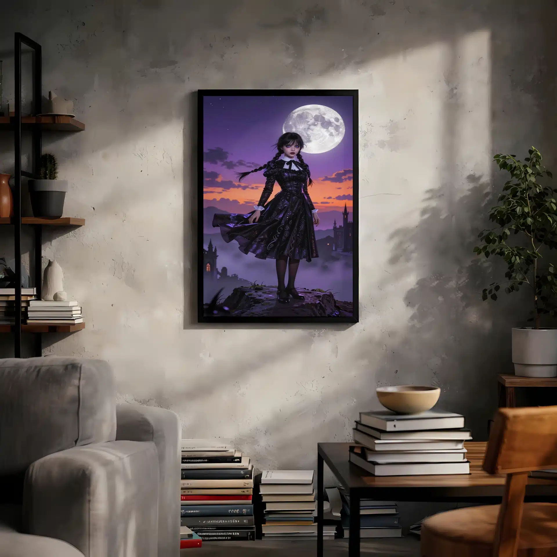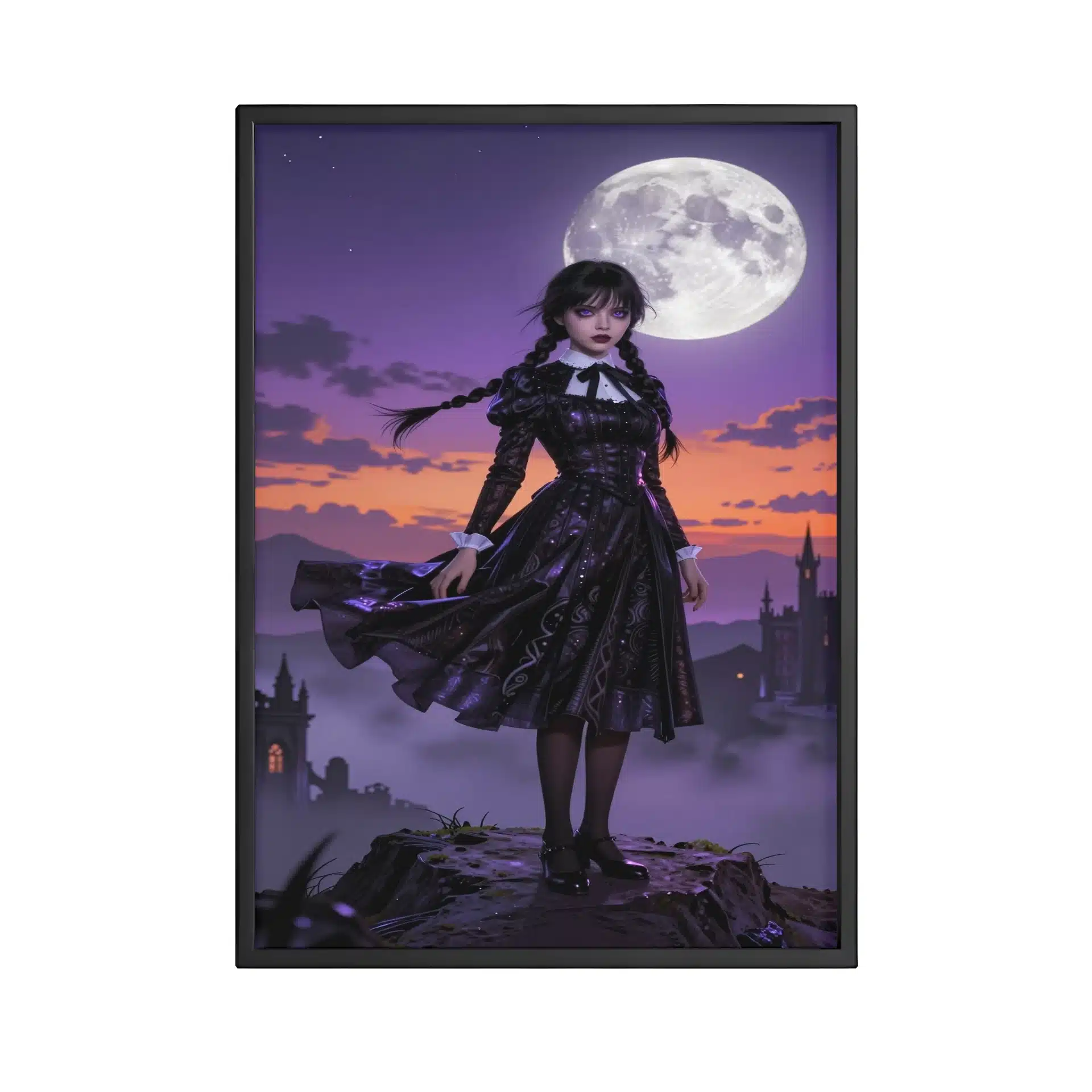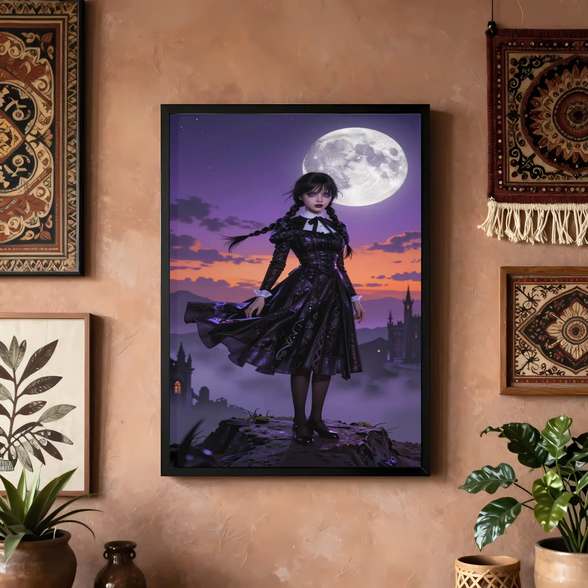 این قاب عکس خیرهکننده از ونزدی آدامز، با الهام از سبک انیمه، صحنهای تماشایی از او را روی قلهای ماهتابخورده به تصویر میکشد. لباس سیاه نمادین او در باد به حرکت درآمده و با نوری نئونی مرموز روشن شده است.