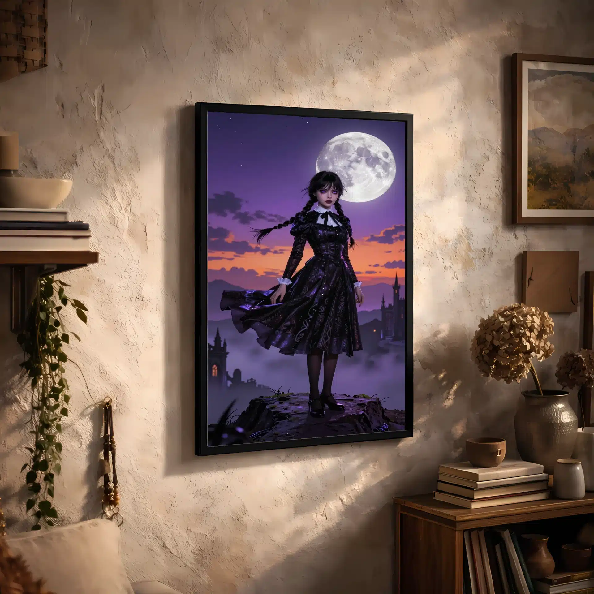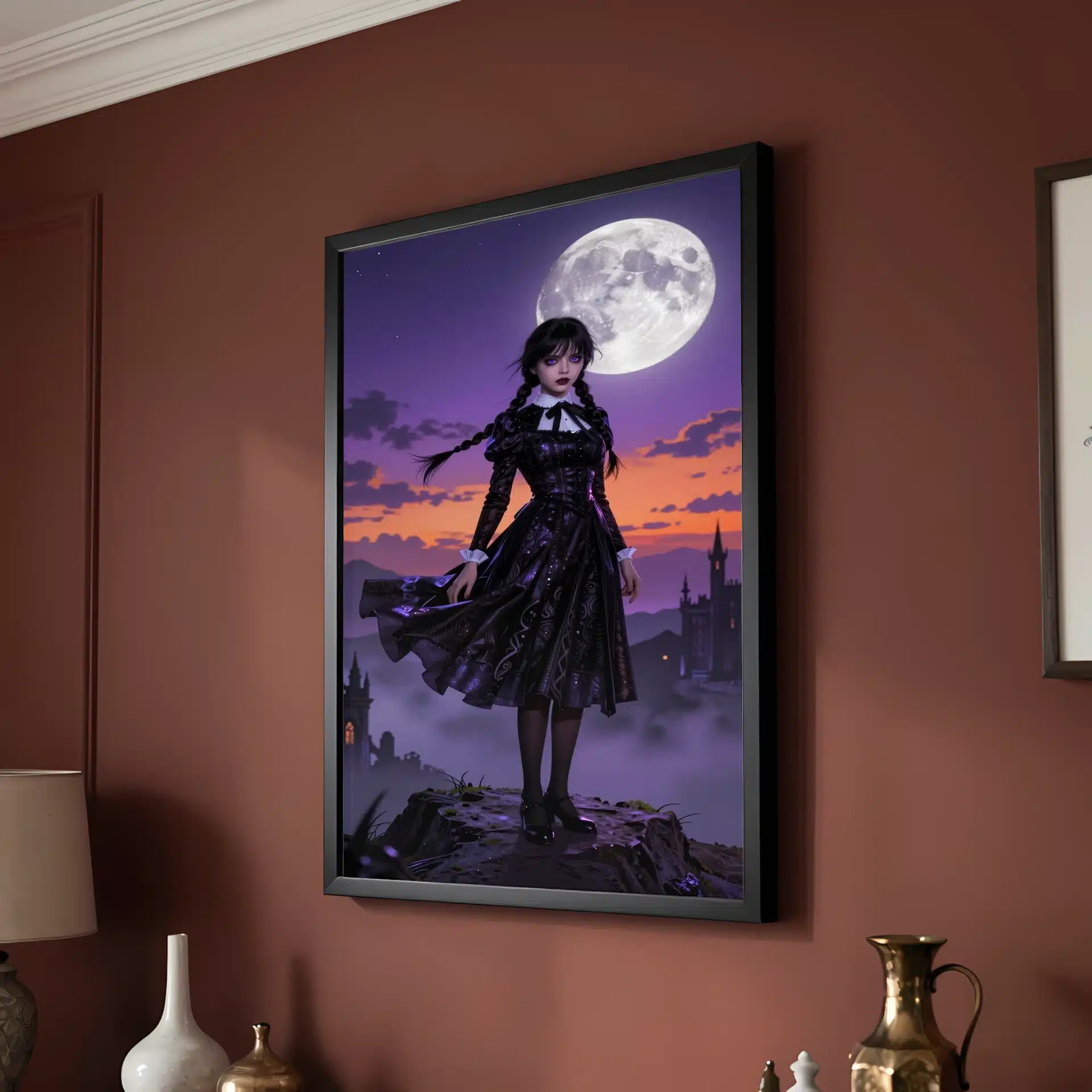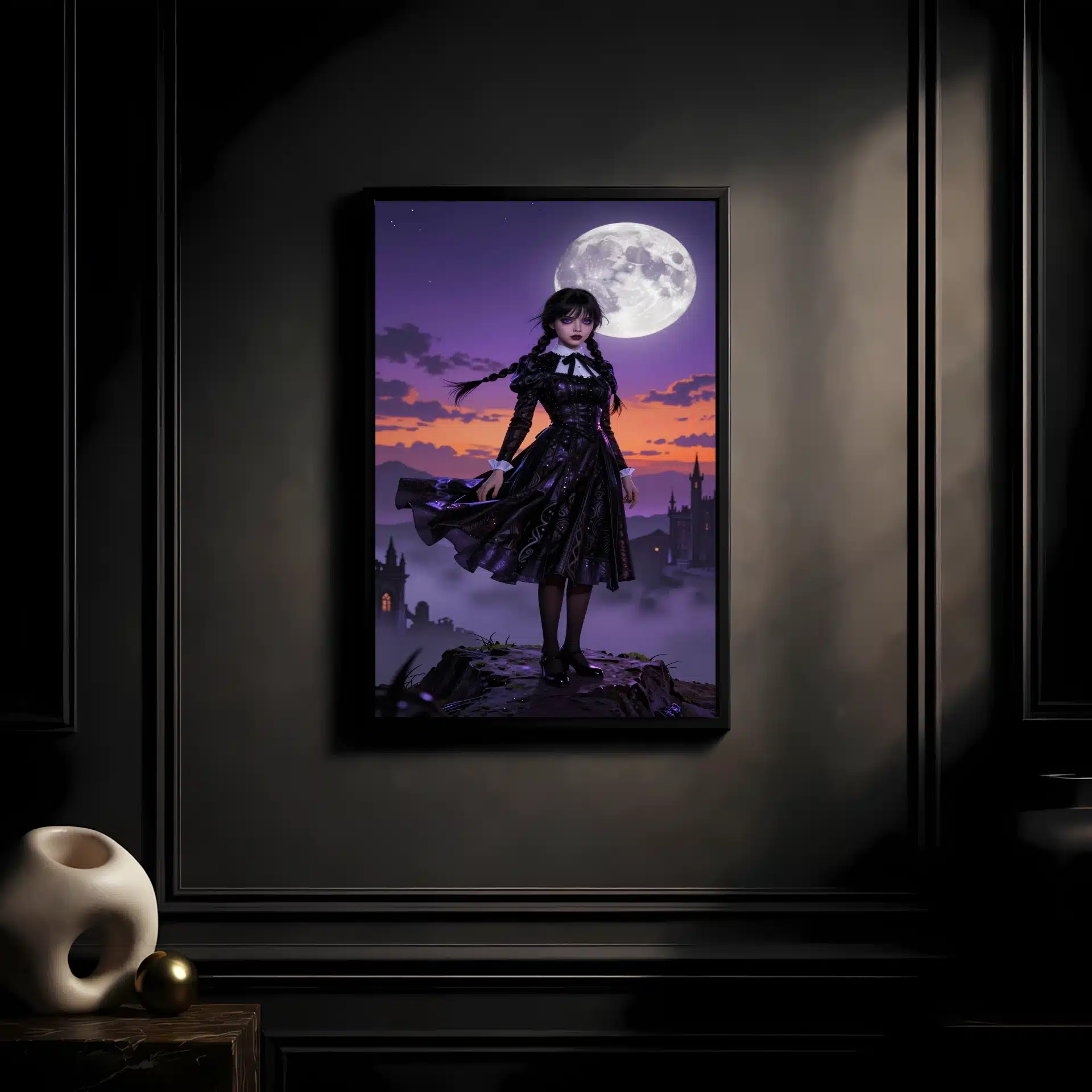 طرح با جزئیات فوقالعاده در رزولوشن 8K، ترکیب رنگهای بنفش و نارنجی غروب با نور نقرهای ماه، و معماری گوتیک مخروبه، حس اسرارآمیزی را به بیننده منتقل میکند.