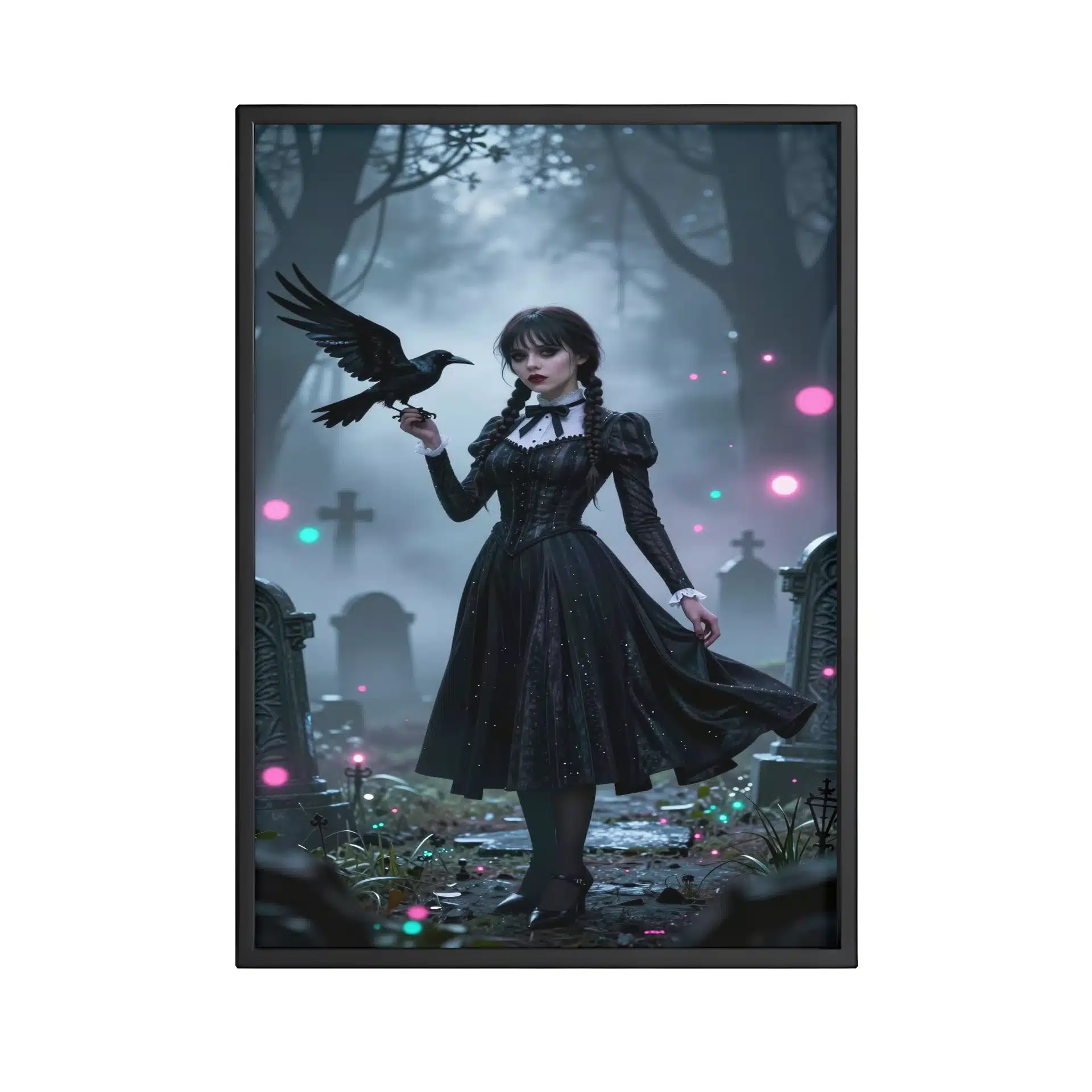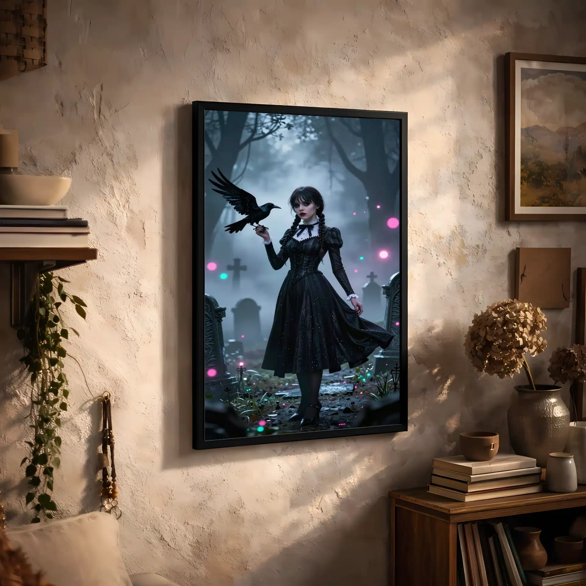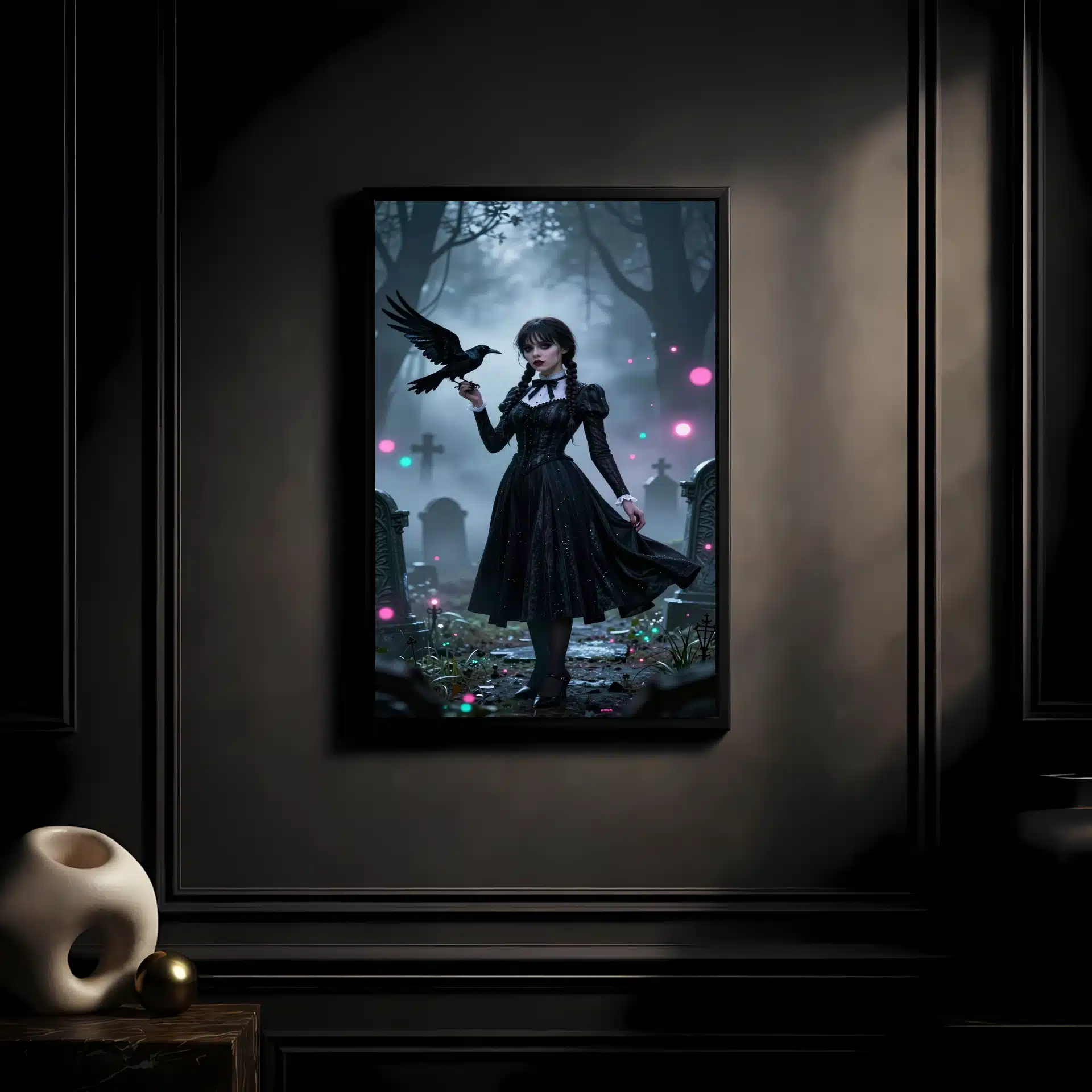 ونزدی با لباس سیاه نمادین خود در حالی که یک کلاغ در دست دارد، در میان مههای حجمی و نورپردازی چشمنواز ایستاده است. سنگقبرهای گوتیک و افکت بوکههای درخشان، عمق سینمایی به این تصویر بخشیدهاند.