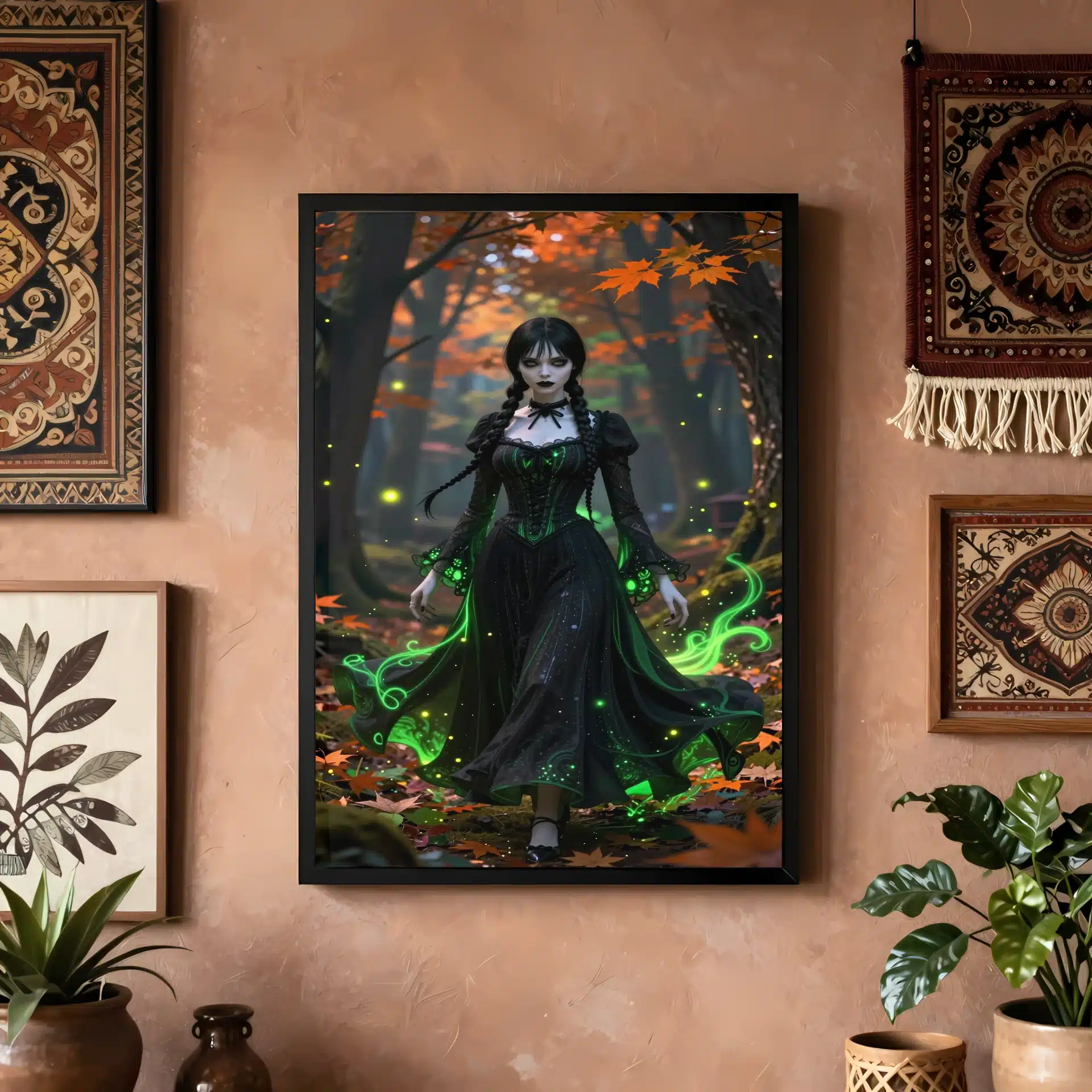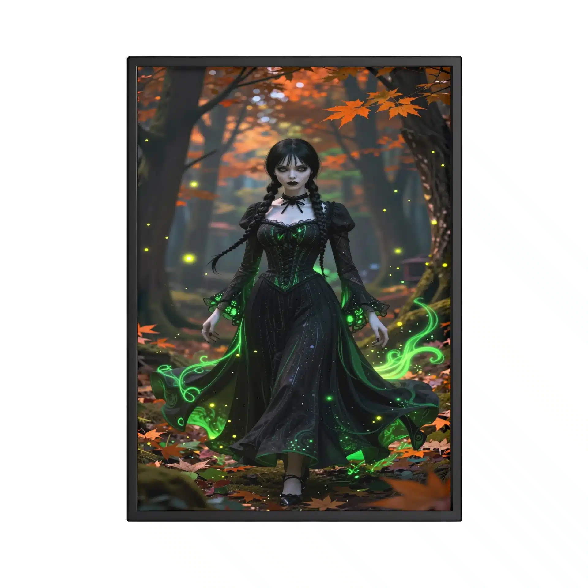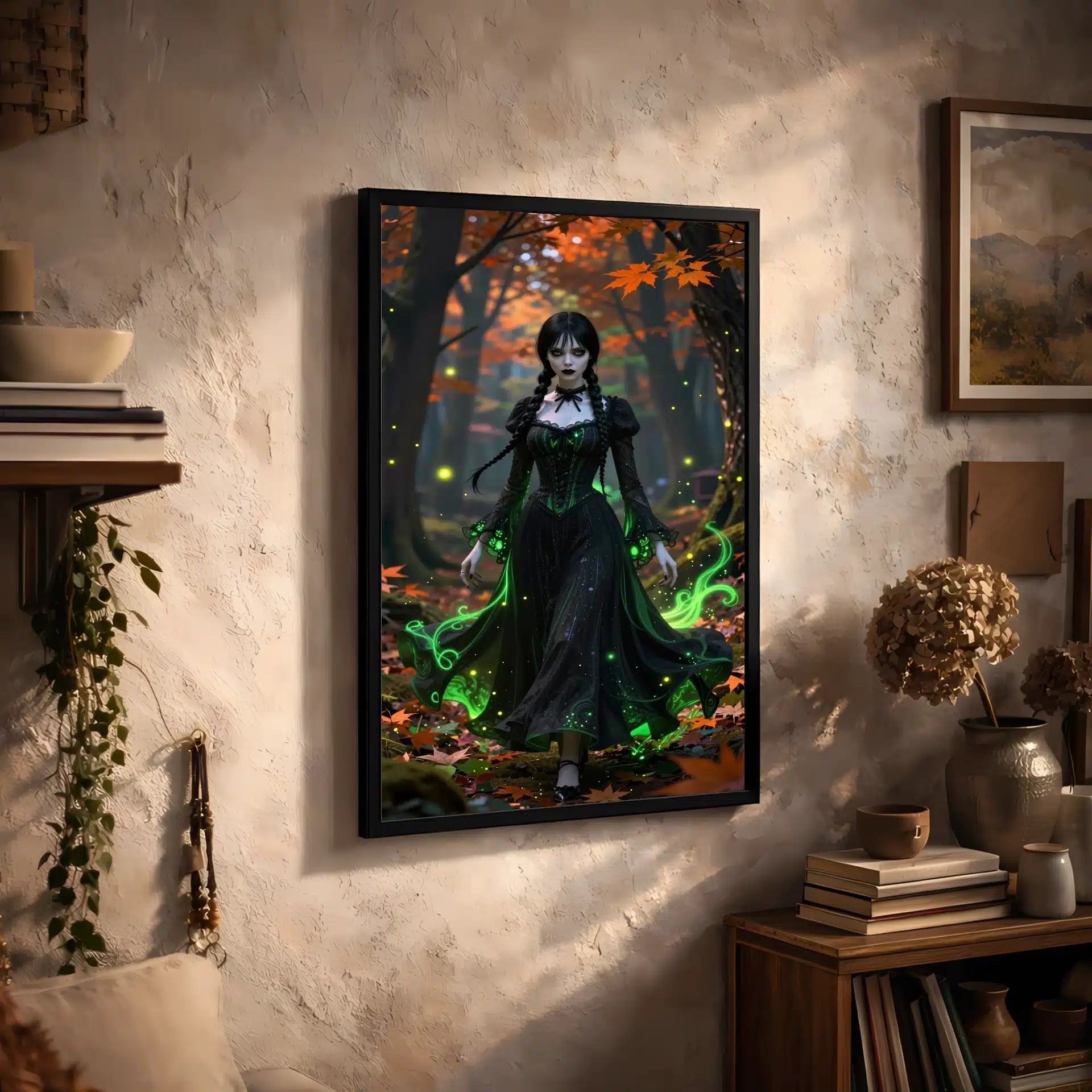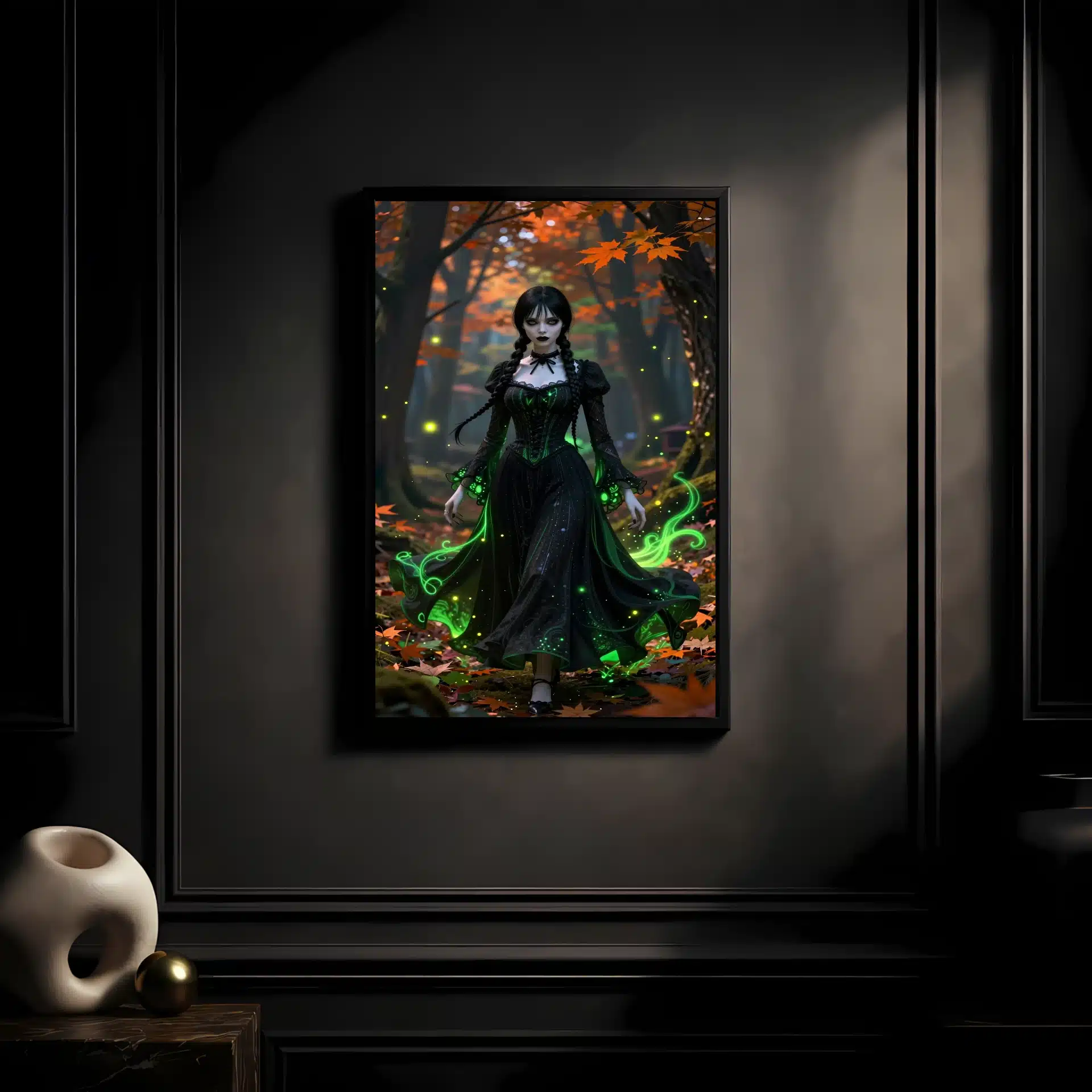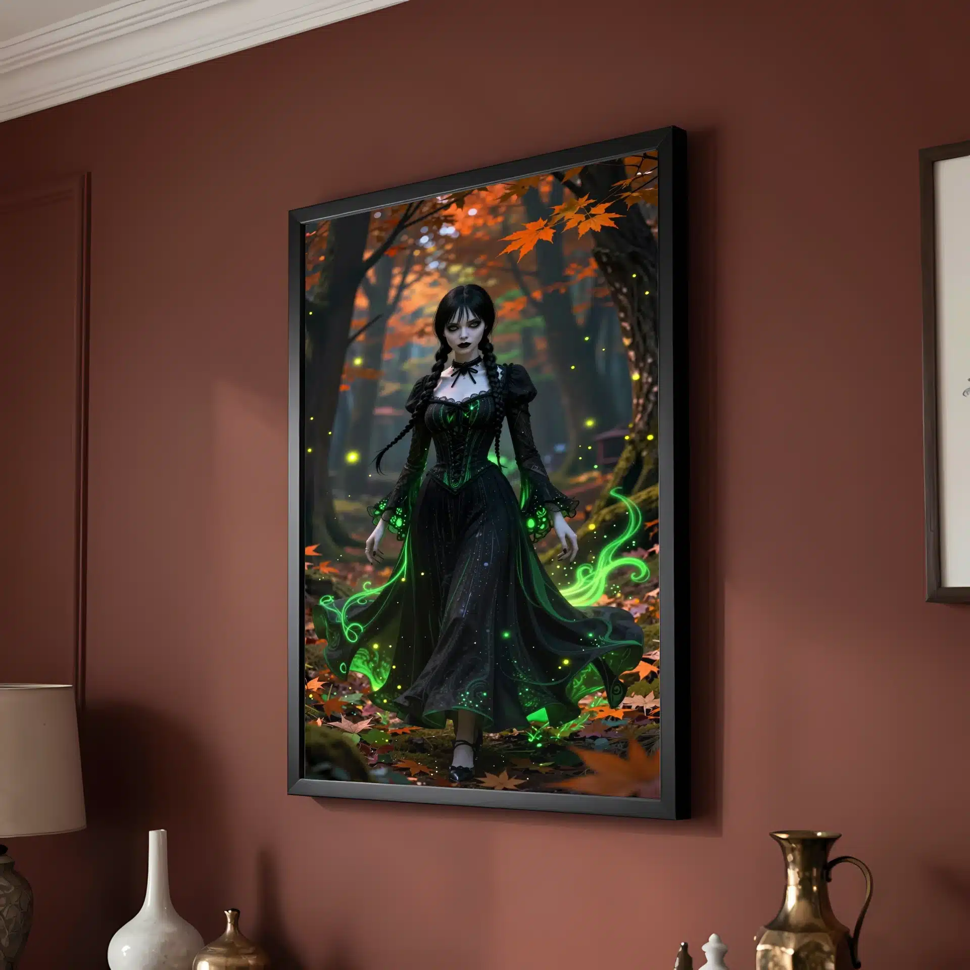 ونزدی آدامز در یک جنگل اسرارآمیز پاییزی در غروب آفتاب ایستاده است. لباس سیاه نمادین او با جلوههای نئون سبز اتری تزئین شده و برگهای نارنجی و زمردین به دورش میچرخند. نورپردازی سینمایی سایههای دراماتیک ایجاد کرده و کرمهای شبتاب و ذرات اسرارآمیز درخشان فضایی جادویی به تصویر میبخشند.