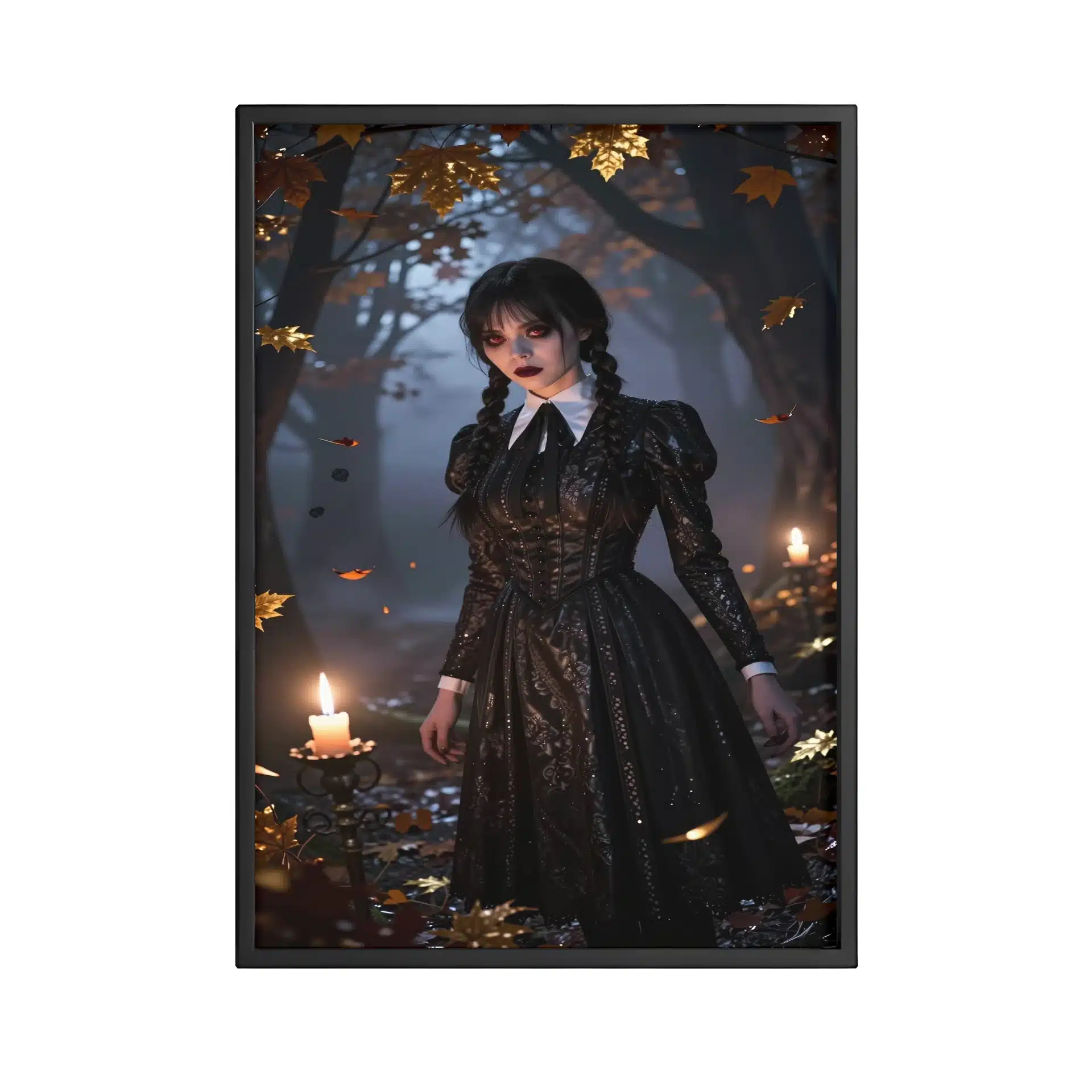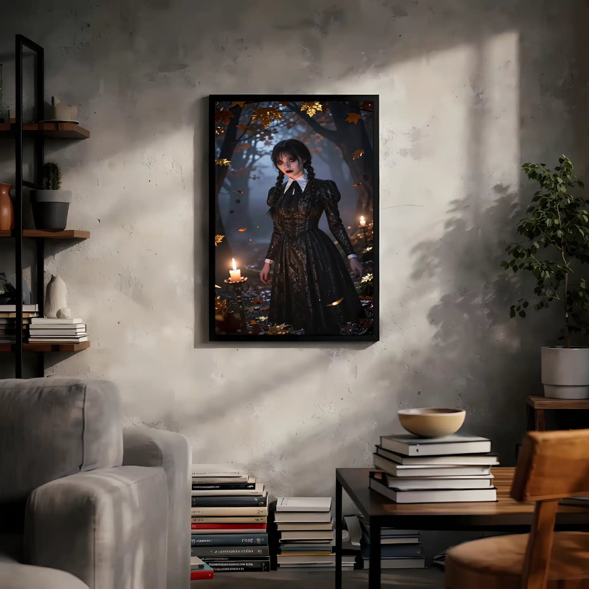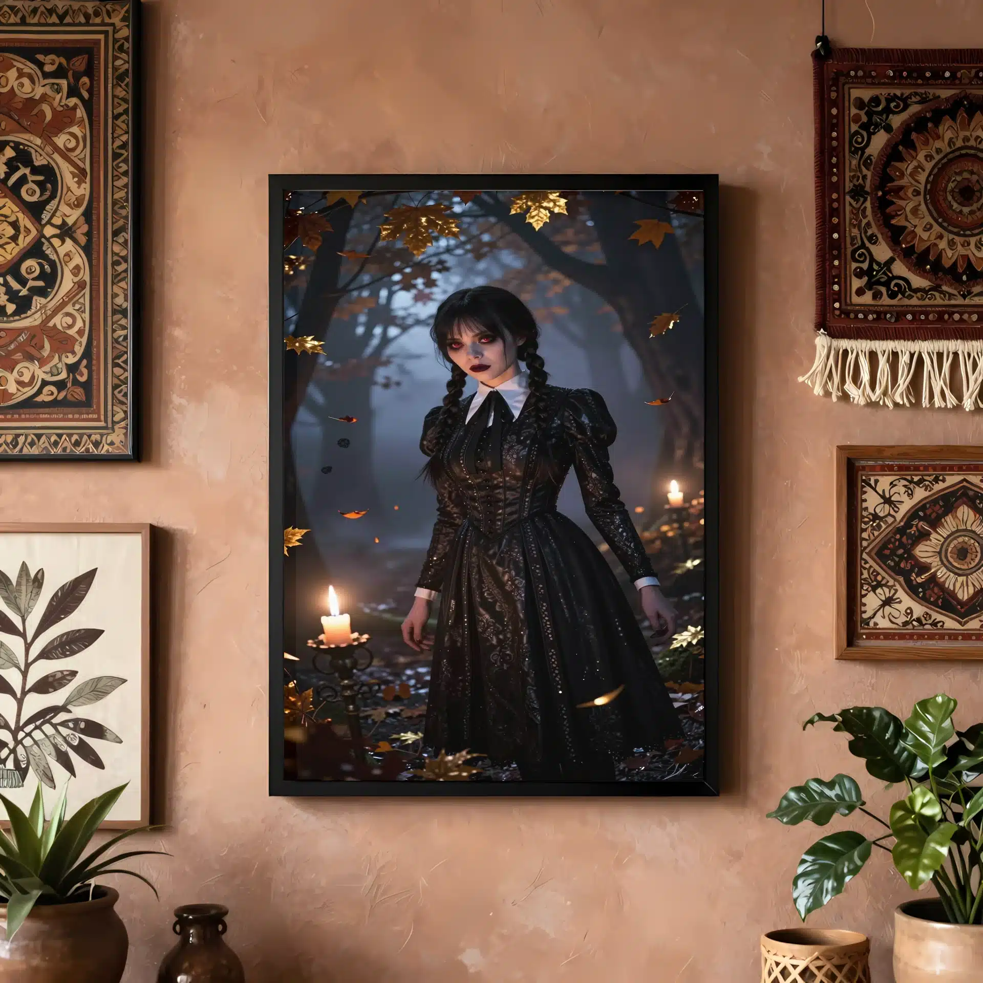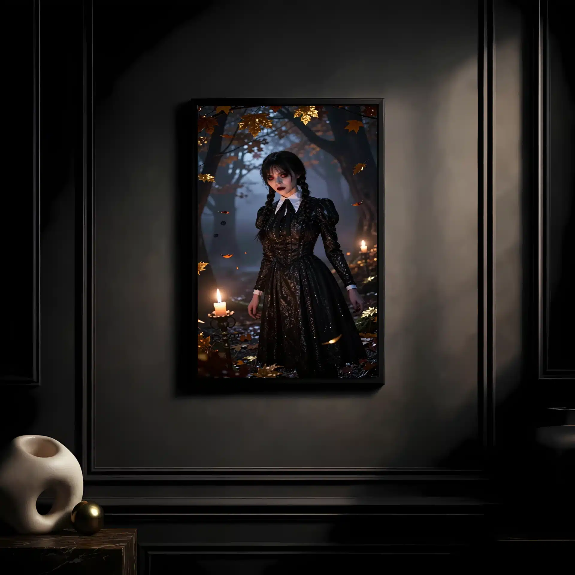 والپیپر انیمهای استادانه از ونزدی آدامز که در جنگلی اسرارآمیز و مهآلود در گرگومیش ایستاده است. نور شمعهای در حال تابش، سایههای نمایشی روی صورت رنگپریدهاش میاندازد و چشمانش به رنگ قرمز کمرنگ میدرخشند. این تصویر جذابیت مرموز او را در فضایی رویایی و تاریک به تصویر میکشد.