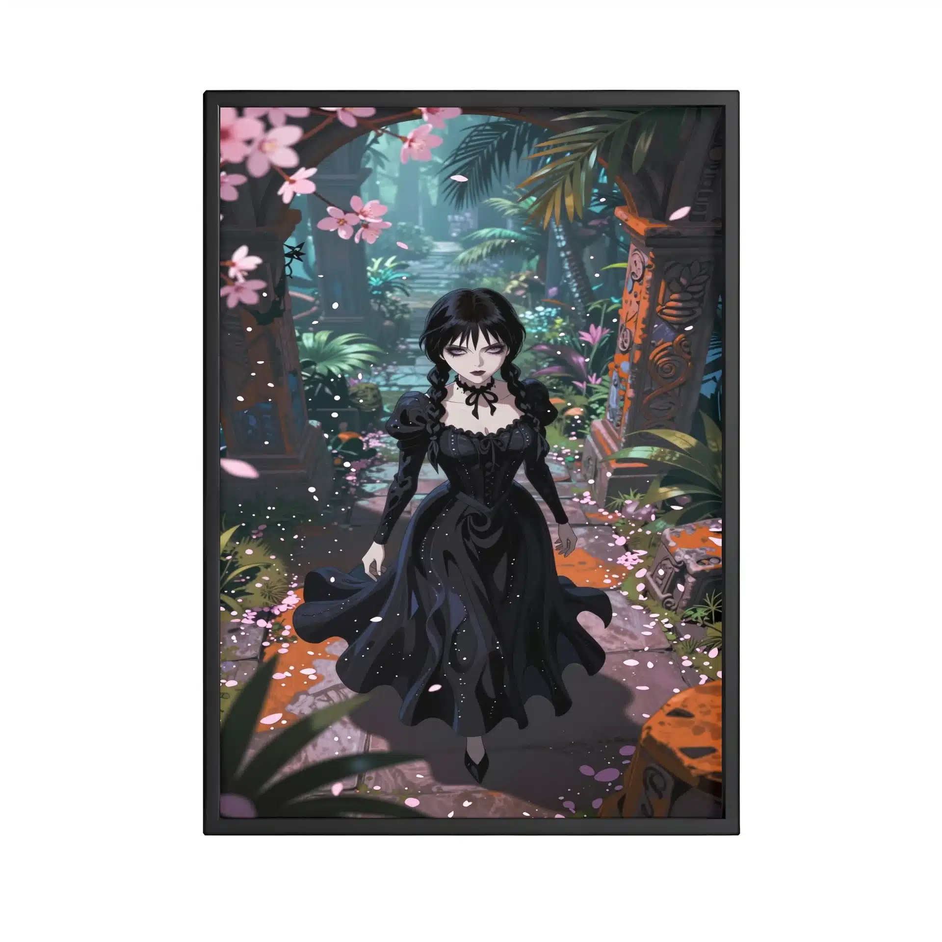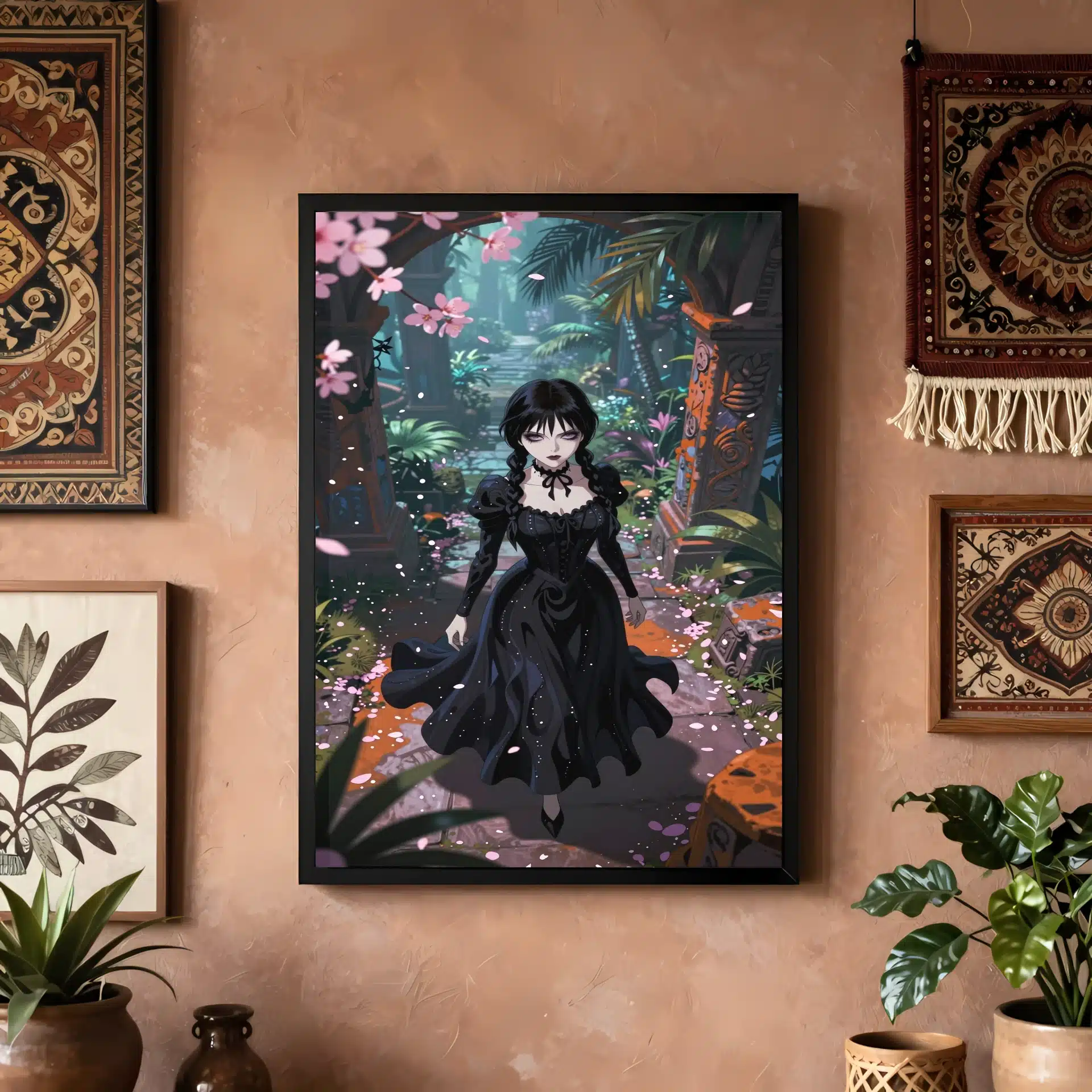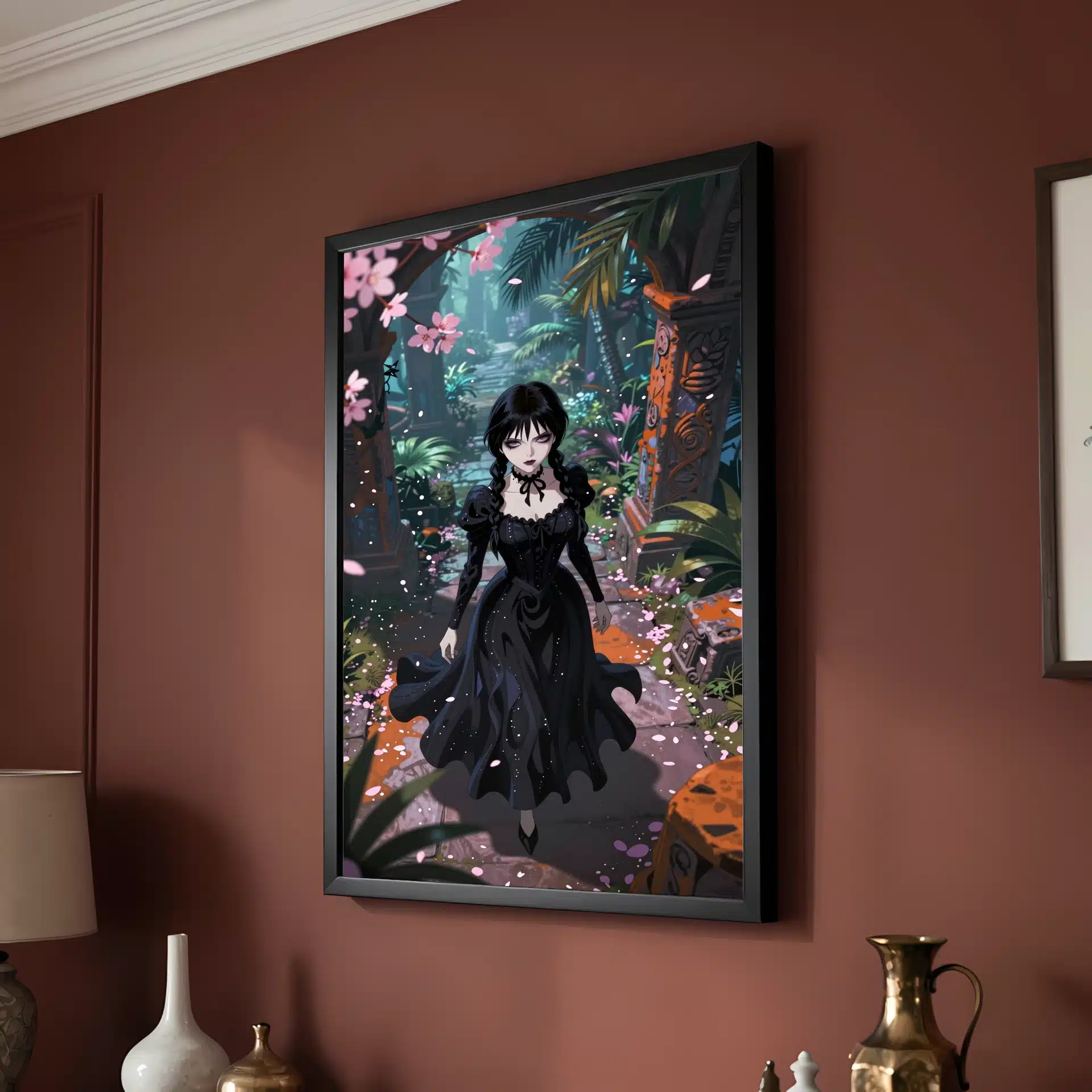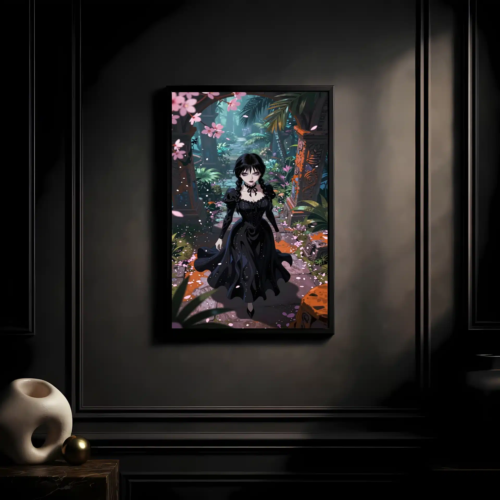 تصویر یک اثر هنری به سبک انیمه از ونزدی آدامز را به نمایش میگذارد که در میان ویرانههای باستانی و سرسبز مناطق گرمسیری ایستاده است. لباس سیاه نمادین او با فرمهای ارگانیک و موجدار در نور فلورسنت سرد به تصویر کشیده شده است.