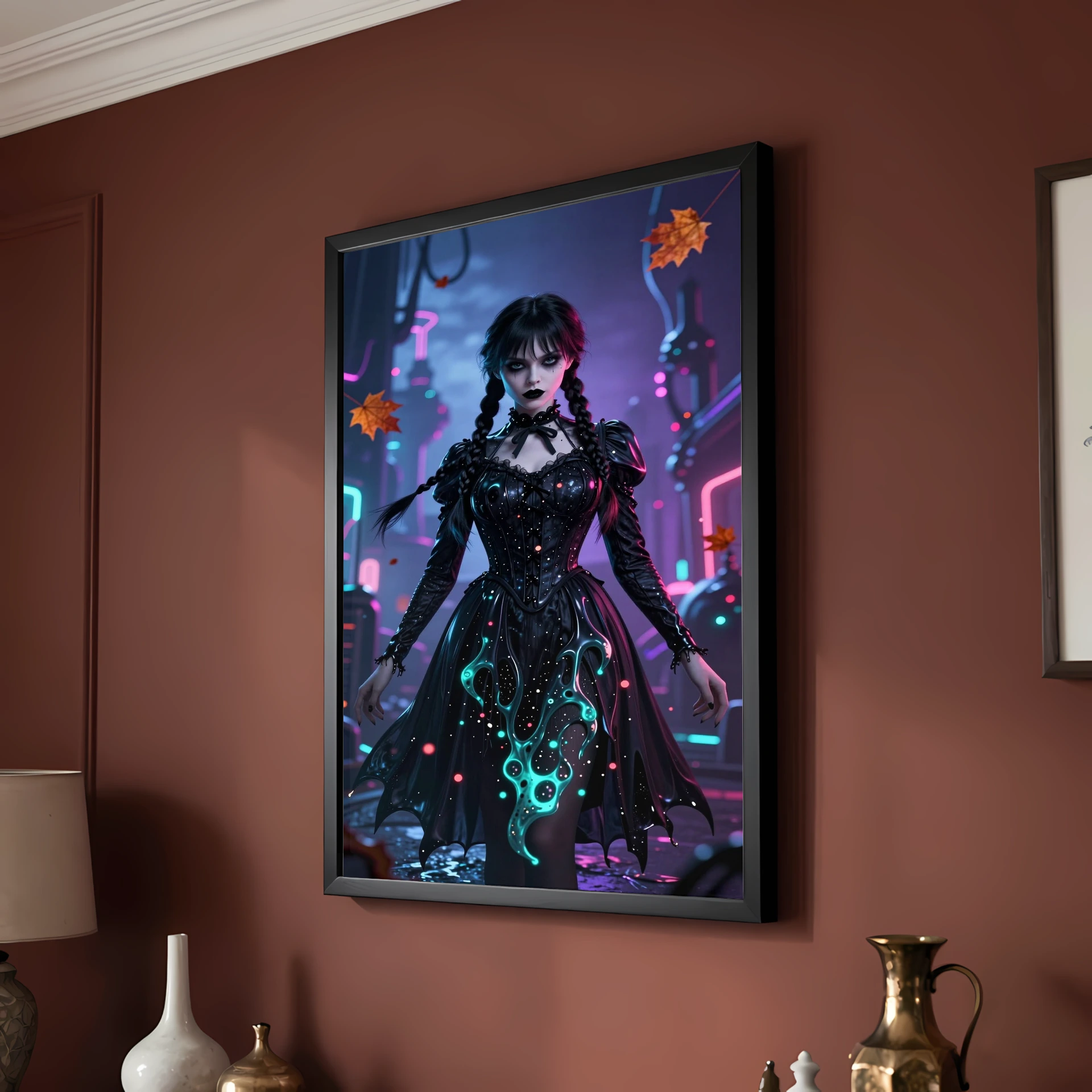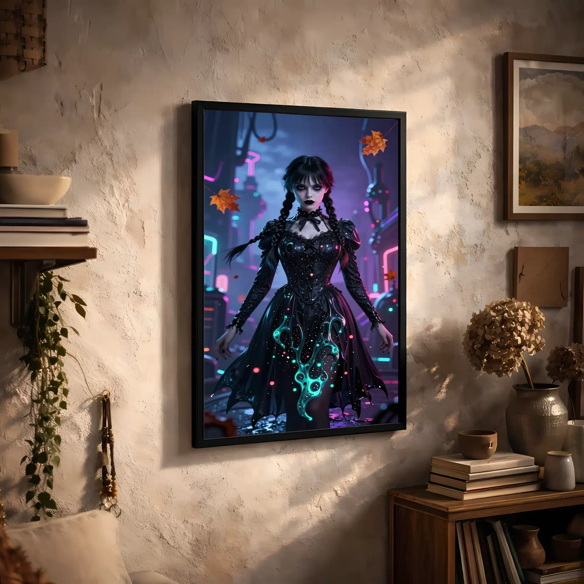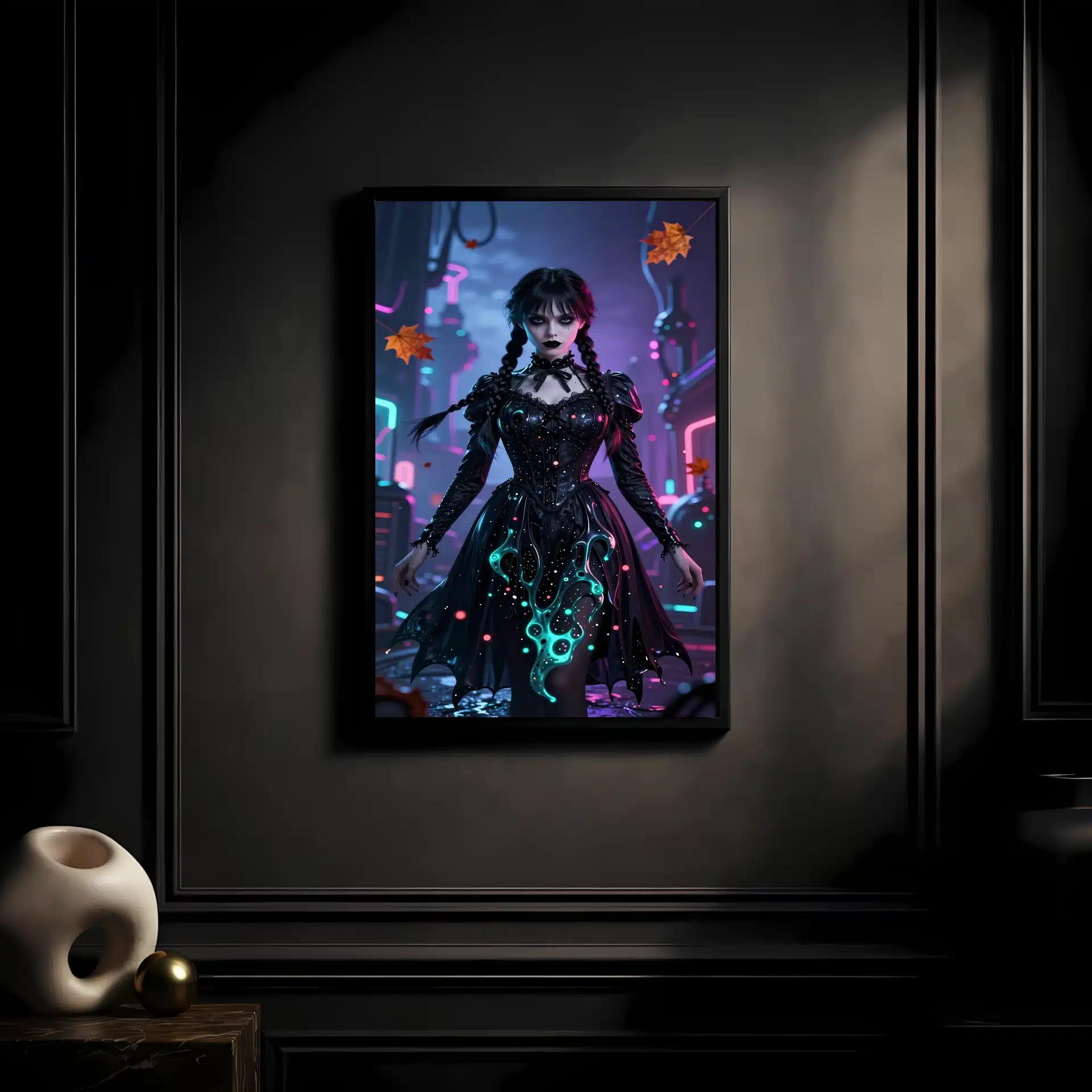 این قاب عکس از ونزدی آدامز، با الهام از سبک انیمه و فضای نئون شهری طراحی شده است. ترکیب تاریک و گوتیک شخصیت با المانهای سیبرپانک، تصویری خیرهکننده و منحصر به فرد خلق کرده است.