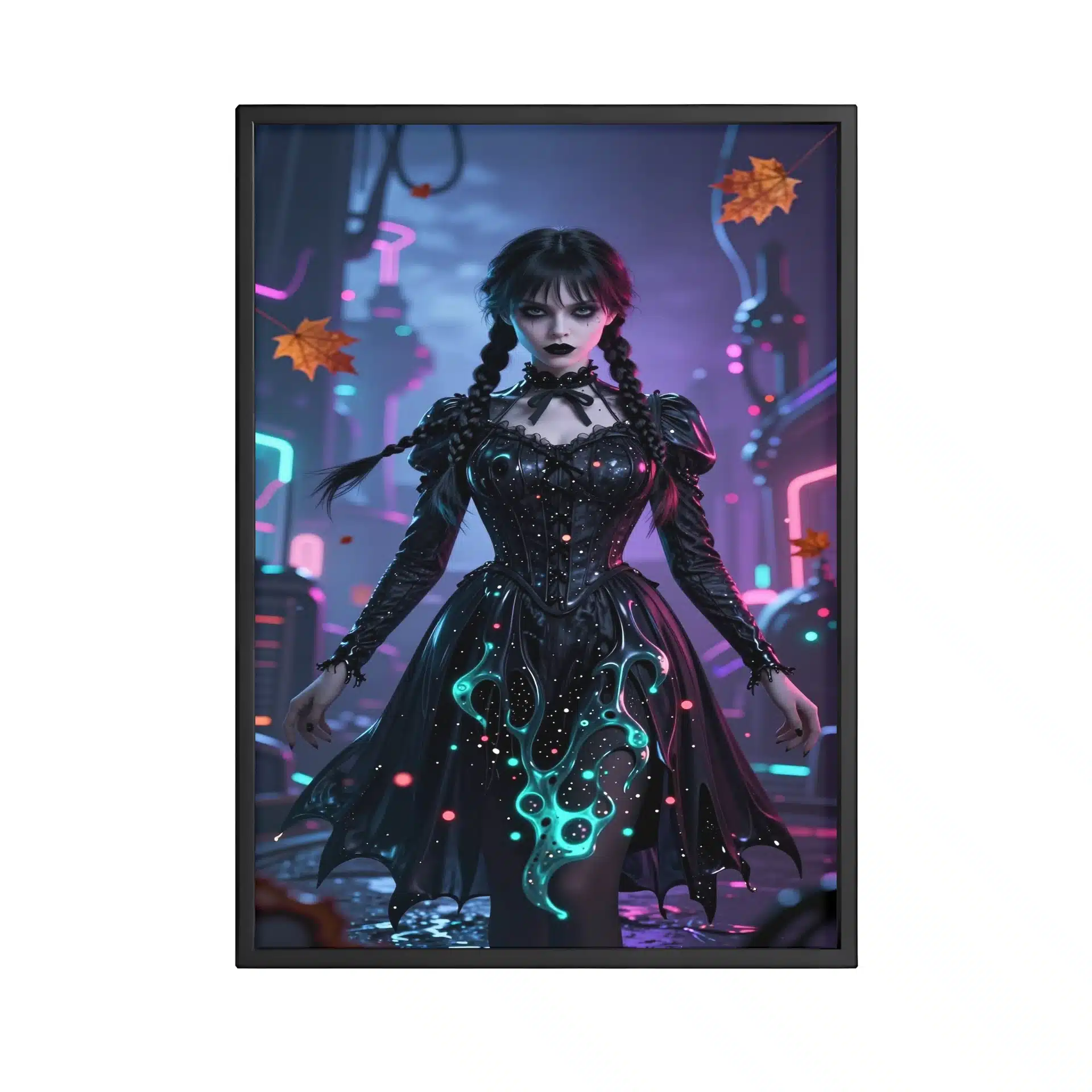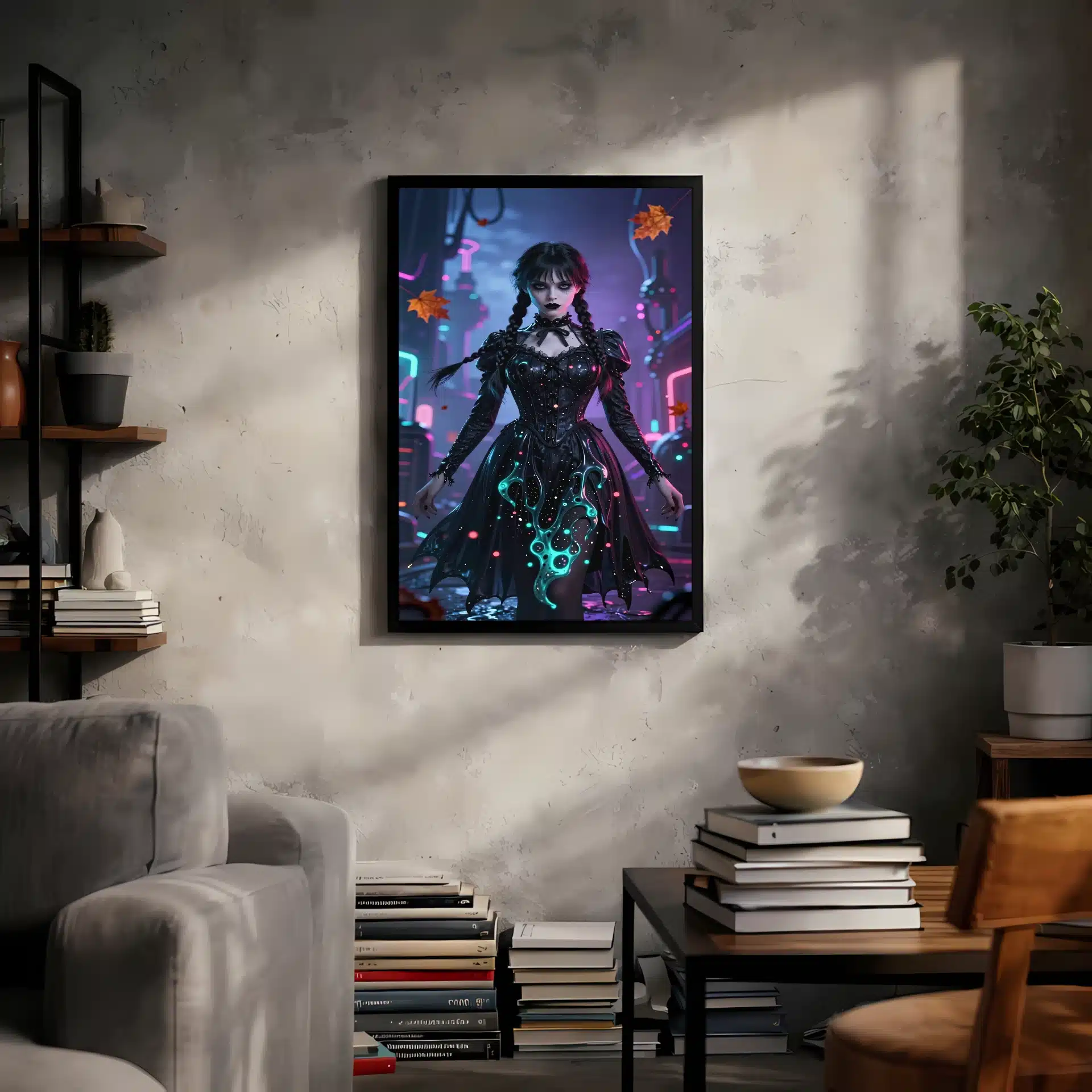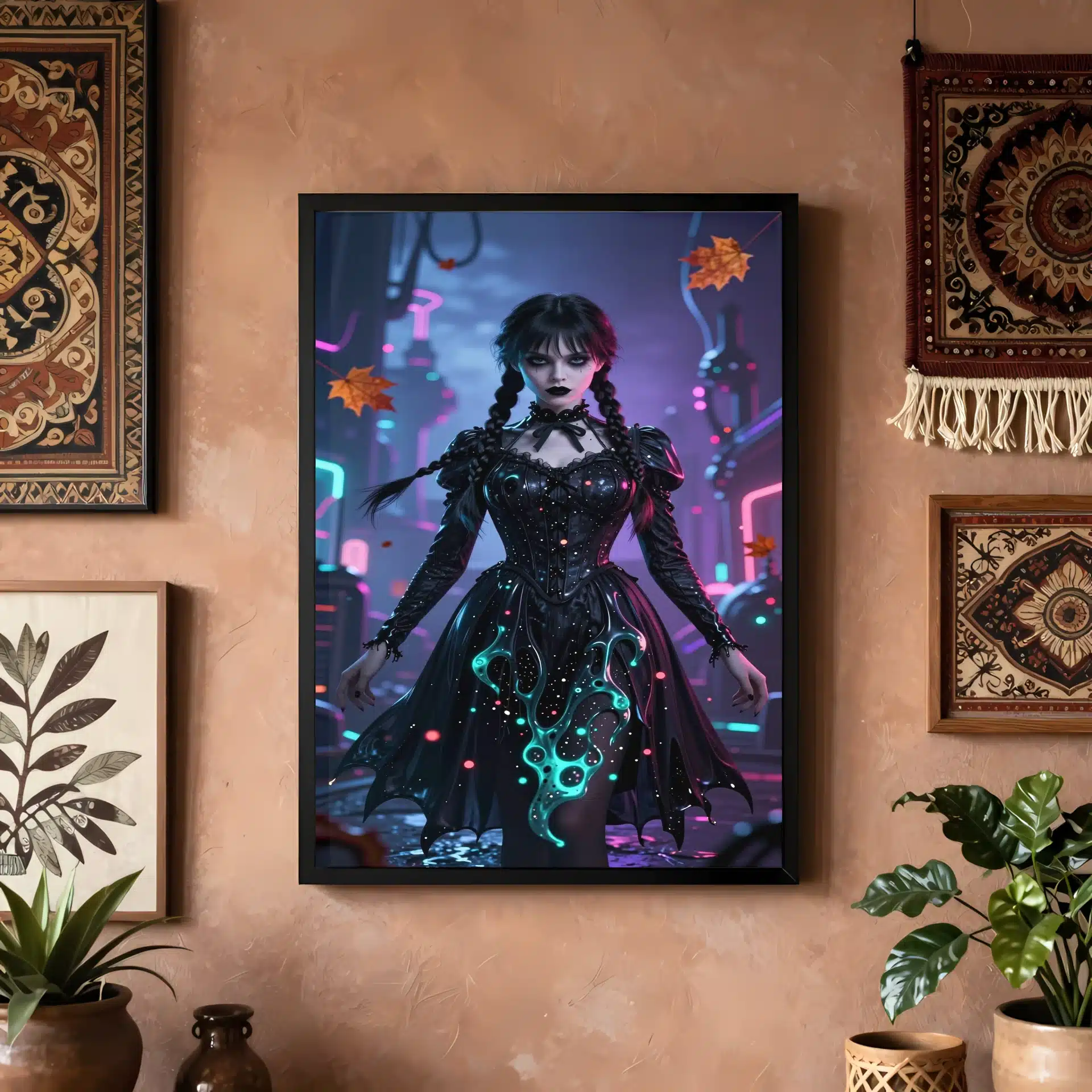 این قاب عکس از ونزدی آدامز، با الهام از سبک انیمه و فضای نئون شهری طراحی شده است. ترکیب تاریک و گوتیک شخصیت با المانهای سیبرپانک، تصویری خیرهکننده و منحصر به فرد خلق کرده است.