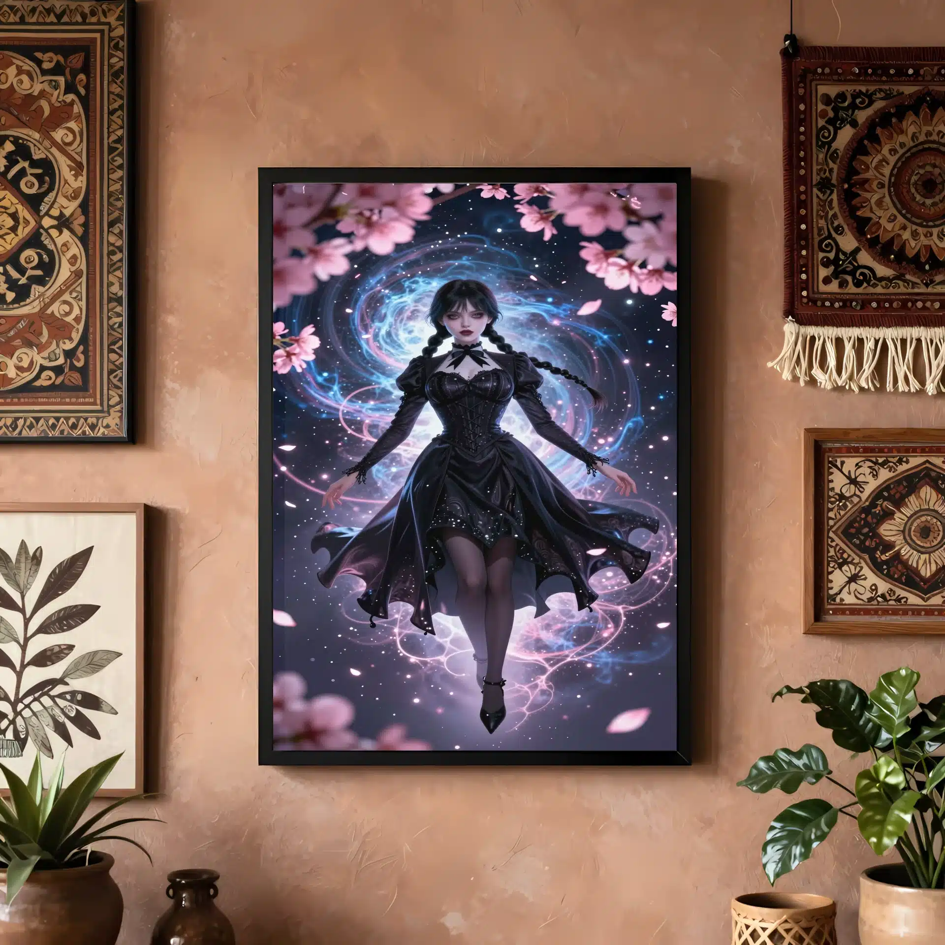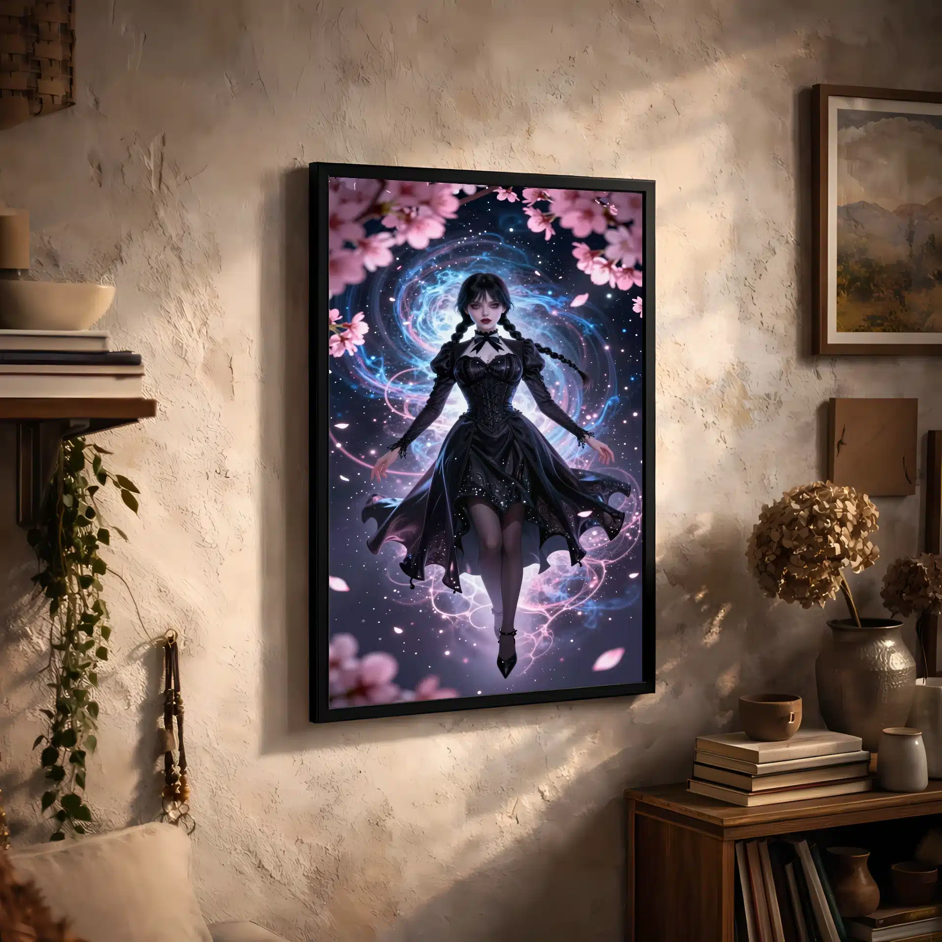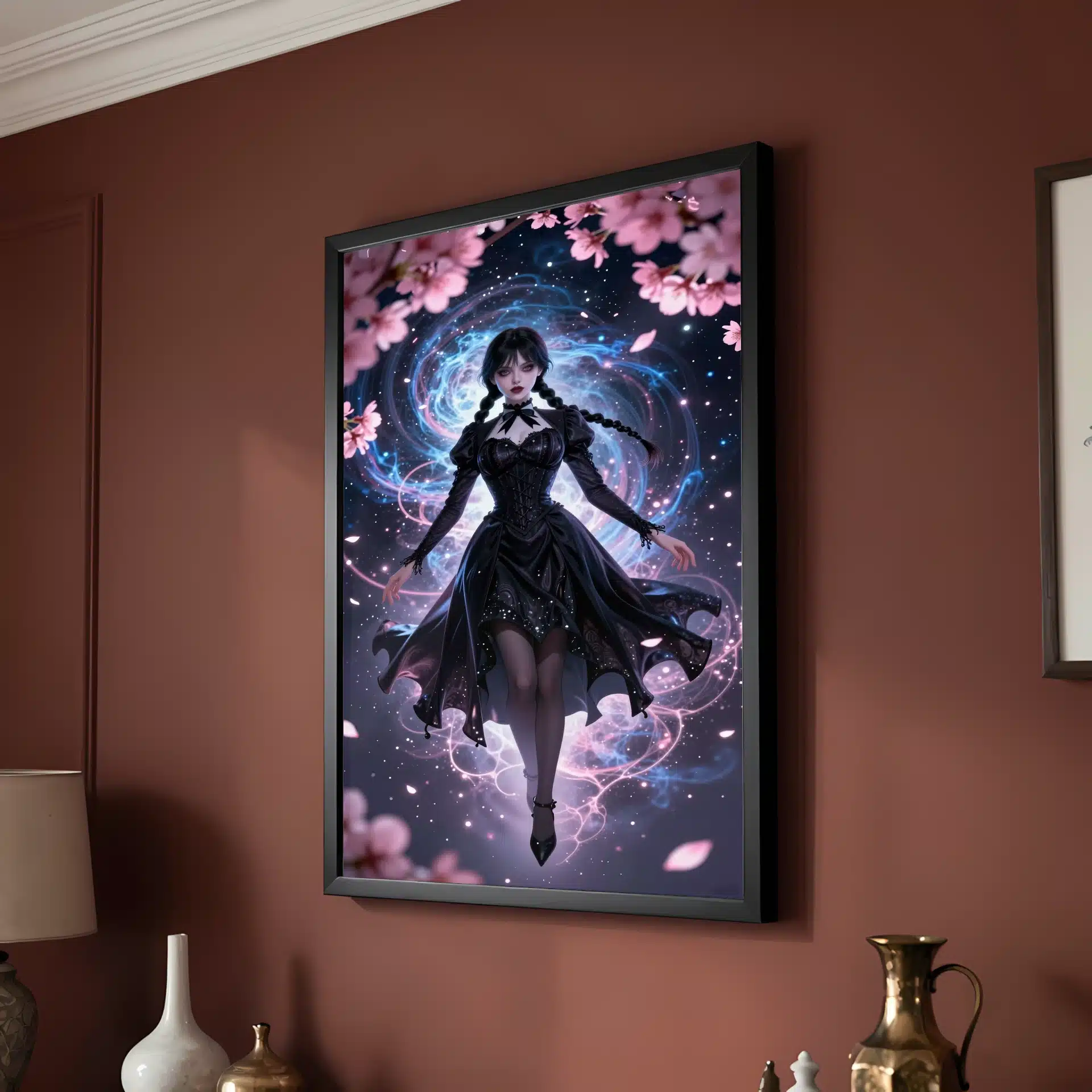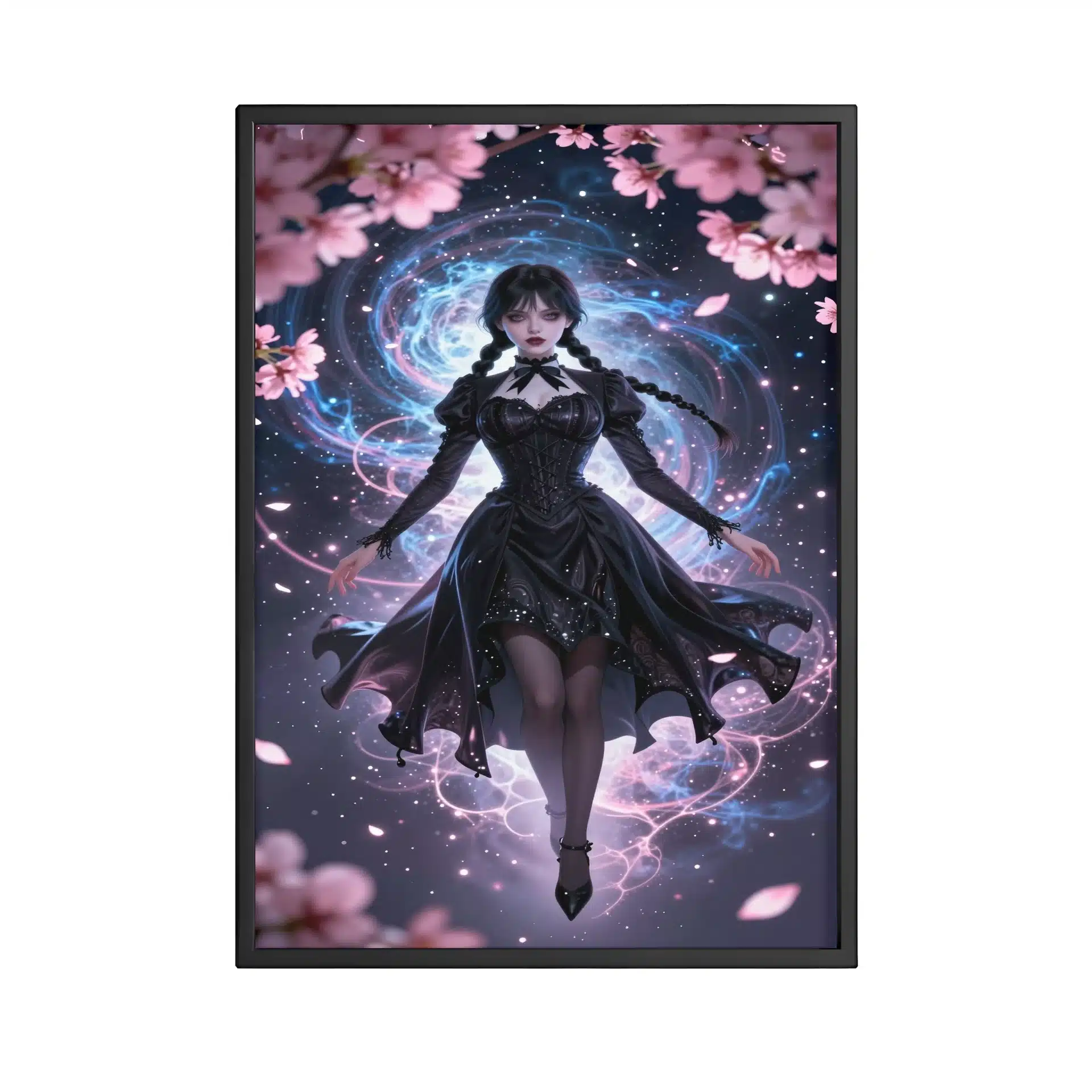 ونزدی آدامز در یک پرتره جذاب به سبک انیمه، به صورت بیوزن در فضای بیرونی شناور است و با گلبرگهای ساکورای نئونی که با هالهای صورتی ماورایی میدرخشند، احاطه شده است. این تصویر ترکیبی منحصر به فرد از جذابیت گوتیک و ظرافت آیندهنگرانه را ارائه میدهد.