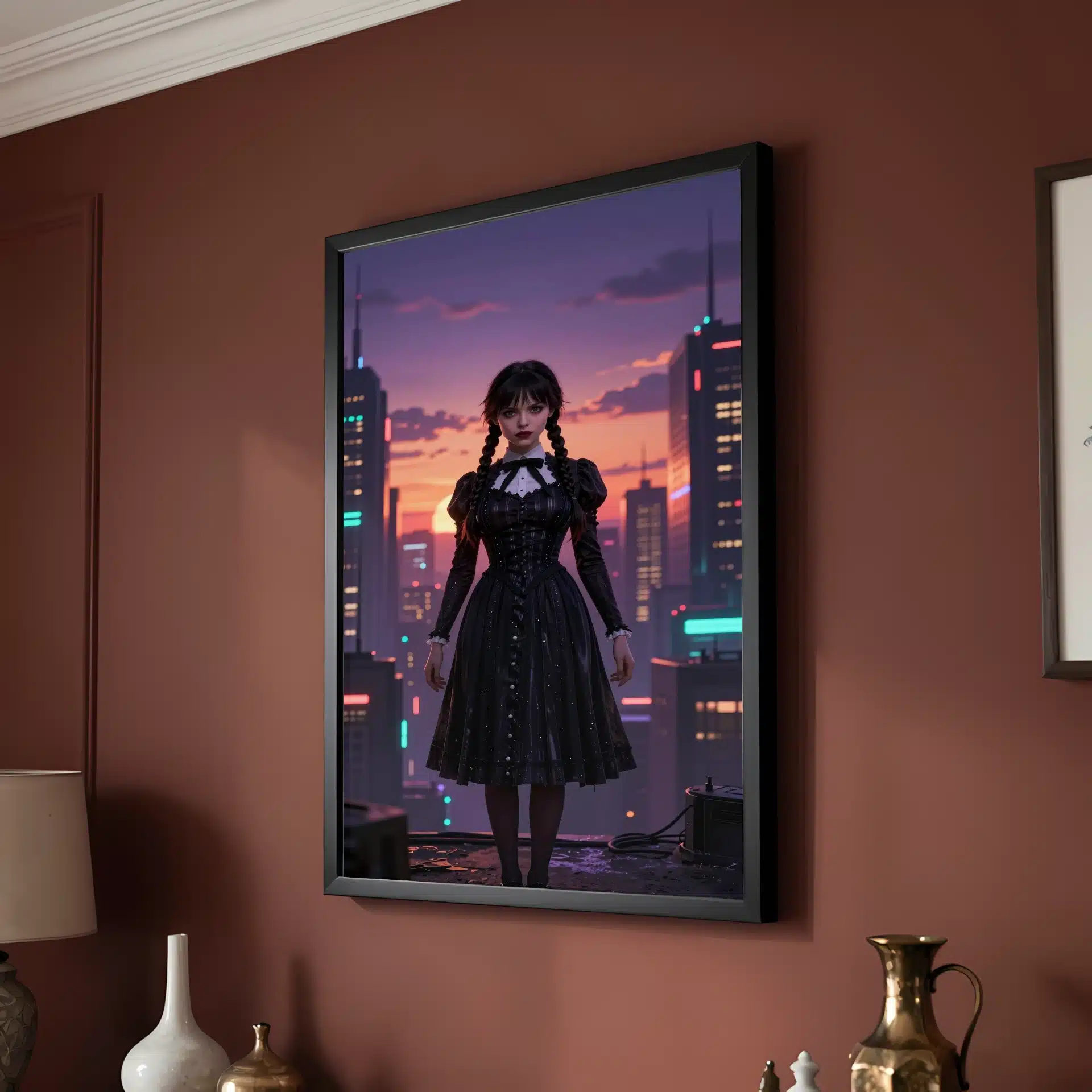 این قاب عکس از ونزدی آدامز در یک شهر سایبرپانک آیندهنگر طراحی شده است. او در غروب آفتاب بنفش و نارنجی ایستاده و نورپردازی دراماتیک، سیلوئت خیرهکنندهای از او ایجاد کرده است.