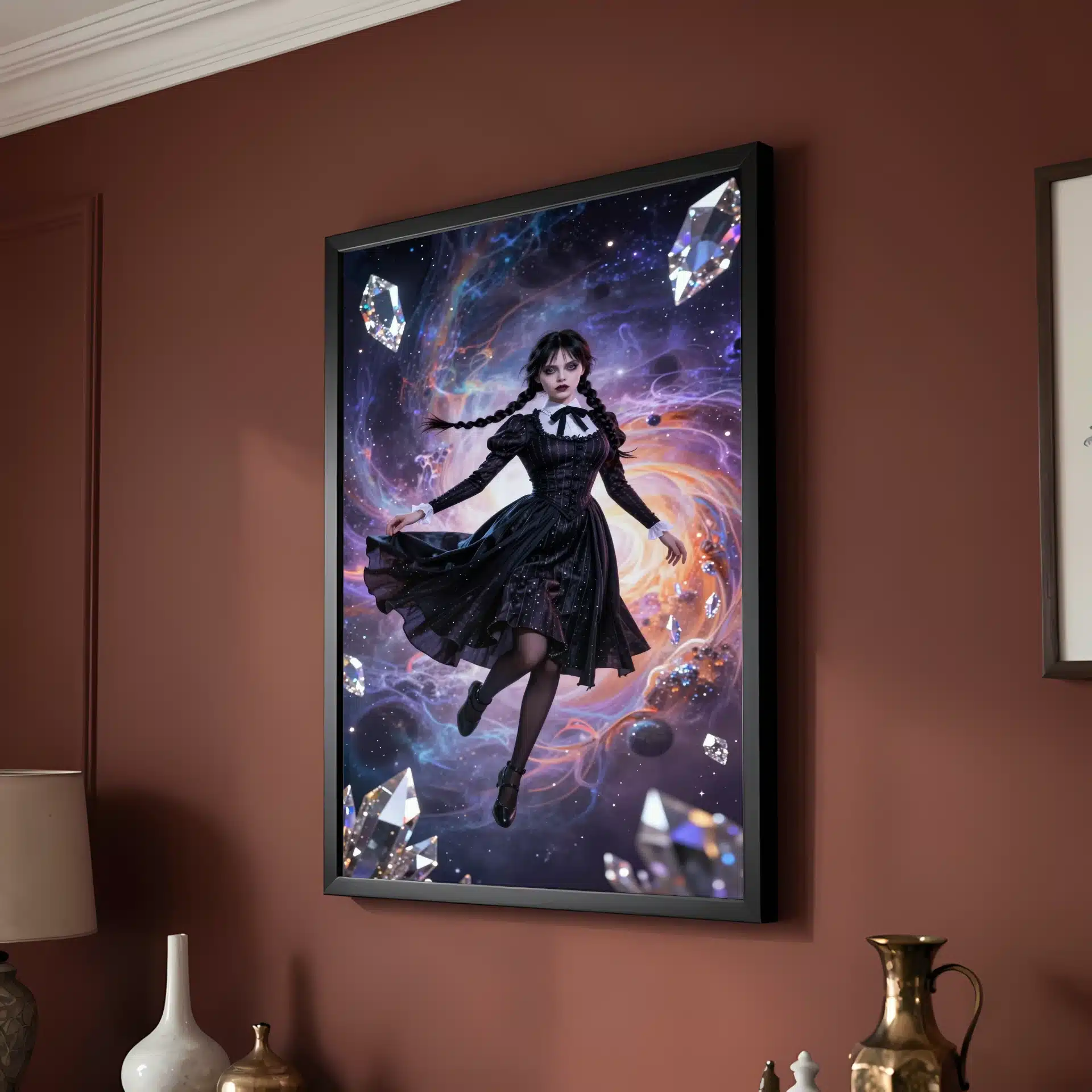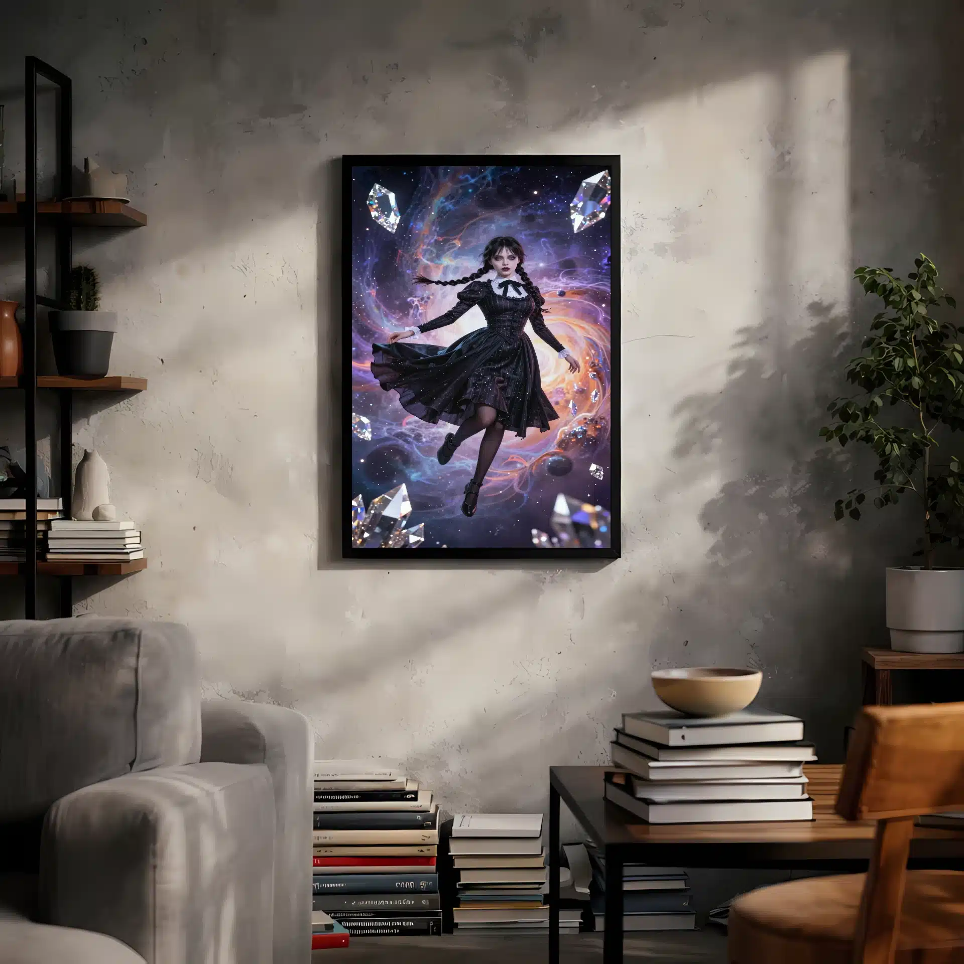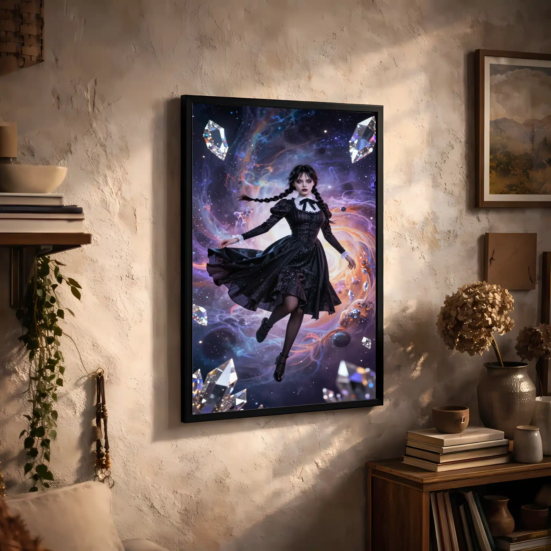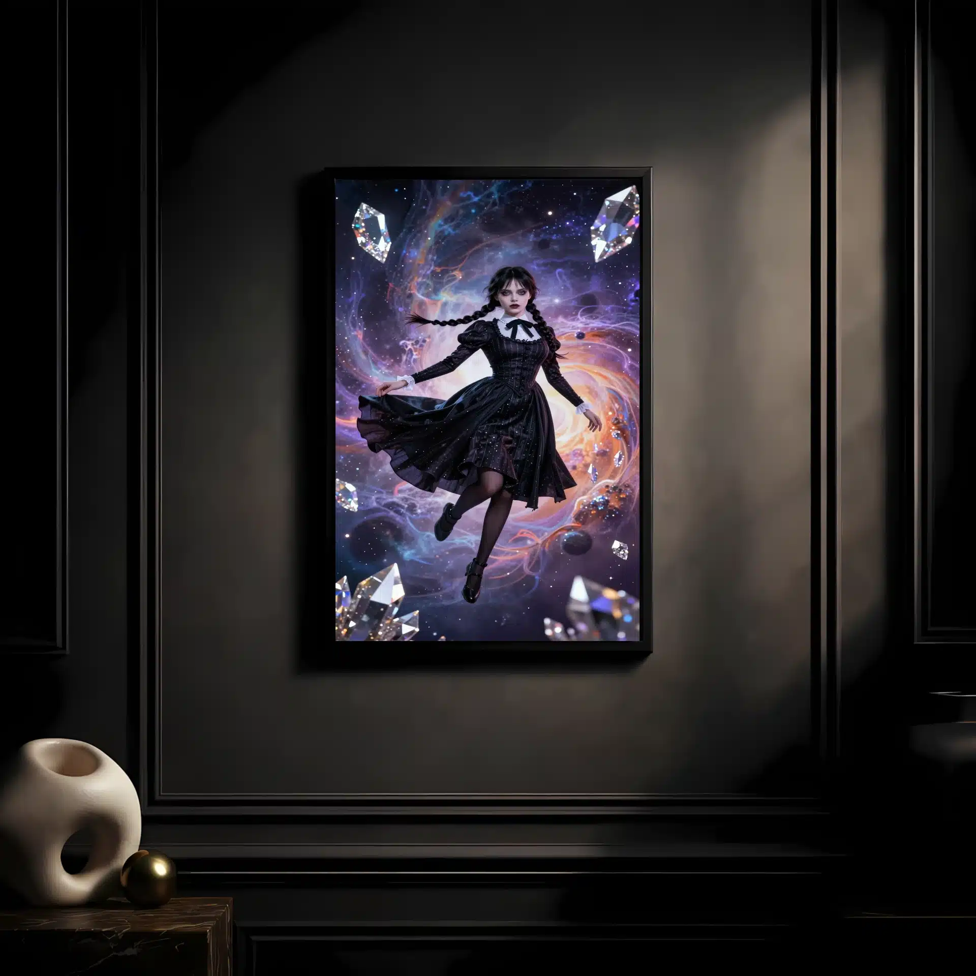 این قاب عکس از ونزدی آدامز، شخصیت محبوب سریال ‘ونزدی’، صحنهای خیرهکننده از او را در فضای بیکران به تصویر میکشد. ونزدی با لباس سیاه نمادین خود در میان کریستالهای ماهتاب شناور است و حالتی رویایی و فرازمینی را خلق میکند.