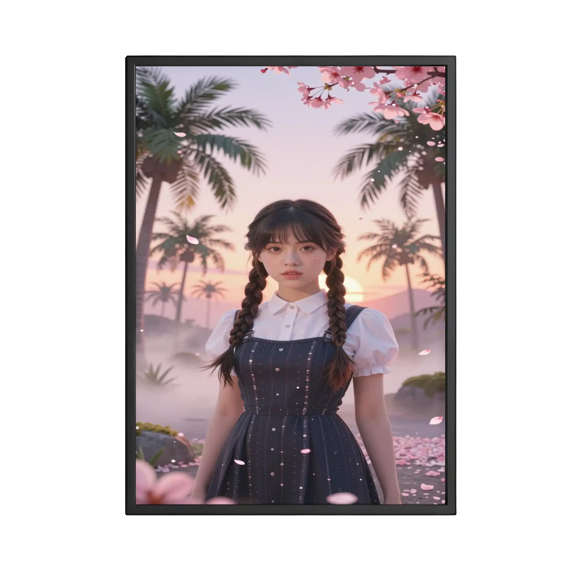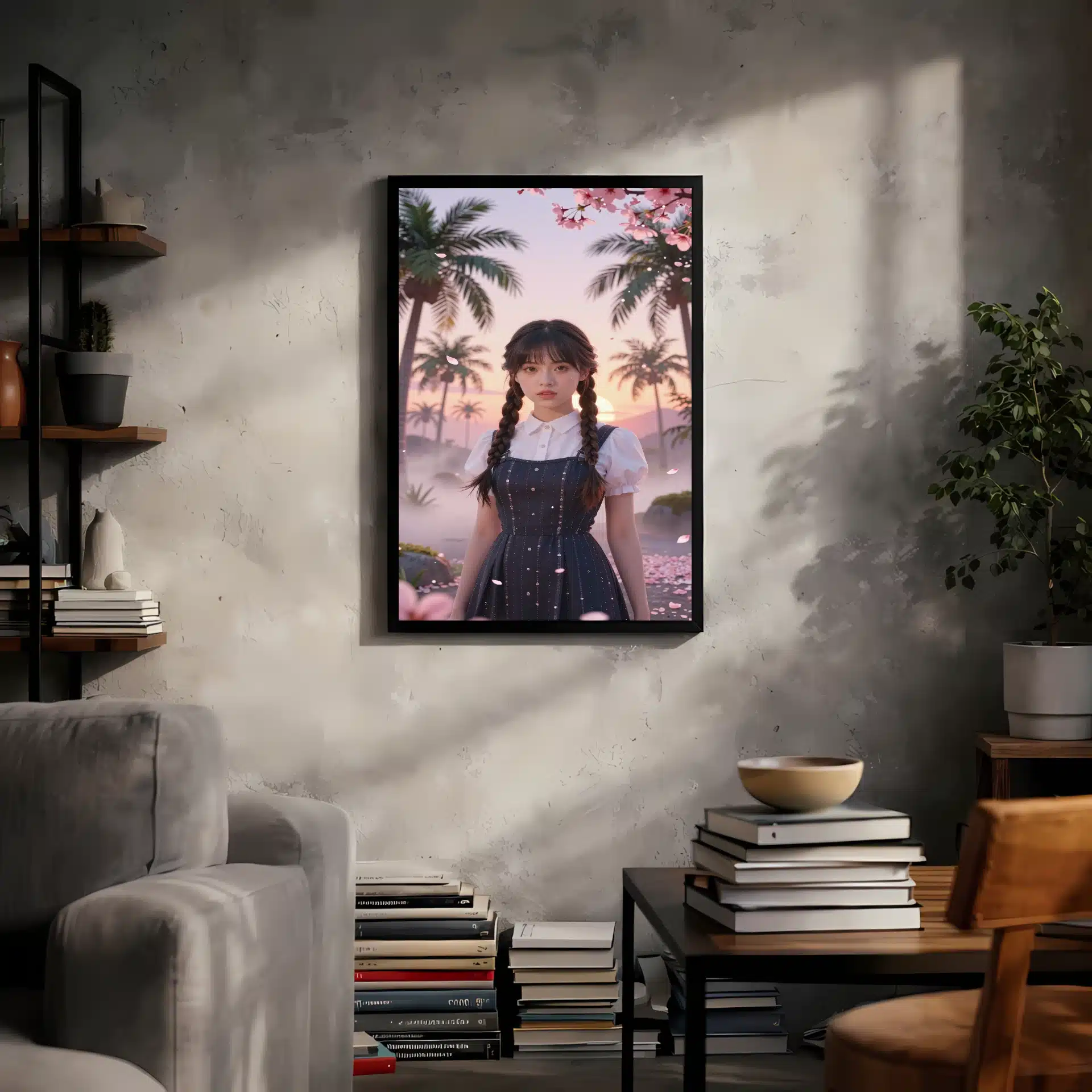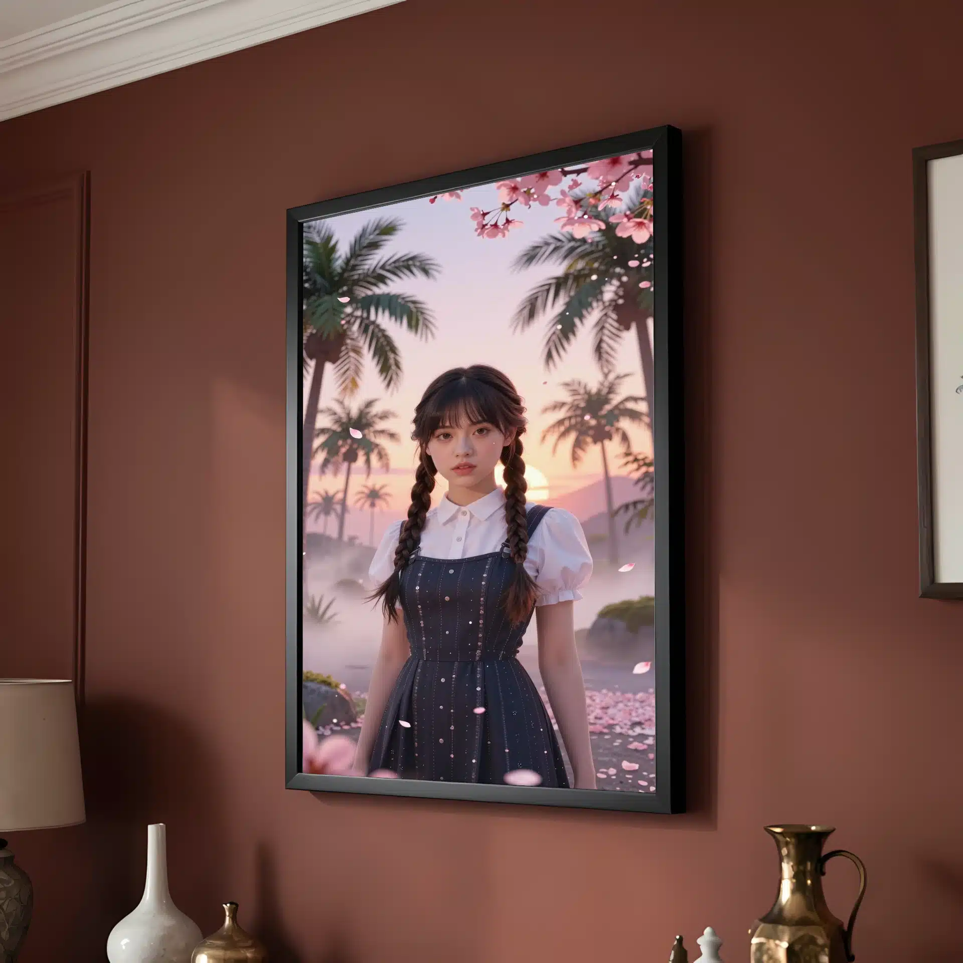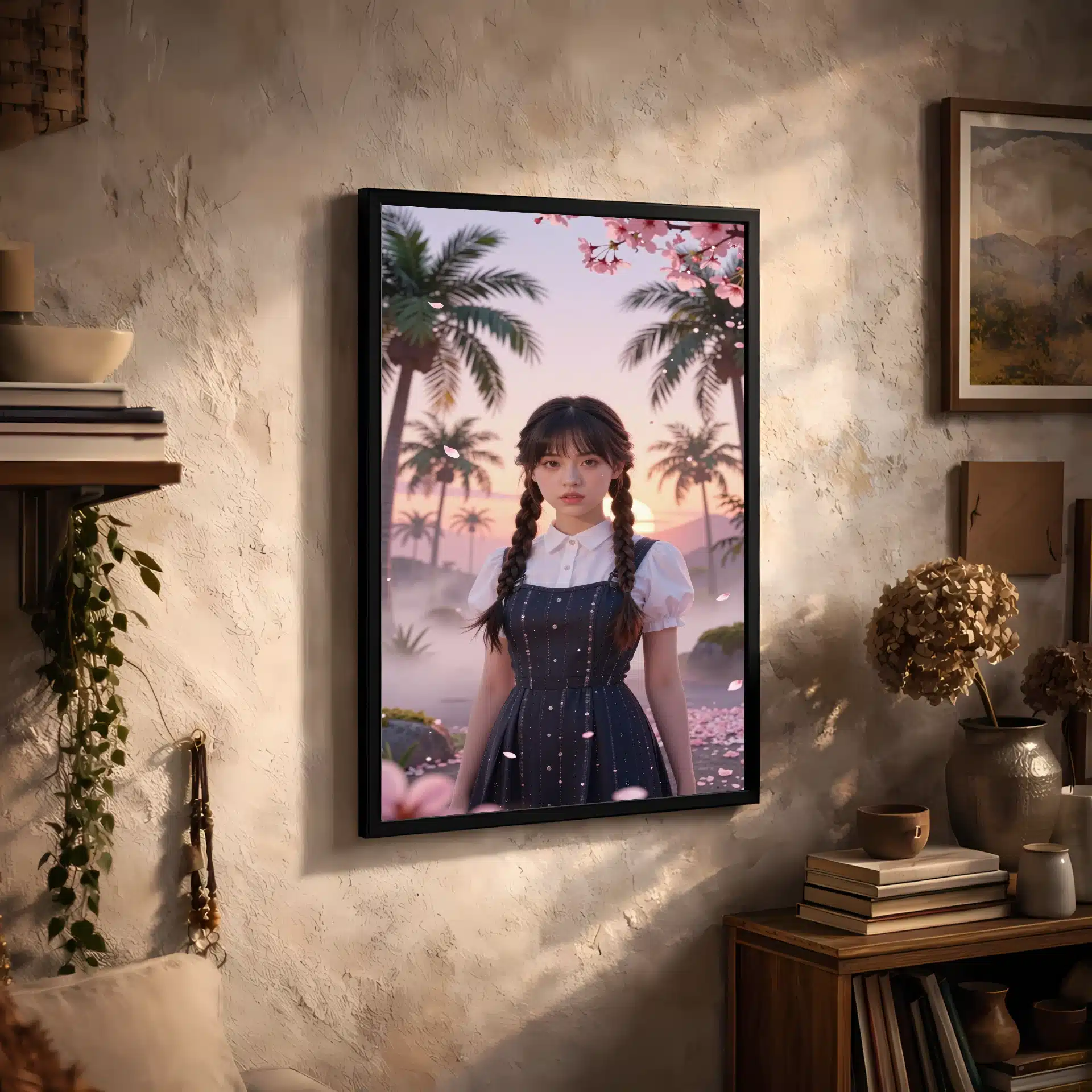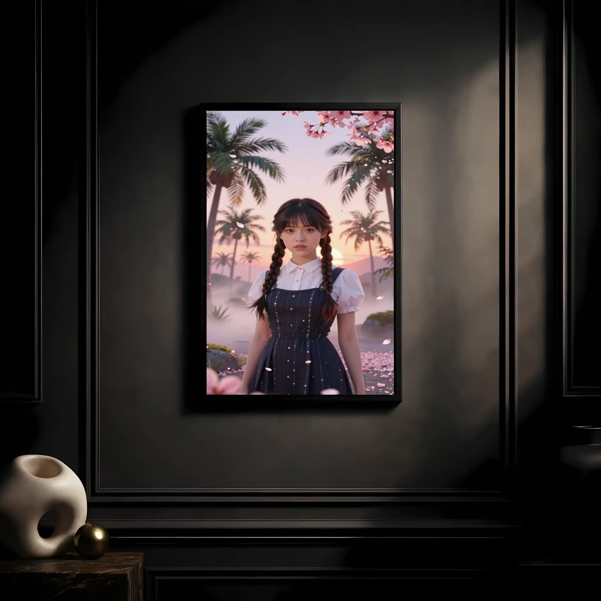 ونزدي در یک بهشت گرمسیری خیرهکننده به سبک انیمه، در میان منظرهای وسیع با نخلهای سرسبز و گلهای ساکورای رنگارنگ که در هوا شناورند، ایستاده است. نور مهآلود حجمی، درخششی رویایی ایجاد میکند که گرادیانهای نرم صورتی ساکورا و نارنجی غروب را در هم میآمیزد.