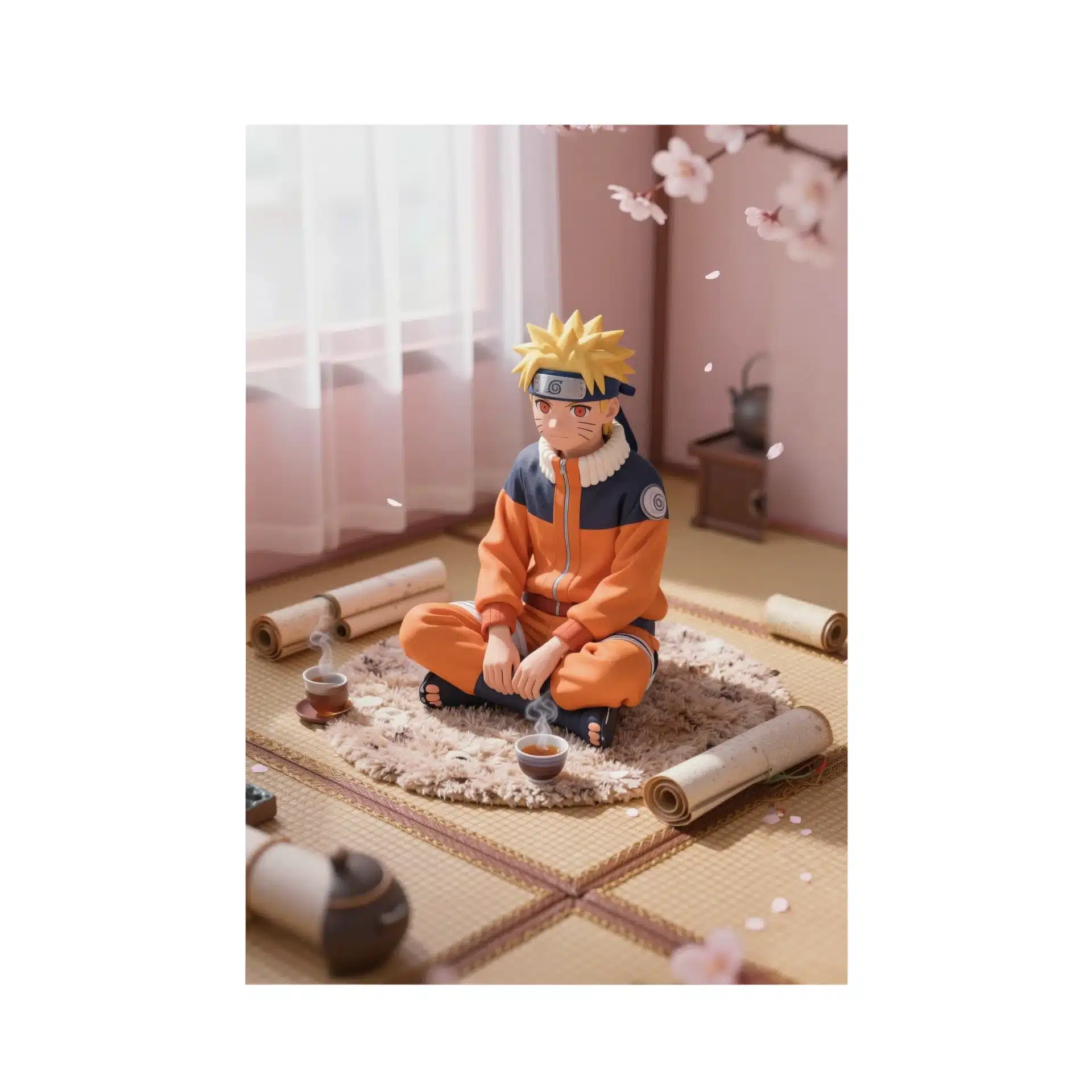 در این پوستر جذاب، ناروتو را در حالی میبینید که روی یک فرش نرم و بافتدار در اتاقی دنج و پرنور نشسته است. با وجود scrollهای پراکنده و یک فنجان چای داغ، این صحنه آرامشبخش، ترکیبی زیبا از دنیای نینجا و فضایی گرم و صمیمی را به نمایش میگذارد.