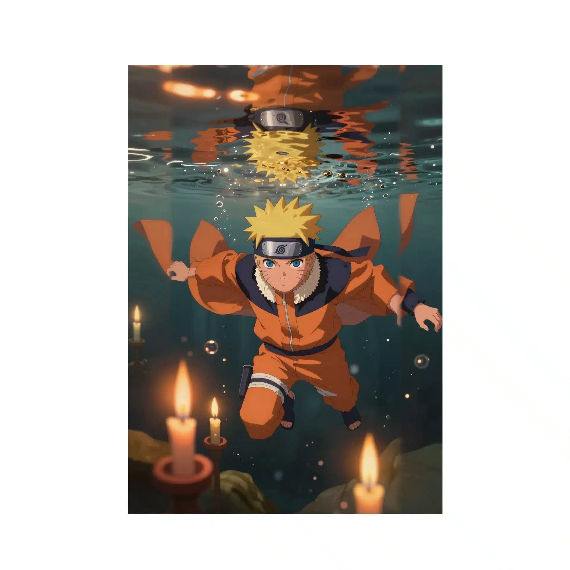 پوستر ناروتو شما را به دنیایی رویایی زیر آب میبرد، جایی که ناروتو اوزوماکی با حالتی مصمم در میان جریانهای آب شناور است. نور گرم شمعها که از سطح آب میتابد، فضایی پر از رنگهای نارنجی و طلایی خیرهکننده ایجاد کرده است.