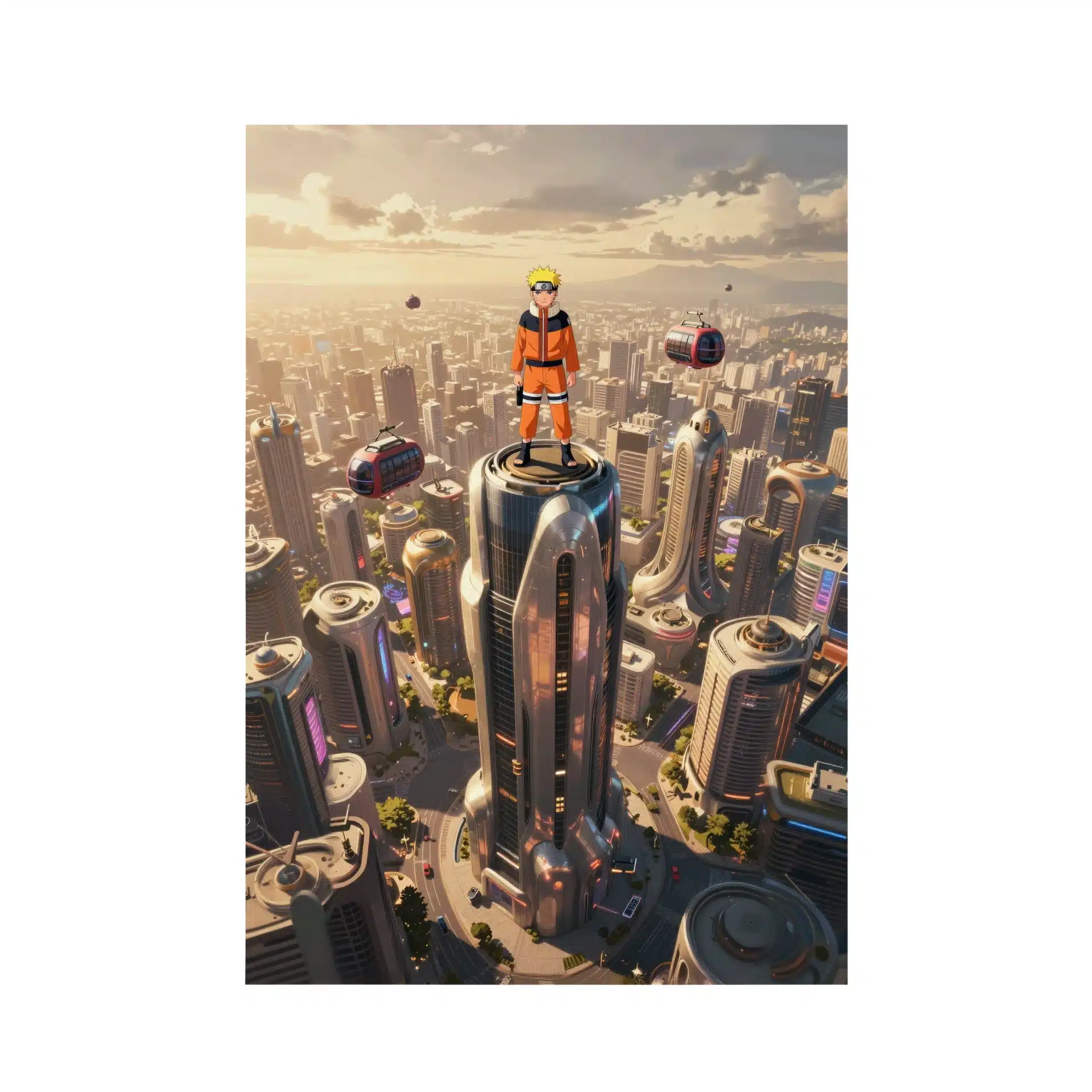 در این پوستر خیرهکننده، ناروتو بر فراز یک آسمانخراش مدرن و آیندهنگر ایستاده است، در حالی که شهر پرجنبوجوش زیر پایش با نورهای نئونی و معماری منحنیوار خودنمایی میکند. این تصویر با ترکیب انرژی پویای انیمه و نورپردازی جذاب، صحنهای خیالانگیز و الهامبخش خلق کرده است.