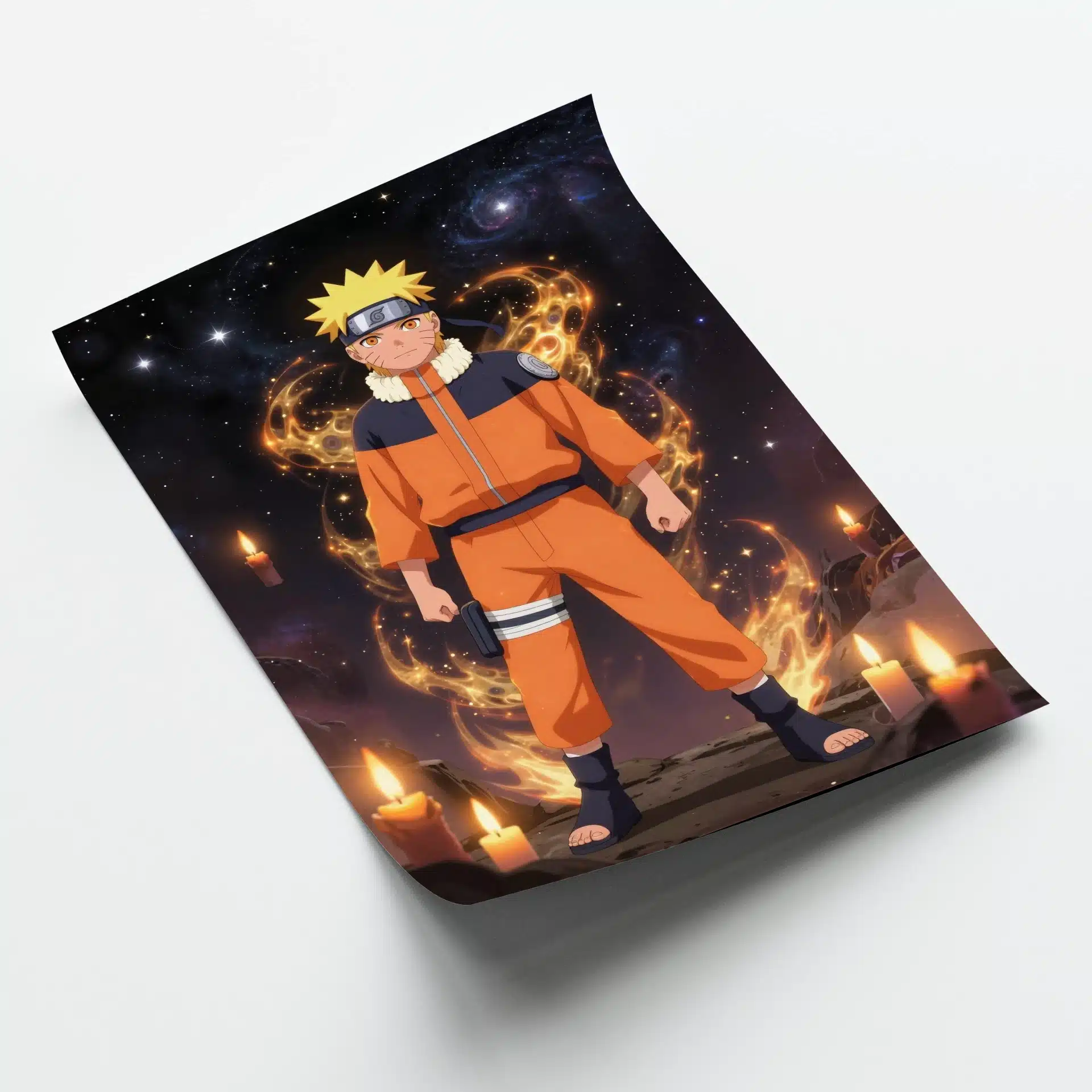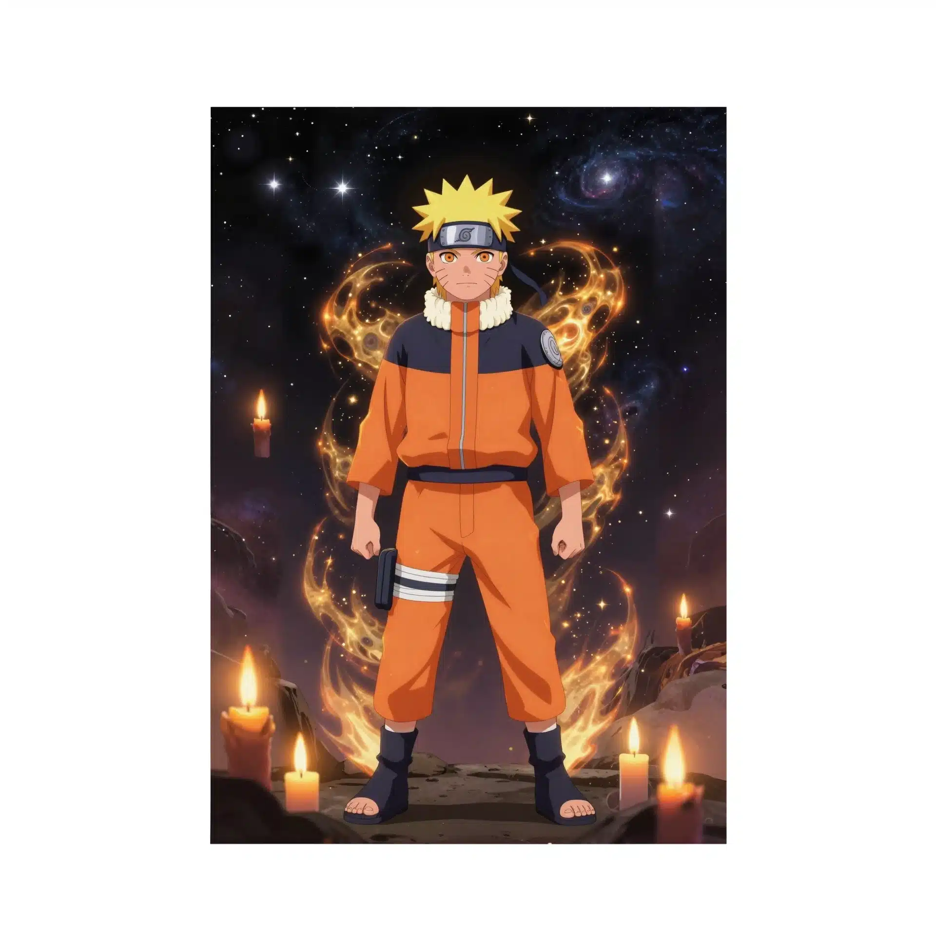 پوستر ناروتو شما را به دنیایی فراتر از زمین میبرد، جایی که ناروتو اوزوماکی با لباس نارنجی و سیاه معروفش در فضای بیکران ایستاده است. نور نئون و شمعهای شناور، انرژی چاکرا و جزئیات سرپوش او را در پسزمینهای رویایی از ستارگان و سحابیها برجسته میکنند.