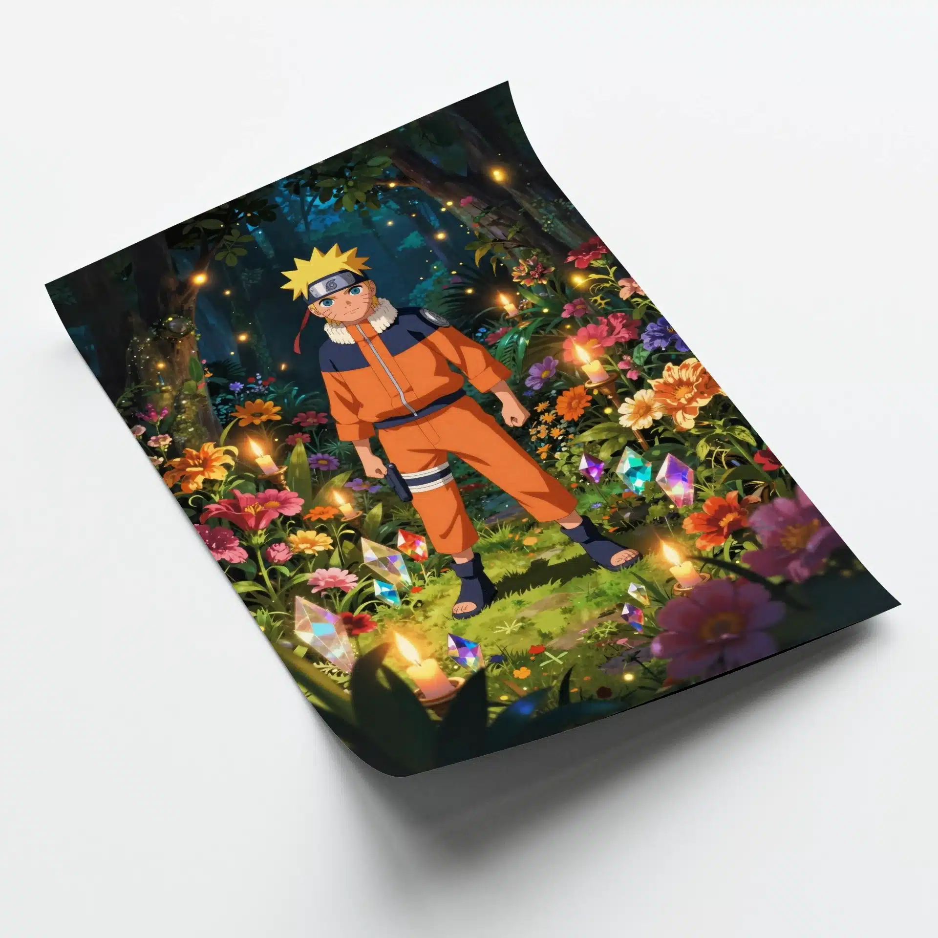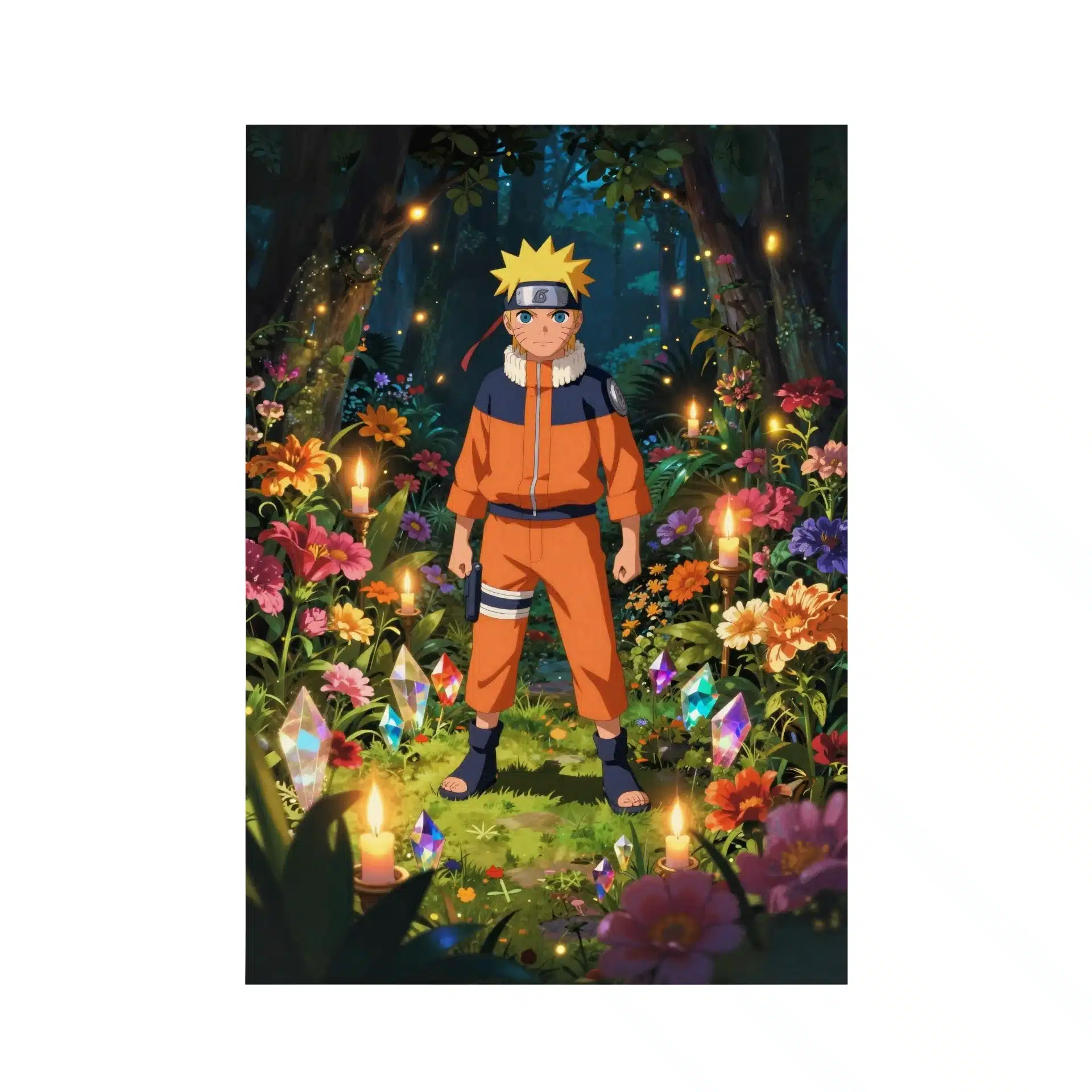 در این پوستر خیرهکننده، ناروتو در میان باغی اسرارآمیز و پر از نور شمعها ایستاده است. رنگهای زنده گلها و برگهای زمردین، همراه با سنگ قیمتی درخشان، فضایی رویایی و پرانرژی خلق کردهاند.
