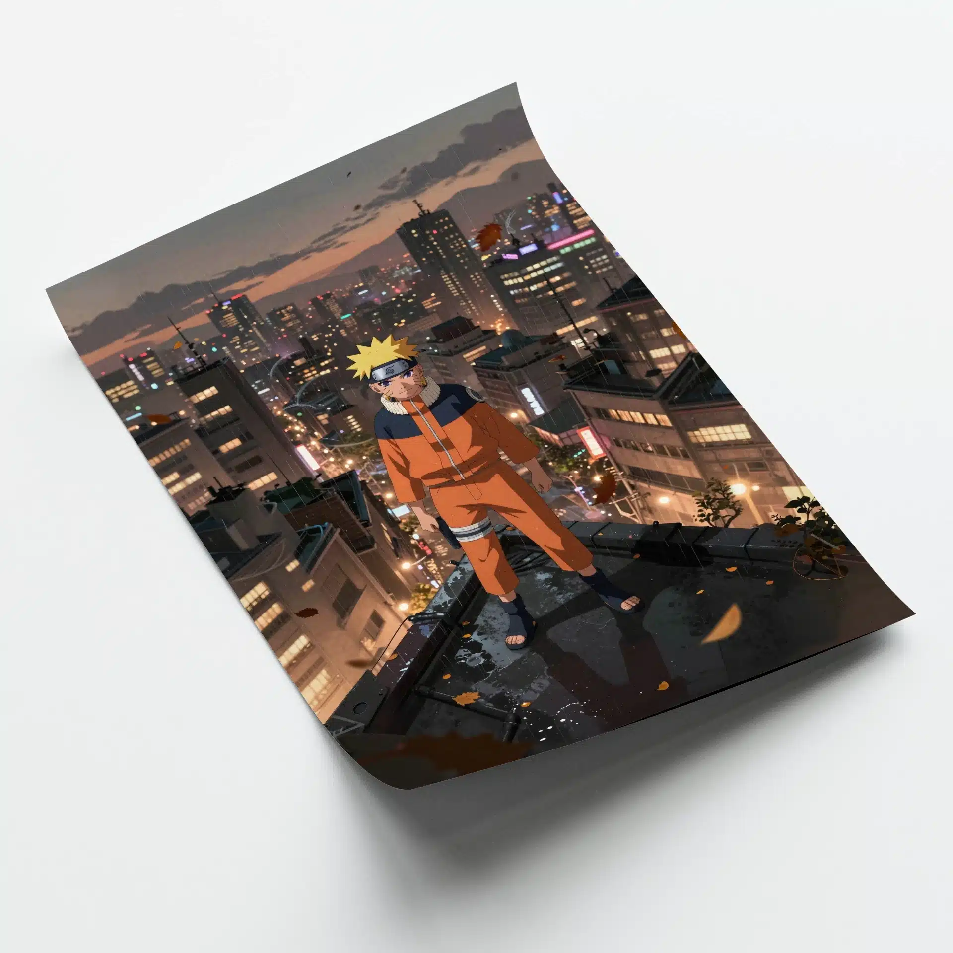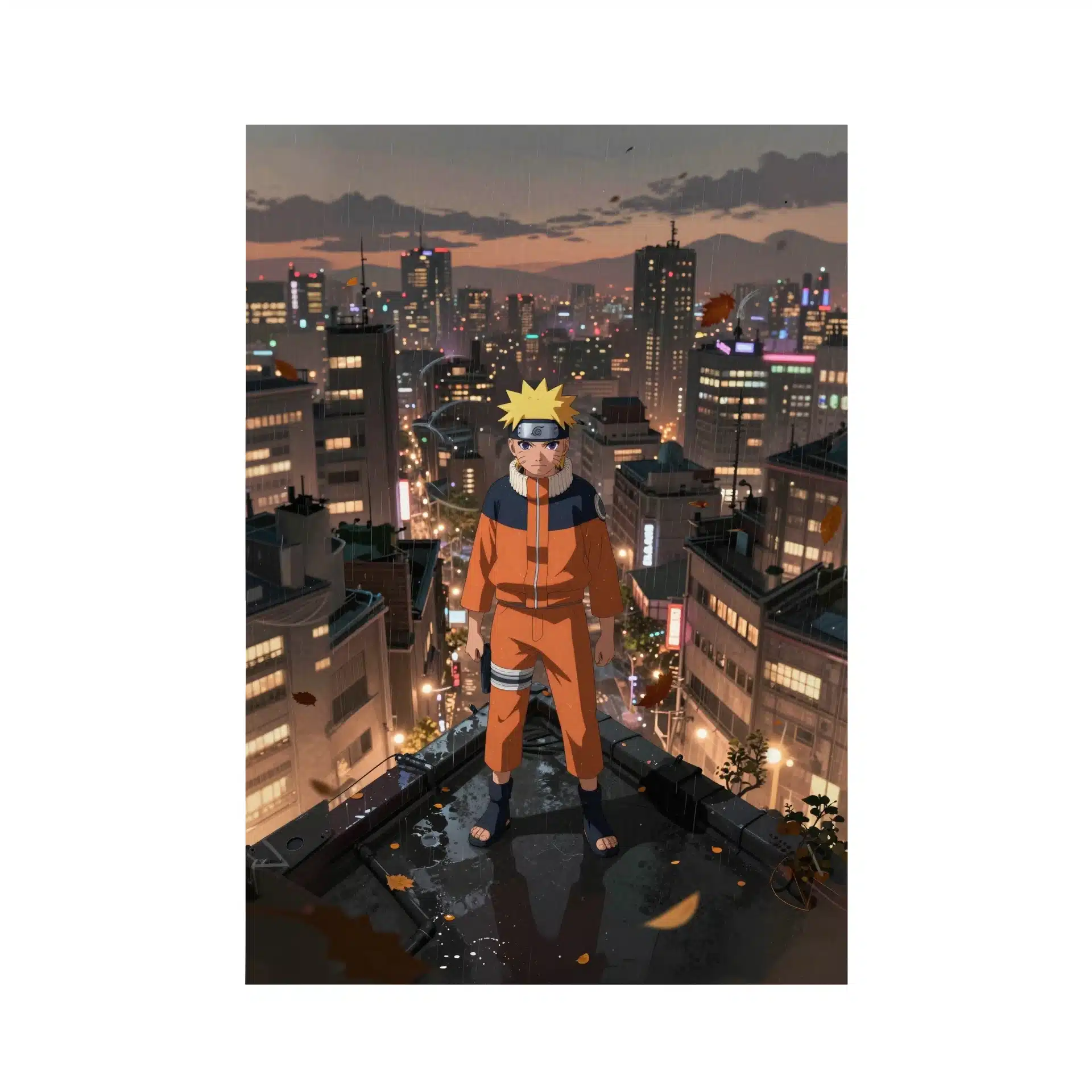 ناروتو بر فراز بامی در شهری گسترده و بارانی ایستاده است، در حالی که نور گرم چراغهای خیابان با رنگهای خاکی شهر در هم میآمیزد. چهرهی مصمم او در سایههای دراماتیک نور و برگهای پاییزی که در هوا میچرخند، حالتی از مقاومت و اندوهی ملانکولیک را به تصویر میکشد.