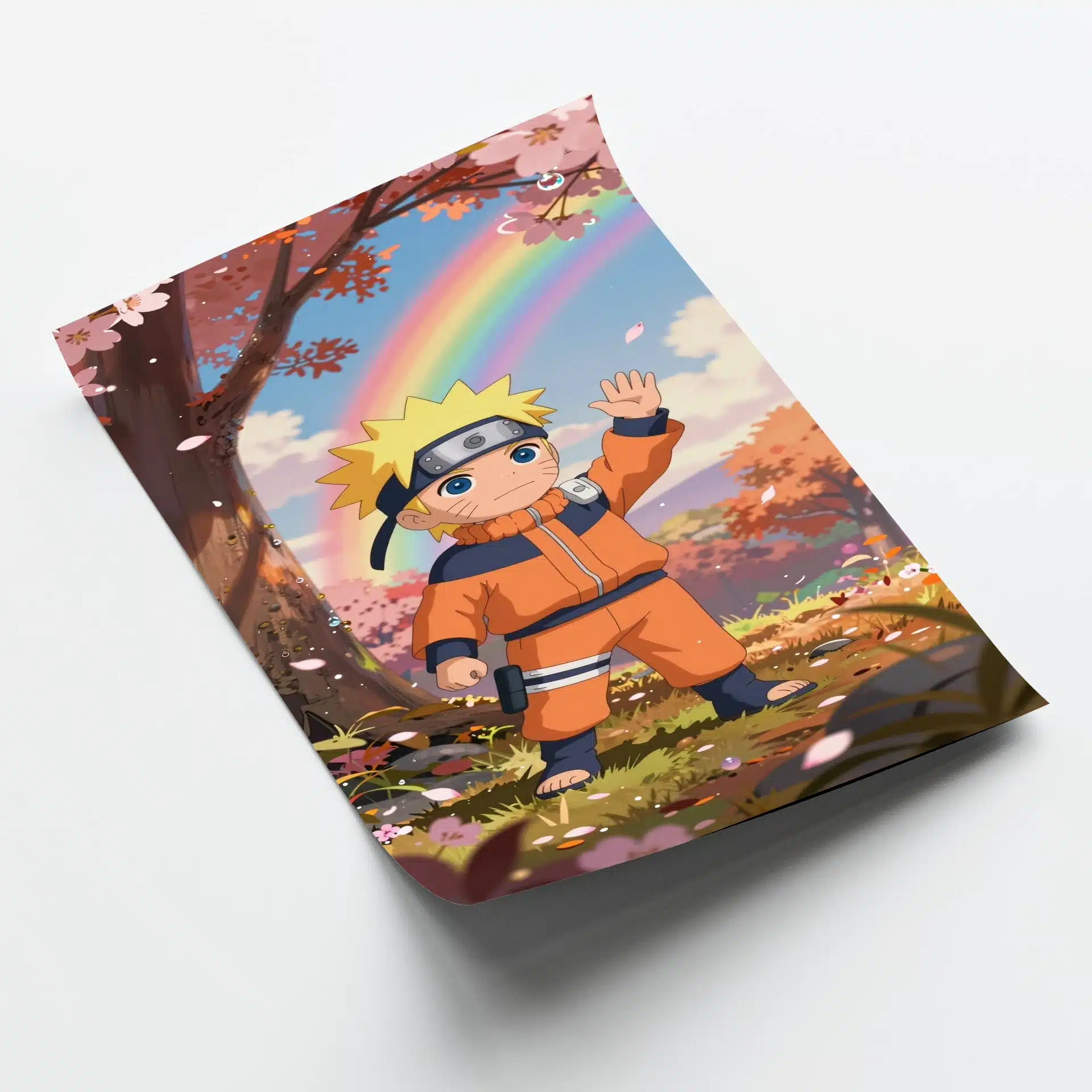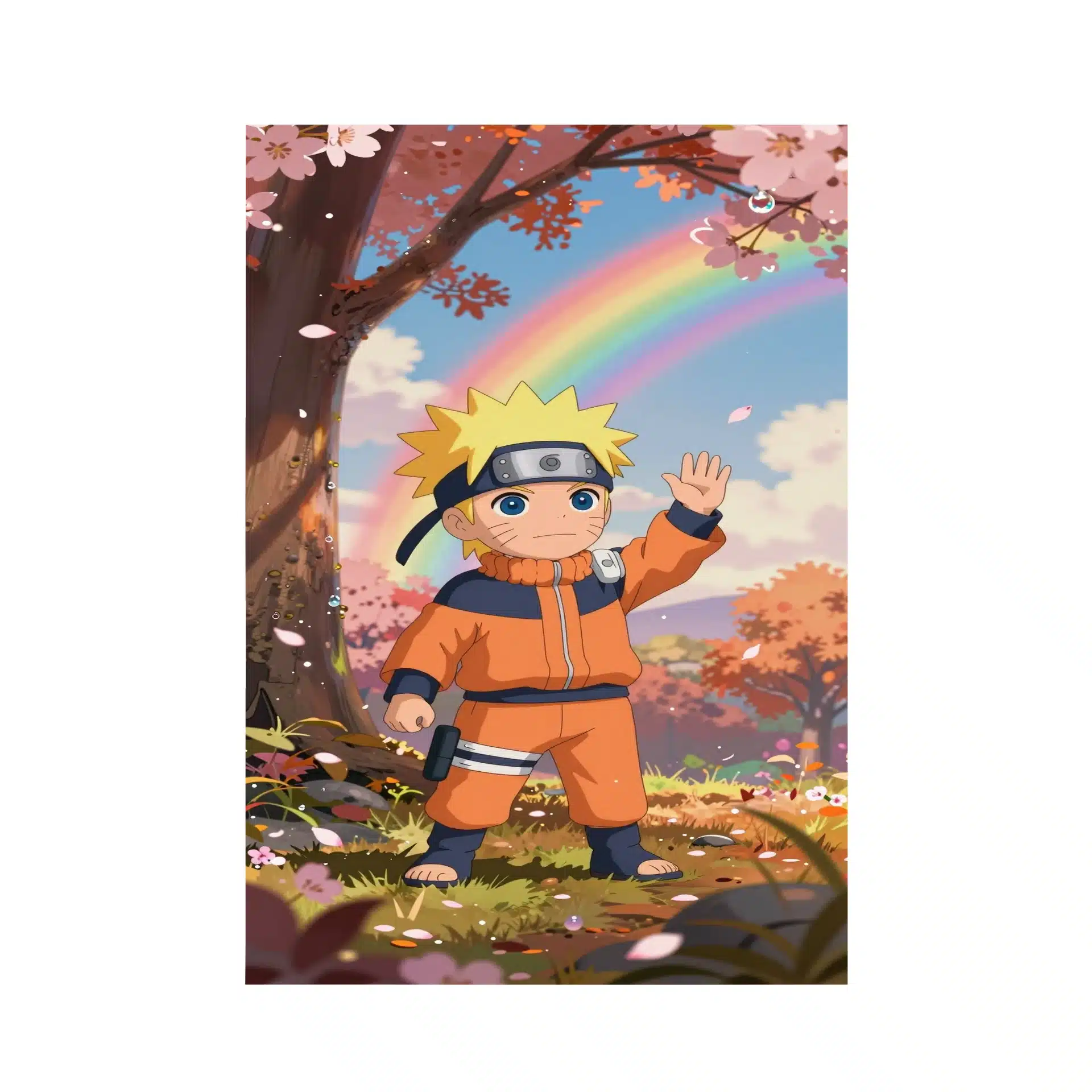 این پوستر خیرهکننده از ناروتو، با الهام از سبک استودیو جیبلی، صحنهای رویایی از یک باغ پاییزی را در نور طلایی غروب به تصویر میکشد. ناروتوی کوچک و دوستداشتنی با لباس نارنجی معروفش در میان گلهای گیلاس شناور، حالتی نوستالژیک و جادویی را خلق میکند.