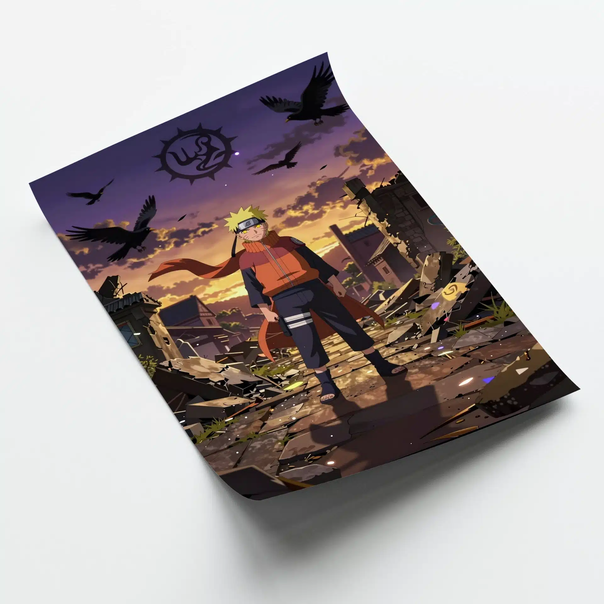 در این پوستر، ناروتو تنها در میان ویرانههای دهکده برگ پنهان ایستاده است، سایهاش بر روی سنگفرشهای شکسته کشیده شده و روسری نارنجی پارهپارهی جیرایا را محکم در دست گرفته است. آسمان با رنگهای بنفش پررنگ و طلایی مذاب میسوزد و کلاغهایی که به نشانههای قبیله اوزوماکی تبدیل میشوند در هوا شناور هستند.