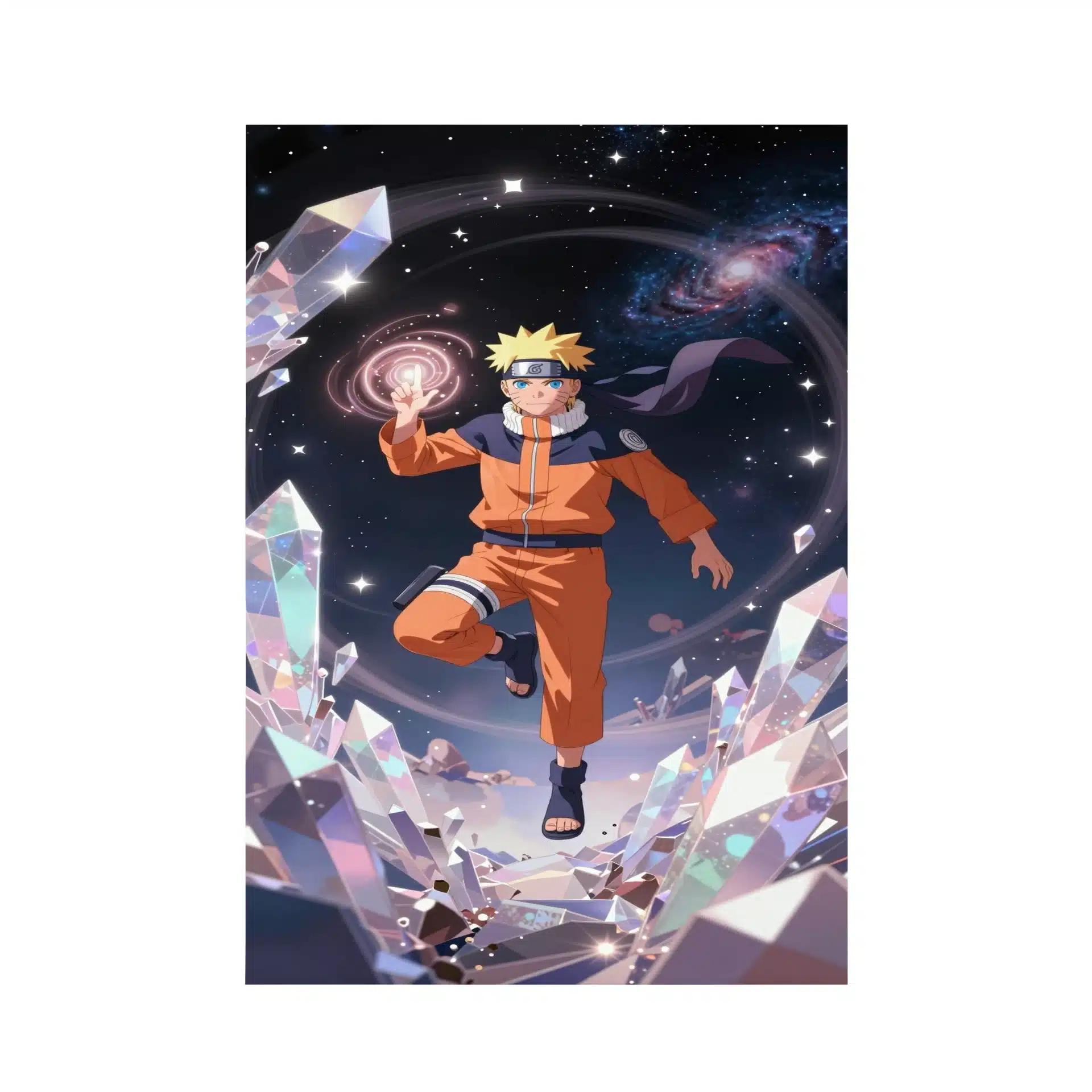 ناروتو اوزوماکی در فضای بیکران شناور است، در حالی که کریستالهای درخشان با رنگهای صورتی، بنفش و نعنایی او را احاطه کردهاند. این تصویر با نورپردازی سینمایی و انرژی چاکرای درخشان، ترکیبی از قدرت و آرامش را به نمایش میگذارد.