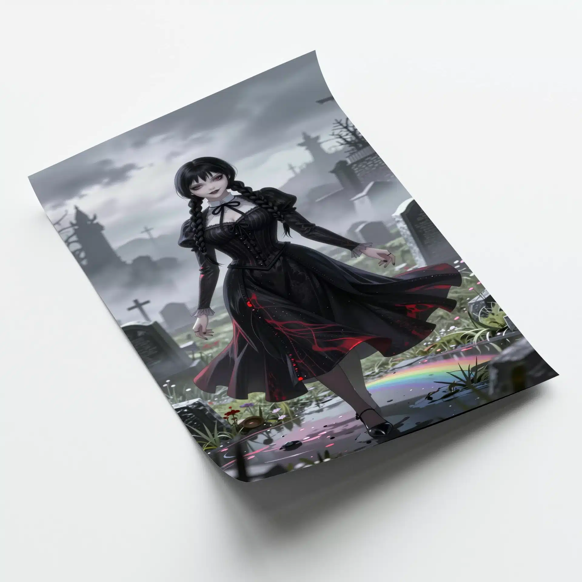 ونزدی آدامز در یک قبرستان مهآلود و وسیع زیر آسمانی ابری ایستاده است. لباس سیاه نمادین او با جلوههای قرمز اتری در حال حرکت است و انعکاسهای رنگینکمانی ظریف در گودالهای زیر پایش دیده میشود.
