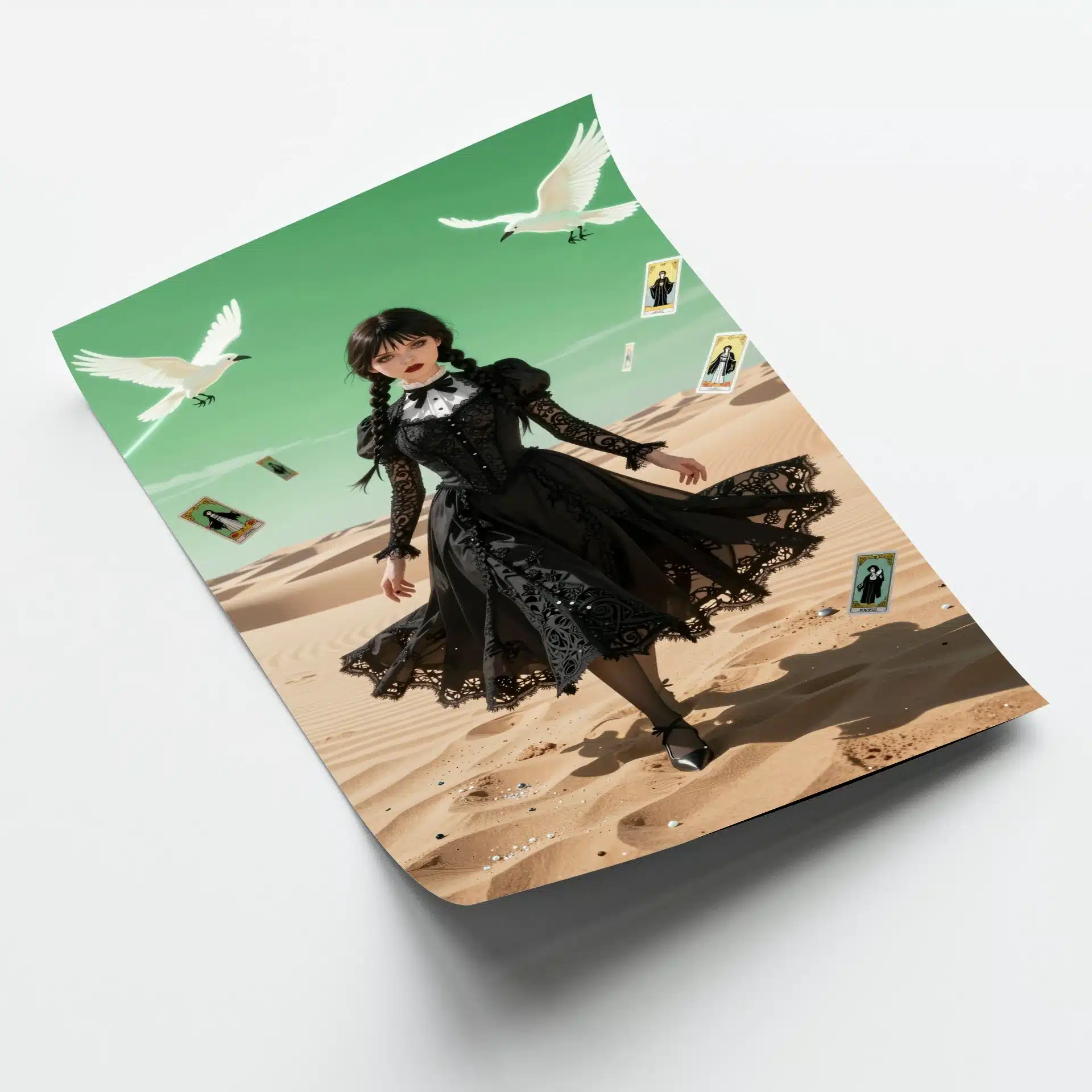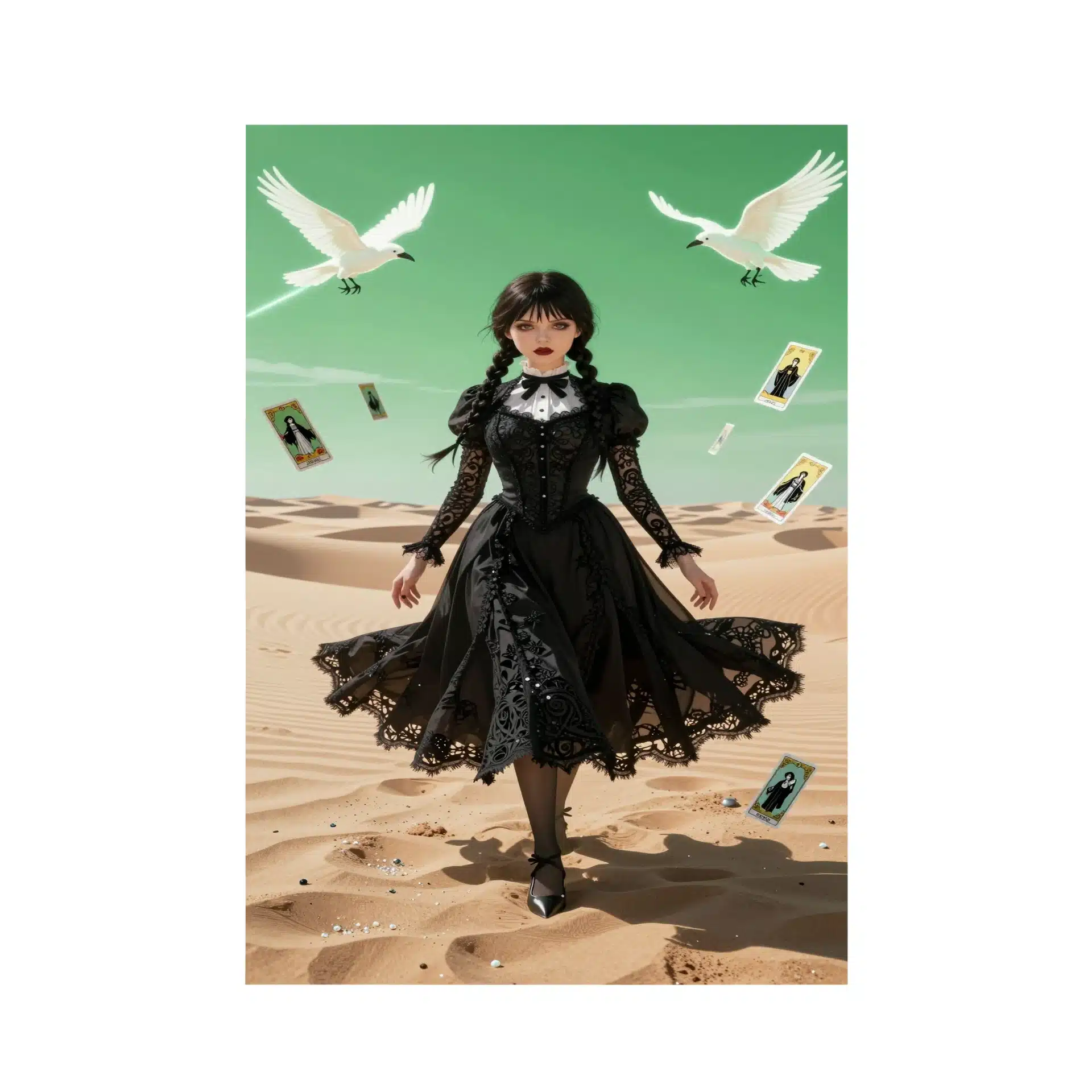 ونزدی با لباس سیاه نمادین خود، زیر نور شدید و جهتدار ایستاده است، در حالی که کارتهای تاروت شناور و کلاغهای سفید درخشان او را احاطه کردهاند. بیابان با تپههای ماسهای با جزئیات بالا و درخششی مرواریدگونه، همراه با افکت فیشآی، فضایی فراواقعی خلق کرده است.
