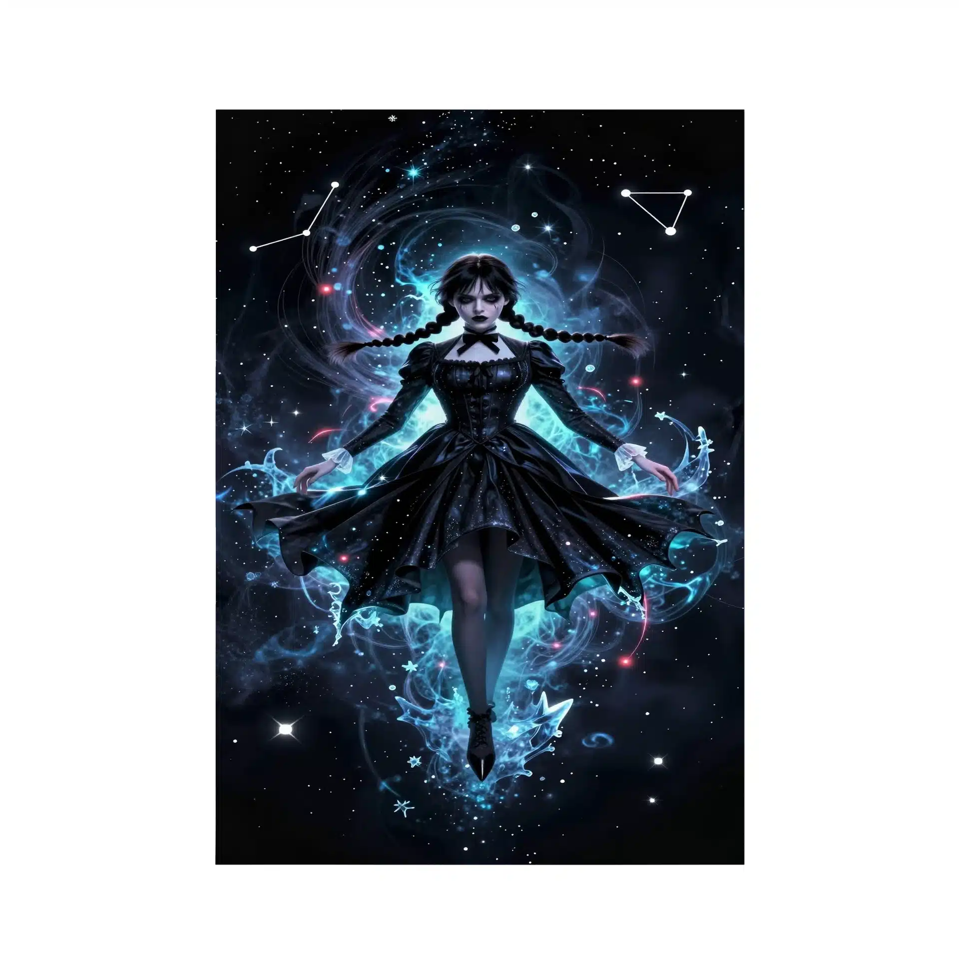 پوستر ‘ونزدی’ با الهام از شخصیت ونزدی آدامز، تصویری خیرهنده از او را در فضای یخی و بیکران فضا به نمایش میگذارد. این اثر با سبک انیمهای و نورپردازی خیرهکننده، ترکیبی از جذابیت گوتیک و شگفتیهای کیهانی را ارائه میدهد.